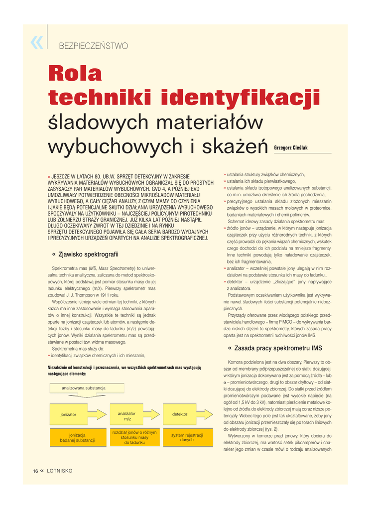 BEZPIECZEŃSTWO Rola techniki identyfikacji śladowych materiałów wybuchowych i skażeń Grzegorz Cieślak « JESZCZE W LATACH 80. UB.W. SPRZĘT DETEKCYJNY W ZAKRESIE WYKRYWANIA MATERIAŁÓW WYBUCHOWYCH OGRANICZAŁ SIĘ DO PROSTYCH ZASYSACZY PAR MATERIAŁÓW WYBUCHOWYCH. GVD 4, A PÓŹNIEJ EVD UMOŻLIWIAŁY POTWIERDZENIE OBECNOŚCI MIKROŚLADÓW MATERIAŁU WYBUCHOWEGO, A CAŁY CIĘŻAR ANALIZY, Z CZYM MAMY DO CZYNIENIA I JAKIE BĘDĄ POTENCJALNE SKUTKI DZIAŁANIA URZĄDZENIA WYBUCHOWEGO SPOCZYWAŁY NA UŻYTKOWNIKU – NAJCZĘŚCIEJ POLICYJNYM PIROTECHNIKU LUB ŻOŁNIERZU STRAŻY GRANICZNEJ. JUŻ KILKA LAT PÓŹNIEJ NASTĄPIŁ DŁUGO OCZEKIWANY ZWROT W TEJ DZIEDZINIE I NA RYNKU SPRZĘTU DETEKCYJNEGO POJAWIŁA SIĘ CAŁA SERIA BARDZO WYDAJNYCH I PRECYZYJNYCH URZĄDZEŃ OPARTYCH NA ANALIZIE SPEKTROGRAFICZNEJ. « » ustalania struktury związków chemicznych, » ustalania ich składu pierwiastkowego, » ustalania składu izotopowego analizowanych substancji, co m.in. umożliwia określenie ich źródła pochodzenia, » precyzyjnego ustalania składu złożonych mieszanin związków o wysokich masach molowych w proteomice, badaniach materiałowych i chemii polimerów. Schemat ideowy zasady działania spektrometru mas: » źródło jonów – urządzenie, w którym następuje jonizacja cząsteczek przy użyciu różnorodnych technik, z których część prowadzi do pękania wiązań chemicznych, wskutek czego dochodzi do ich podziału na mniejsze fragmenty. Zjawisko spektrografii Inne techniki powodują tylko naładowanie cząsteczek, bez ich fragmentowania, Spektrometria mas (MS, Mass Spectrometry) to uniwersalna technika analityczna, zaliczana do metod spektroskopowych, której podstawą jest pomiar stosunku masy do jej ładunku elektrycznego (m/z). Pierwszy spektrometr mas zbudował J. J. Thompson w 1911 roku. Współcześnie istnieje wiele odmian tej techniki, z których każda ma inne zastosowanie i wymaga stosowania apara- » analizator – wcześniej powstałe jony ulegają w nim roz- działowi na podstawie stosunku ich masy do ładunku,. » detektor – urządzenie „zliczające” jony napływające z analizatora. Podstawowym oczekiwaniem użytkownika jest wykrywanie nawet śladowych ilości substancji potencjalnie niebezpiecznych. tów o innej konstrukcji. Wszystkie te techniki są jednak Przyrządy oferowane przez wiodącego polskiego przed- oparte na jonizacji cząsteczek lub atomów, a następnie de- stawiciela handlowego – firmę PIMCO – do wykrywania bar- tekcji liczby i stosunku masy do ładunku (m/z) powstają- dzo niskich stężeń to spektrometry, których zasada pracy cych jonów. Wyniki działania spektrometru mas są przed- oparta jest na spektrometrii ruchliwości jonów IMS. stawiane w postaci tzw. widma masowego. Spektrometria mas służy do: « Zasada pracy spektrometru IMS » identyfikacji związków chemicznych i ich mieszanin, Komora podzielona jest na dwa obszary. Pierwszy to obNiezależnie od konstrukcji i przeznaczenia, we wszystkich spektrometrach mas występują następujące elementy: szar od membrany półprzepuszczalnej do siatki dozującej, w którym jonizacja dokonywana jest za pomocą źródła – lub α – promieniotwórczego, drugi to obszar dryftowy – od siatki dozującej do elektrody zbiorczej. Do siatki przed źródłem promieniotwórczym podawane jest wysokie napięcie (na ogół od 1,5 kV do 3 kV), natomiast pierścienie metalowe kolejno od źródła do elektrody zbiorczej mają coraz niższe potencjały. Wobec tego pole jest tak ukształtowane, żeby jony od obszaru jonizacji przemieszczały się po torach liniowych do elektrody zbiorczej (rys. 2). Wytworzony w komorze prąd jonowy, który dociera do elektrody zbiorczej, ma wartość setek pikoamperów i charakter jego zmian w czasie mówi o rodzaju analizowanych 16 « LOTNISKO BEZPIECZEŃSTWO Membrana półprzepuszczalna Siatka dozująca Źródlo promieniotwórcze Otóż, przede wszystkim pozwolił przenieść ciężar ustalenia, czy mamy do czynienia z materiałem wybuchowym, z czynności neutralizacyjnych, a więc zastrzeżonych dla po- Elektroda zbiorcza licji i służb specjalnych, do czynności rozpoznawczych – Analizowany gaz nienarażających na bezpośredni kontakt z przedmiotem potencjalnie niebezpiecznym. Wygenerował się więc nowy, możliwy do zastosowania, algorytm działania, eliminujący tzw. ewakuacje prewencyjne. Oczywiście, w przypadku wielu sygnałów o zagrożeniu, np. podniesienia stanu gotowości do odparcia zamachów na danym obszarze, telefonicznego powiadomienia o podłożeniu ładunku i ujawnieniu nie- Gaz nośny Pierścienie metalowe zidentyfikowanego bagażu – lepiej dmuchać na zimne. Nie- Gaz nośny mniej jednak w większości incydentów mamy do czynienia z sytuacją, którą można określić mianem „braku wyobraźni” Rys. 1. Schemat konstrukcji spektrometru ruchliwości jonów pasażera. Nie polemizuję tu bynajmniej z koniecznością wysubstancji. Rejestrowane spektrogramy są poddawane znaczenia strefy „bezpieczeństwa”, ale jej rozmiar powinien analizie numerycznej i zostają określone analizowane sub- uniemożliwić podjęcie bagażu bez ewidencji tego faktu, kie- stancje. dy już rozpoczęto pierwsze czynności, oraz powinien nie Obszary zastosowań: » wykrywanie dopuścić do działań nieodpowiedzialnych, takich jak prze- skażeń bojowymi substancjami trującymi mieszczanie niezidentyfikowanego bagażu, otwieranie go (np. urządzenia CAM, GID-3 itp.), przez osoby nieuprawnione. Sama nazwa „strefy bezpiecz- » wykrywanie materiałów wybuchowych i narkotyków. nej” lub bezpieczeństwa jest myląca, gdyż sugeruje jakoby Wykrywanie śladów narkotyków czy materiałów wybu- 20–30-metrowy rejon wokół takiego obiektu gwarantował chowych polega na pobraniu próbki na specjalne filtry, a na- bezpieczeństwo osobom znajdującym się dalej, ale w dal- stępnie przeprowadzaniu jej do postaci par i poddaniu ana- szym ciągu w te