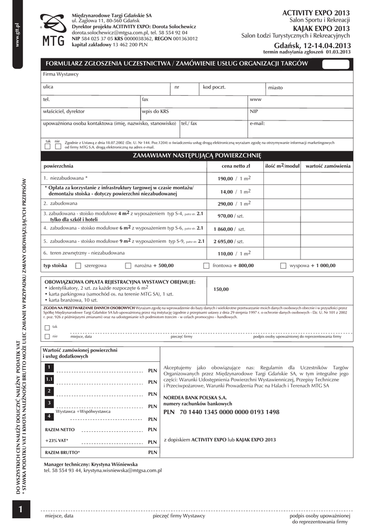 ACTIVITY EXPO 2013 www.gtt.pl Międzynarodowe Targi Gdańskie SA ul. Żaglowa 11, 80-560 Gdańsk Dyrektor projektu ACITIVITY EXPO: Dorota Solochewicz [email protected], tel. 58 554 92 04 NIP 584 025 37 05 KRS 0000038362, REGON 001363012 kapitał zakładowy 13 462 200 PLN Salon Sportu i Rekreacji KAJAK EXPO 2013 Salon Łodzi Turystycznych i Rekreacyjnych Gdańsk, 12-14.04.2013 termin nadsyłania zgłoszeń 01.03.2013 FORMULARZ ZGŁOSZENIA UCZESTNICTWA / ZAMÓWIENIE USŁUG ORGANIZACJI TARGÓW Firma Wystawcy ulica nr kod poczt. miasto tel. fax www właściciel, dyrektor wpis do KRS NIP e-mail: upoważniona osoba kontaktowa (imię, nazwisko, stanowisko) tel./ fax tak nie Zgodnie z Ustawą z dnia 18.07.2002 (Dz. U. Nr 144. Poz.1204) o świadczeniu usług drogą elektroniczną wyrażam zgodę na otrzymywanie informacji marketingowych od firmy MTG S.A. drogą elektroniczną na adres e-mail. ZAMAWIAMY NASTĘPUJĄCĄ POWIERZCHNIĘ DO WSZYSTKICH CEN NALEŻY DOLICZYĆ NALEŻNY PODATEK VAT * STAWKA PODATKU VAT I KWOTA NALEŻNOŚCI BRUTTO MOŻE ULEC ZMIANIE W PRZYPADKU ZMIANY OBOWIĄZUJĄCYCH PRZEPISÓW powierzchnia 1 wartość zamówienia 190,00 / 1 m2 1. niezabudowana * * Opłata za korzystanie z infrastruktury targowej w czasie montażu/ demontażu stoiska - dotyczy powierzchni niezabudowanej 14,00 / 1 m2 290,00 / 1 m2 2. zabudowana 3. zabudowana - stoisko modułowe 4 m2 z wyposażeniem typ S-4, patrz str. 2.1 tylko dla szkół i hoteli 4. zabudowana - stoisko modułowe 6 m2 z wyposażeniem typ S-6, patrz str. 2.1 1 860,00 / szt. 5. zabudowana - stoisko modułowe 9 m2 z wyposażeniem typ S-9, patrz str. 2.1 2 695,00 / szt. szeregowa 970,00 / szt. 110,00 / 1 m2 6. teren zewnętrzny - niezabudowana typ stoiska ilość m2/moduł cena netto zł narożna + 500,00 OBOWIĄZKOWA OPŁATA REJESTRACYJNA WYSTAWCY OBEJMUJE: • identyfikatory, 2 szt. za każde rozpoczęte 6 m2 • karta parkingowa (samochód os. na terenie MTG SA), 1 szt. • karta branżowa, 10 szt. frontowa + 800,00 wyspowa + 1 000,00 150,00 ZGODA NA PRZETWARZANIE DANYCH OSOBOWYCH Wyrażam zgodę na wprowadzenie do bazy danych i wielokrotne przetwarzanie moich danych osobowych obecnie i w przyszłości przez Spółkę Międzynarodowe Targi Gdańskie SA lub upoważnioną przez nią instytucję (zgodnie z przepisami ustawy z dnia 29 sierpnia 1997 r. o ochronie danych osobowych - Dz. U. Nr 101 z 2002 r. poz. 926 z późniejszymi zmianami) oraz na udostępnianie ich podmiotom trzecim - w celach promocyjno - handlowych. tak nie miejsce, data pieczęć firmy podpis osoby upoważnionej do reprezentowania firmy Wartość zamówionej powierzchni i usług dodatkowych 1 PLN 1.1 PLN 2 PLN 3 4 Wystawca +Współwystawca PLN PLN RAZEM NETTO PLN +23% VAT* PLN RAZEM BRUTTO* PLN Akceptujemy jako obowiązujące nas: Regulamin dla Uczestników Targów Organizowanych przez Międzynarodowe Targi Gdańskie SA, w tym integralne jego części: Warunki Udostępnienia Powierzchni Wystawienniczej, Przepisy Techniczne i Przeciwpożarowe, Warunki Prowadzenia Prac na Halach i Terenach MTG SA NORDEA BANK POLSKA S.A. numery rachunków bankowych PLN 70 1440 1345 0000 0000 0193 1498 z dopiskiem ACTIVITY EXPO lub KAJAK EXPO 2013 Manager techniczny: Krystyna Wiśniewska tel. 58 554 93 44, [email protected] miejsce, data pieczęć firmy Wystawcy podpis osoby upoważnionej do reprezentowania firmy ACTIVITY EXPO 2013 Salon Sportu i Rekreacji www.gtt.pl Międzynarodowe Targi Gdańskie SA ul. Żaglowa 11, 80-560 Gdańsk ACITIVITY EXPO: Dorota Solochewicz [email protected], tel. 58 554 92 04 NIP 584 025 37 05 KRS 0000038362, REGON 001363012 kapitał zakładowy 13 462 200 PLN KAJAK EXPO 2013 Salon Łodzi Turystycznych i Rekreacyjnych Gdańsk, 12-14.04.2013 termin nadsyłania zgłoszeń 01.03.2013 ZGŁOSZENIE UCZESTNICTWA WSPÓŁWYSTAWCÓW Firma Wystawcy tel. upoważniona osoba kontaktowa (imię, nazwisko, stanowisko) fax e-mail: Wnioskujemy niniejszym o wyrażenie zgody na udostępnienie zamówionej przez nas powierzchni wystawienniczej niżej wymienionym firmom. Firmy te będą wystawiały eksponaty i oddelegują na targi własny personel (Regulamin MTG pkt. 2.4.5.). OPŁATA REJESTRACYJNA WSPÓŁWYSTAWCY W WYSOKOŚCI 250,00 ZŁ NETTO OBEJMUJE: • stopka adresowa w katalogu • identyfikatory, 2 szt. • Katalog Targów, 1 szt. Firma Współwystawcy DO WSZYSTKICH CEN NALEŻY DOLICZYĆ NALEŻNY PODATEK VAT ZGODNIE Z OBOWIĄZUJĄCYMI PRZEPISAMI ulica 1.1 kod poczt. nr miasto tel. fax www właściciel, dyrektor wpis do KRS NIP upoważniona osoba kontaktowa (imię, nazwisko, stanowisko) tel./ fax tak nie e-mail: Zgodnie z Ustawą z dnia 18.07.2002 (Dz. U. Nr 144. Poz.1204) o świadczeniu usług drogą elektroniczną Współwystawca wyraża zgodę na otrzymywanie informacji marketingowych od firmy MTG S.A. drogą elektroniczną na adres e-mail. informacje o Współwystawcy producent firma handlowa inne Firma Współwystawcy ulica kod poczt. nr miasto tel. fax www właściciel, dyrektor wpis do KRS NIP upoważniona osoba kontaktowa (imię, nazwisko, stanowisko) tel./ fax tak nie e-mail: Zgodnie z Ustawą z dnia 18.07.2002 (Dz. U. Nr 144. Poz.1204) o świadczeniu usług drogą elektroniczną Współwystawca wyraża zgodę na otrzymywanie informacji marketingowych od firmy MTG S.A. drogą elektroniczną na adres e-mail. informacje o Współwystawcy miejsce, data producent firma handlowa pieczęć firmy inne podpis osoby upoważnionej do reprezentowania firmy Gdańsk, 12-14.04.2013 www.gtt.pl ACTIVITY EXPO 2013 Salon Sportu i Rekreacji KAJAK EXPO 2013 Salon Łodzi Turystycznych i Rekreacyjnych termin nadsyłania zgłoszeń 01.03.2013 WYPOSAŻENIE I DODATKOWE USŁUGI GABLOTY SZKLANE Z OŚWIETLENIEM PODESTY cena netto zł ilość cena netto zł głębokość / szerokość / wysokoś 260,00 260,00 240,00 130,00 130,00 130,00 1. 2. 3. 4. 5. 6. 100 x 100 x 250 cm* 50 x 100 x 250 cm* 50 x 50 x 250 cm* 100 x 100 x 100 cm* 50 x 100 x 100 cm* 50 x 50 x 100 cm* ............... ............... .........
