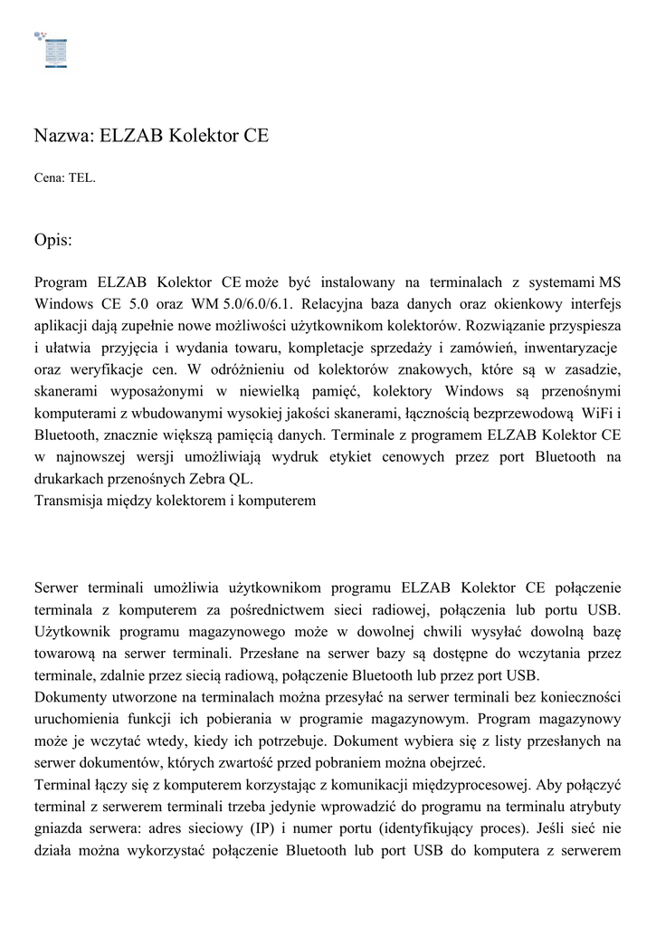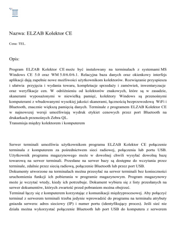 Nazwa: ELZAB Kolektor CE Cena: TEL. Opis: Program ELZAB Kolektor CE może być instalowany na terminalach z systemami MS Windows CE 5.0 oraz WM 5.0/6.0/6.1. Relacyjna baza danych oraz okienkowy interfejs aplikacji dają zupełnie nowe możliwości użytkownikom kolektorów. Rozwiązanie przyspiesza i ułatwia przyjęcia i wydania towaru, kompletacje sprzedaży i zamówień, inwentaryzacje oraz weryfikacje cen. W odróżnieniu od kolektorów znakowych, które są w zasadzie, skanerami wyposażonymi w niewielką pamięć, kolektory Windows są przenośnymi komputerami z wbudowanymi wysokiej jakości skanerami, łącznością bezprzewodową WiFi i Bluetooth, znacznie większą pamięcią danych. Terminale z programem ELZAB Kolektor CE w najnowszej wersji umożliwiają wydruk etykiet cenowych przez port Bluetooth na drukarkach przenośnych Zebra QL. Transmisja między kolektorem i komputerem Serwer terminali umożliwia użytkownikom programu ELZAB Kolektor CE połączenie terminala z komputerem za pośrednictwem sieci radiowej, połączenia lub portu USB. Użytkownik programu magazynowego może w dowolnej chwili wysyłać dowolną bazę towarową na serwer terminali. Przesłane na serwer bazy są dostępne do wczytania przez terminale, zdalnie przez siecią radiową, połączenie Bluetooth lub przez port USB. Dokumenty utworzone na terminalach można przesyłać na serwer terminali bez konieczności uruchomienia funkcji ich pobierania w programie magazynowym. Program magazynowy może je wczytać wtedy, kiedy ich potrzebuje. Dokument wybiera się z listy przesłanych na serwer dokumentów, których zwartość przed pobraniem można obejrzeć. Terminal łączy się z komputerem korzystając z komunikacji międzyprocesowej. Aby połączyć terminal z serwerem terminali trzeba jedynie wprowadzić do programu na terminalu atrybuty gniazda serwera: adres sieciowy (IP) i numer portu (identyfikujący proces). Jeśli sieć nie działa można wykorzystać połączenie Bluetooth lub port USB do komputera z serwerem terminali. Zasięg sieci radiowej zależy od rodzaju ilości i rozlokowania punktów dostępowych (AP). Prawidłowo wykonana sieć radiowa pozwala komunikować się z serwerem na całym obszarze działania terminali. Obsługiwane programy magazynowe Standardowa wersja ELZAB Kolektor CE współpracuje z następującymi programami na platformę MS Windows: - WAPROWF-Mag Win - Subiekt GT Sfera InsERT - Subiekt5 InsERT - Small Business Symplex - Raks SQL RAKS - Quattro Syriusz - PC-Market Win Insoft - KC-Firma Kucharscy - HermesNG Syriusz - Hermes SQL Win Humansoft - miniMAG Elzab Soft - Comarch Opt!ma Comarch CDN Wszystkie podane ceny, są cenami netto do których należy doliczyć podatek VAT. Cennik nie stanowi oferty handlowej w rozumieniu art. 66 par.1 Kodeksu Cywilnego