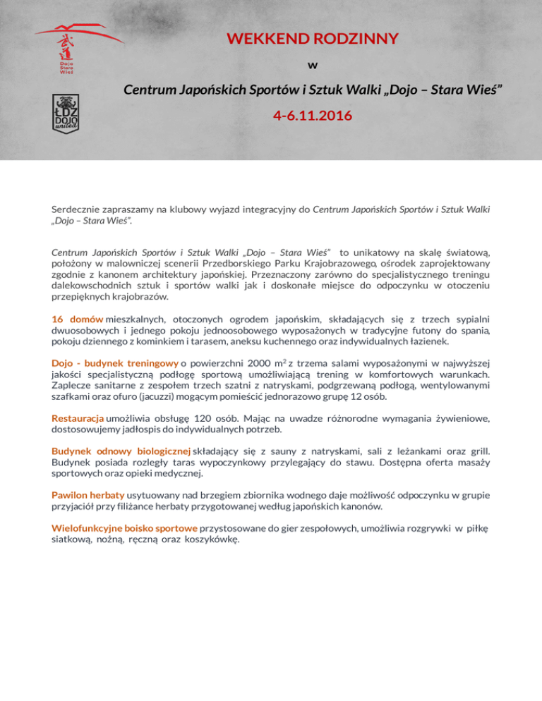 WEKKEND RODZINNY w Centrum Japońskich Sportów i Sztuk Walki „Dojo – Stara Wieś” 4-6.11.2016 Serdecznie zapraszamy na klubowy wyjazd integracyjny do Centrum Japońskich Sportów i Sztuk Walki „Dojo – Stara Wieś”. Centrum Japońskich Sportów i Sztuk Walki „Dojo – Stara Wieś” to unikatowy na skalę światową, położony w malowniczej scenerii Przedborskiego Parku Krajobrazowego, ośrodek zaprojektowany zgodnie z kanonem architektury japońskiej. Przeznaczony zarówno do specjalistycznego treningu dalekowschodnich sztuk i sportów walki jak i doskonałe miejsce do odpoczynku w otoczeniu przepięknych krajobrazów. 16 domów mieszkalnych, otoczonych ogrodem japońskim, składających się z trzech sypialni dwuosobowych i jednego pokoju jednoosobowego wyposażonych w tradycyjne futony do spania, pokoju dziennego z kominkiem i tarasem, aneksu kuchennego oraz indywidualnych łazienek. Dojo - budynek treningowy o powierzchni 2000 m2 z trzema salami wyposażonymi w najwyższej jakości specjalistyczną podłogę sportową umożliwiającą trening w komfortowych warunkach. Zaplecze sanitarne z zespołem trzech szatni z natryskami, podgrzewaną podłogą, wentylowanymi szafkami oraz ofuro (jacuzzi) mogącym pomieścić jednorazowo grupę 12 osób. Restauracja umożliwia obsługę 120 osób. Mając na uwadze różnorodne wymagania żywieniowe, dostosowujemy jadłospis do indywidualnych potrzeb. Budynek odnowy biologicznej składający się z sauny z natryskami, sali z leżankami oraz grill. Budynek posiada rozległy taras wypoczynkowy przylegający do stawu. Dostępna oferta masaży sportowych oraz opieki medycznej. Pawilon herbaty usytuowany nad brzegiem zbiornika wodnego daje możliwość odpoczynku w grupie przyjaciół przy filiżance herbaty przygotowanej według japońskich kanonów. Wielofunkcyjne boisko sportowe przystosowane do gier zespołowych, umożliwia rozgrywki w piłkę siatkową, nożną, ręczną oraz koszykówkę. WEKKEND RODZINNY w Centrum Japońskich Sportów i Sztuk Walki „Dojo – Stara Wieś” 4-6.11.2016 Organizator: DOJO United Łódź Termin: 4-6 listopada 2016r. Cena: 350 zł. UWAGA! Jeżeli zgłoszą Państwo się do 25 czerwca i wpłacą zaliczkę w wysokości 100 zł od rodziny, to każda następna osoba kosztuje 300 zł. CENA ZAWIERA: 2 noclegi w japońskich domkach o bardzo wysokim standardzie. Domki 7-8 osobowe podzielone są na pokoje 2 osobowe. Więcej info na dojostarawies.com udział we wszystkich punktach programu (warsztaty sushi i parzenia herbaty możliwe za dodatkową opłatą) korzystanie z odnowy biologicznej (sauna, jacuzzi) wyżywienie wg programu Ubezpieczenie NNW Opiekę instruktorską- wyjazd jest wyjazdem integracyjnym, dziecko poniżej 18 roku życia musi jechać pod opieką dorosłej osoby DODATKOWO PŁATNE: warsztaty sushi (40 zł/osoba) warsztaty parzenia herbaty (40 zł/osoba) Zapisy na atrakcje dodatkowo płatne zbieramy do 31.10.2016 roku CENA NIE ZAWIERA: dojazdu do ośrodka WEKKEND RODZINNY w Centrum Japońskich Sportów i Sztuk Walki „Dojo – Stara Wieś” 4-6.11.2016 PROGRAM wyjazdu integracyjnego 4.11.2016 (piątek) 17:00-18:00- przyjazd 18:00-19:00- kolacja 20:00- przywitalny trening karate 21:00- sauna party dla dorosłych 5.11 (sobota) 7:30- rozruch dla chętnych 8:00-9:00- śniadanie 10:00- trening karate z podziałem na stopnia zaawansowania 11:30- spacer na Wielką Rybę/gra integracyjna 13:30-14:30- obiad 15:30- pokazy trenerów oraz uczniów 17:00- kalambury/karaoke 18:30- kolacja w formie ogniska 21:00- jacuzzi/projekcja filmów z zawodów rozgrywanych w 2016 roku 6.11 (niedziela) 7:30- rozruch dla chętnych 8:00-9:00- śniadanie 10:00- trening karate/trening ogólnorozwojowy 11:30- pakowanie, czas wolny, możliwość skorzystania z jacuzzi 13:00-14:00- wymeldowanie, obiad. ZAPISY MAILOWO [email protected] ILOŚĆ MIEJSC OGRANICZONA, KTO PIERWSZY, TEN LEPSZY :) WPŁAT DOKONUJEMY NA KONTO STOWARZYSZENIA BGŻ BNP Paribas 32 2030 0045 1110 0000 0412 8140 DOJO United Łódź ul. Ciołkowskiego 5B, 93-510 Łódź Tytułem: Szkolenie Stara Wieś 4-6.11, imię i nazwisko uczestników