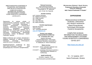 MIĘDZYNARODOWA KONFERENCJA STUDENTÓW, DOKTORANTÓW ORAZ MŁODYCH NAUKOWCÓW COMPUTER SCIENCE, INFORMATION TECHNOLOGY AND MANAGAMENT SYSTEMS YOUNG SCIENTISTS CONFERENCE «CSYSC-2017» Zapraszamy do wzięcia udziału w międzynarodowej konferencji naukowej "Nauki Komputerowe, Technologie Informacyjne i Systemy Zarządzania» (CSYSC-2017) studentów, doktorantów, młodych naukowców, inżynierów, specjalistów, ekspertów, przedsiębiorców. Konferencja odbędzie się w dniach 10 - 12 kwietnia 2017 roku na Wydziale Informatyki Przykarpackiego Narodowego Uniwersytetu imienia W. Stefanyka (IwanoFrankowsk, Ukraina). Celem konferencji jest wymiana doświadczeń i poglądów naukowych w zakresie stosowania informatyki, technologii informacyjnych, systemów kontroli i zarządzania. Współorganizatorami konferencji są firmy NGO "Iwano-Frankowsk IT Cluster", które specjalizującą się w tworzeniu oprogramowania. Patronat honorowy nad konferencją sprawuje Rektor Przykarpackiego Narodowego Uniwersytetu im. W. Stefanyka prof. dr hab. Ihor Cependa Komitet naukowy prof. Lubomyr Petryshyn doc. Nataliia Prevysokova doc. Vitaliy Goryelov doc. Yurii Iliash doc. Viktor Rovinski doc. Mariia Semankiv Komitet organizacyjny Mykhailo Petryshyn Artem Izmailov тел.: +38 (0342) 59-60-86 [email protected] Terminy oraz miejsce przeprowadzenia konferencji 10 - 12 kwietnia 2017 roku Katedra Informatyki Wydział Matematyki i Informatyki Przykarpacki Narodowy Uniwersytet im. W. Stefanyka (m. Iwano-Frankowsk) Ważne terminy 19.03.2017 – termin nadsyłania zgłoszeń oraz materiałów referatów; 31.03.2017 – przesłanie informacji do autorów o zakwalifikowaniu referatów na konferencję. Języki konferencji Ukraiński, Angielski, Polski (bez tłumaczenia symultanicznego) Ministerstwo Edukacji i Nauki Ukrainy Przykarpacki Narodowy Uniwersytet imienia W. Stefanyka NGO "Iwano-Frankowsk IT Cluster" ZAPROSZENIE Międzynarodowa konferencja studentów, doktorantów oraz młodych naukowców «Nauki Komputerowe, Technologie Informacyjne i Systemy Zarządzania» COMPUTER SCIENCE, INFORMATION TECHNOLOGIES AND MANAGEMENT SYSTEMS YOUNG SCIENTISTS CONFERENCE CSYSC-2017 http://csysc.pnu.edu.ua/ 10 – 12 kwietnia 2017 Iwano-Frankowsk, Ukraine Sekcje tematyczne 1. Nauki komputerowe 2. Technologie informacyjne 3. Systemy zarządzania Uczestnicy, którzy zamierzają zaoczne uczestnictwo w konferencji będą mieli możliwość zaprezentowania swoich referatów zasobami Skype, o czym prosimy poinformować komitet organizacyjny. Dla wygłoszenia referatów zaleca się przygotowanie prezentacji w MS Power Point. Wymagania do referatów Dokumenty przesyłane drogą elektroniczną w językach ukraińskim, polskim lub angielskim w ilości 2, 4 lub 6 pełnych stron A4 zgodnie z szablonem w MS Word 2003 dostępnym na stronie http://resource-cms.springer.com/springercms/rest/v1/content/7117506/data/v1/Microsoft+ Word+2003+Proceedings+Templates lub w formacie MS Word 2007-2010 dostępnym na stronie ftp://ftp.springer.de/pub/tex/latex/llncs/word/splnpr oc1110.zip wg wzorca ftp://ftp.springer.de/pub/tex/latex/svproc/guideline s/Springer_Guidelines_for_Authors_of_Proceedin gs.pdf na e-mail [email protected] do dnia 19 marca 2017 roku. Wraz z artykułem musi być podana opinia promotora. Recenzowane i zaakceptowane referaty zostaną opublikowane w formacie PDF w elektronicznych materiałach pokonferencyjnych, którym będzie nadany ISBN i będą dostępne na stronie internetowej konferencji http://csysc.pnu.edu.ua/, biblioteki Przykarpackiego Narodowego Uniwersytetu im. W. Stefanyky i Narodowej Biblioteki Ukrainy im. V.Vernadskiego. Zgłoszenie udziału w konferencji Nazwisko.......................................................... Imię ................................................................. Naukowy stopień (jeżeli jest) …………........... Afiliacja (miejsce pracy) .................................. Stanowisko...................................................... Tytuł referatu.................................................... Numer i nazwa sekcji. .................................... Adres pocztowy .............................................. …………………………………………………... Telefony ......................................................... E-mail ............................................................. Udział: oczny / zaoczny Potrzeba w hotelu: tak / nie Zakwaterowanie Zakwaterowanie uczestników podczas udziału w konferencji w Iwano-Frankowsku własnym kosztem. Uczestnikom zamiejscowym oraz zagranicznym zostaną zaoferowane miejsce w hotelu przy ul. Lesi Ukrainki, 4 (centrum miasta), o konieczności czego prosimy o poinformowanie komitetu organizacyjnego w celu rezerwacji miejsc. Udział w międzynarodowej konferencji studentów, doktorantów i młodych naukowców «CSYSC-2017» oraz publikacja materiałów w formie elektronicznej jest bezpłatny !!!