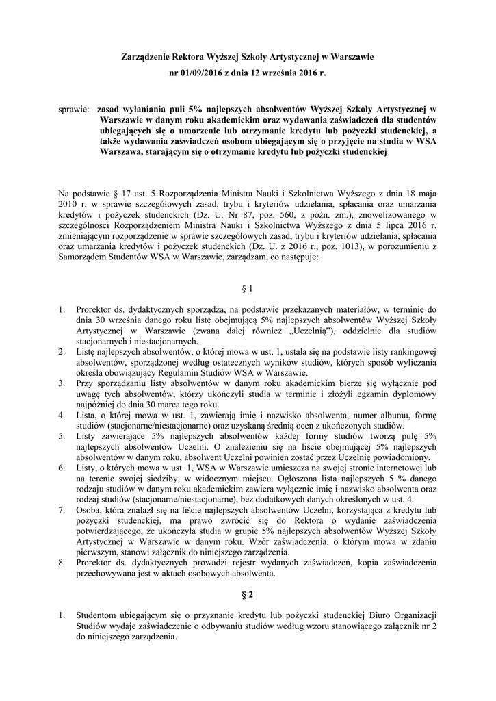 Zarządzenie Rektora Wyższej Szkoły Artystycznej w Warszawie nr 01/09/2016 z dnia 12 września 2016 r. sprawie: zasad wyłaniania puli 5% najlepszych absolwentów Wyższej Szkoły Artystycznej w Warszawie w danym roku akademickim oraz wydawania zaświadczeń dla studentów ubiegających się o umorzenie lub otrzymanie kredytu lub pożyczki studenckiej, a także wydawania zaświadczeń osobom ubiegającym się o przyjęcie na studia w WSA Warszawa, starającym się o otrzymanie kredytu lub pożyczki studenckiej Na podstawie § 17 ust. 5 Rozporządzenia Ministra Nauki i Szkolnictwa Wyższego z dnia 18 maja 2010 r. w sprawie szczegółowych zasad, trybu i kryteriów udzielania, spłacania oraz umarzania kredytów i pożyczek studenckich (Dz. U. Nr 87, poz. 560, z późn. zm.), znowelizowanego w szczególności Rozporządzeniem Ministra Nauki i Szkolnictwa Wyższego z dnia 5 lipca 2016 r. zmieniającym rozporządzenie w sprawie szczegółowych zasad, trybu i kryteriów udzielania, spłacania oraz umarzania kredytów i pożyczek studenckich (Dz. U. z 2016 r., poz. 1013), w porozumieniu z Samorządem Studentów WSA w Warszawie, zarządzam, co następuje: §1 1. 2. 3. 4. 5. 6. 7. 8. Prorektor ds. dydaktycznych sporządza, na podstawie przekazanych materiałów, w terminie do dnia 30 września danego roku listę obejmującą 5% najlepszych absolwentów Wyższej Szkoły Artystycznej w Warszawie (zwaną dalej również „Uczelnią”), oddzielnie dla studiów stacjonarnych i niestacjonarnych. Listę najlepszych absolwentów, o której mowa w ust. 1, ustala się na podstawie listy rankingowej absolwentów, sporządzonej według ostatecznych wyników studiów, których sposób wyliczania określa obowiązujący Regulamin Studiów WSA w Warszawie. Przy sporządzaniu listy absolwentów w danym roku akademickim bierze się wyłącznie pod uwagę tych absolwentów, którzy ukończyli studia w terminie i złożyli egzamin dyplomowy najpóźniej do dnia 30 marca tego roku. Lista, o której mowa w ust. 1, zawierają imię i nazwisko absolwenta, numer albumu, formę studiów (stacjonarne/niestacjonarne) oraz uzyskaną średnią ocen z ukończonych studiów. Listy zawierające 5% najlepszych absolwentów każdej formy studiów tworzą pulę 5% najlepszych absolwentów Uczelni. O znalezieniu się na liście obejmującej 5% najlepszych absolwentów w danym roku, absolwent Uczelni powinien zostać przez Uczelnię powiadomiony. Listy, o których mowa w ust. 1, WSA w Warszawie umieszcza na swojej stronie internetowej lub na terenie swojej siedziby, w widocznym miejscu. Ogłoszona lista najlepszych 5 % danego rodzaju studiów w danym roku akademickim zawiera wyłącznie imię i nazwisko absolwenta oraz rodzaj studiów (stacjonarne/niestacjonarne), bez dodatkowych danych określonych w ust. 4. Osoba, która znalazł się na liście najlepszych absolwentów Uczelni, korzystająca z kredytu lub pożyczki studenckiej, ma prawo zwrócić się do Rektora o wydanie zaświadczenia potwierdzającego, że ukończyła studia w grupie 5% najlepszych absolwentów Wyższej Szkoły Artystycznej w Warszawie w danym roku. Wzór zaświadczenia, o którym mowa w zdaniu pierwszym, stanowi załącznik do niniejszego zarządzenia. Prorektor ds. dydaktycznych prowadzi rejestr wydanych zaświadczeń, kopia zaświadczenia przechowywana jest w aktach osobowych absolwenta. §2 1. Studentom ubiegającym się o przyznanie kredytu lub pożyczki studenckiej Biuro Organizacji Studiów wydaje zaświadczenie o odbywaniu studiów według wzoru stanowiącego załącznik nr 2 do niniejszego zarządzenia. 2. Osobom ubiegającym się o przyjęcie na studia wyższe ubiegającym się o przyznanie kredytu lub pożyczki studenckiej komisja rekrutacyjna Rektor lub Prorektor ds. dydaktycznych wydaje, na ich wniosek, dokument potwierdzający przyjęcie na studia wyższe albo dokument potwierdzający udział w rekrutacji na studia. Na podstawie wyżej określonych dokumentów bank będzie mógł rozpatrywać wnioski osób je posiadających, a zawarcie umowy o kredyt będzie możliwe po uzyskaniu statusu studenta. §3 1. Szczegółowe regulacje dotyczące zasad, trybu i kryteriów udzielania, spłacania oraz umarzania kredytów i pożyczek studenckich zawiera Rozporządzenie Ministra Nauki i Szkolnictwa Wyższego z dnia 18 maja 2010 r. w sprawie szczegółowych zasad, trybu i kryteriów udzielania, spłacania oraz umarzania kredytów i pożyczek studenckich (Dz. U. Nr 87, poz. 560, z późn. zm.) oraz Rozporządzenie Ministra Nauki i Szkolnictwa Wyższego z dnia 5 lipca 2016 r. zmieniające rozporządzenie w sprawie szczegółowych zasad, trybu i kryteriów udzielania, spłacania oraz umarzania kredytów i pożyczek studenckich (Dz. U. z 2016 r., poz. 1013). Wyżej wymienione akty normatywne znajdują się m.in. na stronie internetowej Ministerstwa Nauki i Szkolnictwa Wyższego, gdzie umieszczone są również wytyczne dotyczące składania wniosków, w tym informacja o zmianie ostatecznego terminu na składanie tych wniosków oraz zawierania umów o kredyt. 2. Niniejsze zarządzenie wchodzi w życie z dniem podpisania, określonym w nagłówku. 3. Z chwilą wejścia w życie niniejszego zarządzenia, uchyla się, wraz z załącznikiem, zarządzenie Rektora Wyższej Szkoły Artystycznej w Warszawie nr 1/10/2013 z dnia 1 października 2013 r. w sprawie zasad wyłaniania puli 5% najlepszych absolwentów Wyższej Szkoły Artystycznej w Warszawie w danym roku akademickim oraz wydawania zaświadczeń dla studentów ubiegających się o umorzenie kredytu lub pożyczki studenckiej. Rektor Dr Robert Manowski Załączniki: 1)-2) Wzory zaświadczeń. Załącznik nr 1 …..………………………………………………. pieczęć nagłówkowa uczelni ZAŚWIADCZENIE Zaświadcza się, że Pan/Pani ………………………………………………..……….…………… PESEL …………………………………ukończył/a studia w grupie 5% najlepszy