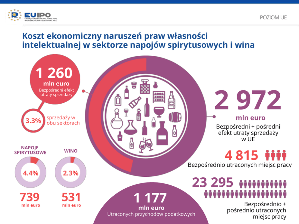 POZIOM UE Koszt ekonomiczny naruszeń praw własności intelektualnej w sektorze napojów spirytusowych i wina 1 260 mln euro 2 972 Bezpośredni efekt utraty sprzedaży 3.3% NAPOJE SPIRYTUSOWE Bezpośredni + pośredni efekt utraty sprzedaży w UE 4 815 WINO 4.4% 2.3% 739 531 mln euro mln euro sprzedaży w obu sektorach mln euro Bezpośrednio utraconych miejsc pracy 1 177 mln euro 23 295 Utraconych przychodów podatkowych Bezpośrednio + pośrednio utraconych miejsc pracy POZIOM PAŃSTW CZŁONKOWSKICH Względna wartość utraconej sprzedaży w sektorze napojów spirytusowych TOP 5: całkowita utrata sprzedaży Średnia UE 4.4% 1.6% Średnia względnych strat w sektorze (%) 4.3% 5.6% < 4% 9.4% 4 < 6% 4.2% 11.3% 3% +6% 3.6% 2.5% 9.5% 2.6% 2.7% 4.5% 6.1% 3% 4.1% 4.7% 3.3% 7.4% 4.8% 4.6% 10.3% 3.3% 6.2% 10.4% 10.7% 5.1% 10.6% Hiszpania 173 mln euro Francja 100 mln euro Niemcy 81 mln euro Włochy 78 mln euro Polska 59 mln euro POZIOM PAŃSTW CZŁONKOWSKICH Względna wartość utraconej sprzedaży w sektorze wina TOP 6: całkowita utrata sprzedaży Średnia UE 2.3% 1% Średnia względnych strat w sektorze (%) 0.8% 3.3% < 2% 6% 2 < 4% 0.9% 6.6% 1.7% +4% 2% 2.1% 3.2% 4.7% 1.7% 4% 1.6% 4.7% 2.1% 1.4% 3.1% 2.6% 7.4% 13.9% 10.1% 2.3% 2.8% 2.3% 6.2% 3.9% 4.4% Hiszpania 90 mln euro Włochy 83 mln euro Wielka Brytania Niemcy 62 mln euro 60 mln euro Francja 36 mln euro Rumunia 32 mln euro
