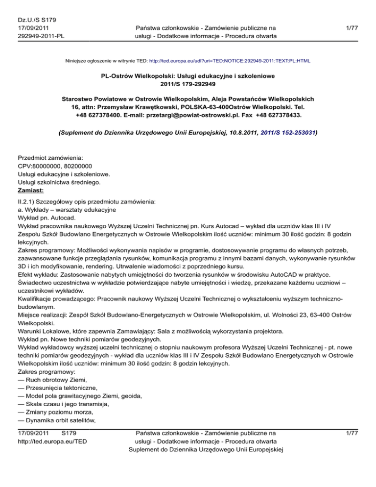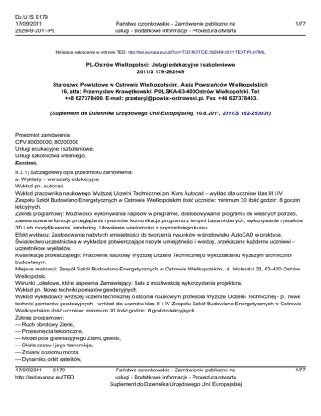 Dz.U./S S179 17/09/2011 292949-2011-PL Państwa członkowskie - Zamówienie publiczne na usługi - Dodatkowe informacje - Procedura otwarta 1/77 Niniejsze ogłoszenie w witrynie TED: http://ted.europa.eu/udl?uri=TED:NOTICE:292949-2011:TEXT:PL:HTML PL-Ostrów Wielkopolski: Usługi edukacyjne i szkoleniowe 2011/S 179-292949 Starostwo Powiatowe w Ostrowie Wielkopolskim, Aleja Powstańców Wielkopolskich 16, attn: Przemysław Krawętkowski, POLSKA-63-400Ostrów Wielkopolski. Tel. +48 627378400. E-mail: [email protected]. Fax +48 627378433. (Suplement do Dziennika Urzędowego Unii Europejskiej, 10.8.2011, 2011/S 152-253031) Przedmiot zamówienia: CPV:80000000, 80200000 Usługi edukacyjne i szkoleniowe. Usługi szkolnictwa średniego. Zamiast: II.2.1) Szczegółowy opis przedmiotu zamówienia: a. Wykłady – warsztaty edukacyjne Wykład pn. Autocad. Wykład pracownika naukowego Wyższej Uczelni Technicznej pn. Kurs Autocad – wykład dla uczniów klas III i IV Zespołu Szkół Budowlano Energetycznych w Ostrowie Wielkopolskim ilość uczniów: minimum 30 ilość godzin: 8 godzin lekcyjnych. Zakres programowy: Możliwości wykonywania napisów w programie, dostosowywanie programu do własnych potrzeb, zaawansowane funkcje przeglądania rysunków, komunikacja programu z innymi bazami danych, wykonywanie rysunków 3D i ich modyfikowanie, rendering. Utrwalenie wiadomości z poprzedniego kursu. Efekt wykładu: Zastosowanie nabytych umiejętności do tworzenia rysunków w środowisku AutoCAD w praktyce. Świadectwo uczestnictwa w wykładzie potwierdzające nabyte umiejętności i wiedzę, przekazane każdemu uczniowi – uczestnikowi wykładów. Kwalifikacje prowadzącego: Pracownik naukowy Wyższej Uczelni Technicznej o wykształceniu wyższym technicznobudowlanym. Miejsce realizacji: Zespół Szkół Budowlano-Energetycznych w Ostrowie Wielkopolskim, ul. Wolności 23, 63-400 Ostrów Wielkopolski. Warunki Lokalowe, które zapewnia Zamawiający: Sala z możliwością wykorzystania projektora. Wykład pn. Nowe techniki pomiarów geodezyjnych. Wykład wykładowcy wyższej uczelni technicznej o stopniu naukowym profesora Wyższej Uczelni Technicznej - pt. nowe techniki pomiarów geodezyjnych - wykład dla uczniów klas III i IV Zespołu Szkół Budowlano Energetycznych w Ostrowie Wielkopolskim ilość uczniów: minimum 30 ilość godzin: 8 godzin lekcyjnych. Zakres programowy: — Ruch obrotowy Ziemi, — Przesunięcia tektoniczne, — Model pola grawitacyjnego Ziemi, geoida, — Skala czasu i jego transmisja, — Zmiany poziomu morza, — Dynamika orbit satelitów, 17/09/2011 S179 http://ted.europa.eu/TED Państwa członkowskie - Zamówienie publiczne na usługi - Dodatkowe informacje - Procedura otwarta Suplement do Dziennika Urzędowego Unii Europejskiej 1/77 Dz.U./S S179 17/09/2011 292949-2011-PL Państwa członkowskie - Zamówienie publiczne na usługi - Dodatkowe informacje - Procedura otwarta 2/77 — Utworzenie i konserwacja Państwowego Układu Odniesienia, — Precyzyjne wyznaczanie pozycji, — Tworzenie map numerycznych, — Pozyskiwanie danych i tworzenie systemów GIS, — Nawigacja i monitorowanie obiektów dynamicznych. Efekt wykładu: Pogłębienie wiedzy z geodezji satelitarnej. Świadectwo uczestnictwa w wykładzie potwierdzające nabyte umiejętności i wiedzę, przekazane każdemu uczniowi – uczestnikowi wykładów. Kwalifikacje prowadzącego: — wykształcenie: co najmniej profesor, — uprawnienia pedagogiczne do nauczania przedmiotów teoretycznych w szkole zgodnie z, z Rozporządzeniem Ministra Edukacji Narodowej z dnia 12.3.2009 w sprawie szczegółowych kwalifikacji wymaganych od nauczycieli oraz określenia szkół i wypadków, w których można zatrudnić nauczycieli niemających wyższego wykształcenia lub ukończonego zakładu wykształcenia nauczycieli (Dz. U. Nr 50, poz.400). Miejsce realizacji: Zespół Szkół Budowlano Energetycznych w Ostrowie Wielkopolskim, ul. Wolności 23, 63-400 Ostrów Wielkopolski. Warunki lokalowe i sprzętowe, które zapewnia Zamawiający: Sala wyposażona w tablicę, rzutnik multimedialny, komputer lub odtwarzacz DVD, zestaw rysunków. Wykłady pn. „Ryzyko finansowe a rzeczywistość gospodarcza”; „Giełda papierów wartościowych”; „Systemy wspomagające zarządzanie logistyką i wykorzystanie ich w praktyce”. Wykład pracowników naukowych Wyższych Uczelni Ekonomicznych na temat: „Ryzyko finansowe a rzeczywistość gospodarcza” ilość uczniów: minimum 30 ilość godzin: 5 godzin lekcyjnych. Temat wykładu: „Ryzyko finansowe a rzeczywistość gospodarcza”. Zakres programowy: — ocena ryzyka finansowego, — ryzyko finansowe a kryzys gospodarczy. Warunki lokalowe: wykład będzie realizowany w auli szkoły z wykorzystaniem środków multimedialnych. Kwalifikacje prowadzącego dla wykładu pn. „Ryzyko finansowe a rzeczywistość gospodarcza”: — pracownik naukowy Wyższej Uczelni Ekonomicznej, Wykształcenie wyższe ekonomiczne, — uprawnienia pedagogiczne do nauczania przedmiotów teoretycznych w szkole zgodnie, z Rozporządzeniem Ministra Edukacji Narodowej z dnia 12.3.2009 w sprawie szczegółowych kwalifikacji wymaganych od nauczycieli oraz określenia szkół i wypadków, w których można zatrudnić nauczycieli niemających wyższego wykształcenia lub ukończonego zakładu wykształcenia nauczycieli (Dz. U. Nr 50, poz.400). Efekt wykładu: Pogłębienie wiedzy ekonomicznej. Świadectwo uczestnictwa w wykładzie potwierdzające nabyte umiejętności i wiedzę, przekazane każdemu uczniowi – uczestnikowi wykładów. Miejsce realizacji: Zespół Szkół Ekonomicznych im. Józefa Gniazdowskiego, ul. Partyzancka 29; 63-400 Ostrów Wielkopolski. Warunki lokalowe i sprzętowe, które zapewnia Zamawiający: wykład będzie realizowany w auli szkoły z wykorzystaniem projektora multimedialnego. Wykład pracowników naukowych Wyższych Uczelni Ekonomicznych na temat: „Giełda papierów wartościowych ilo