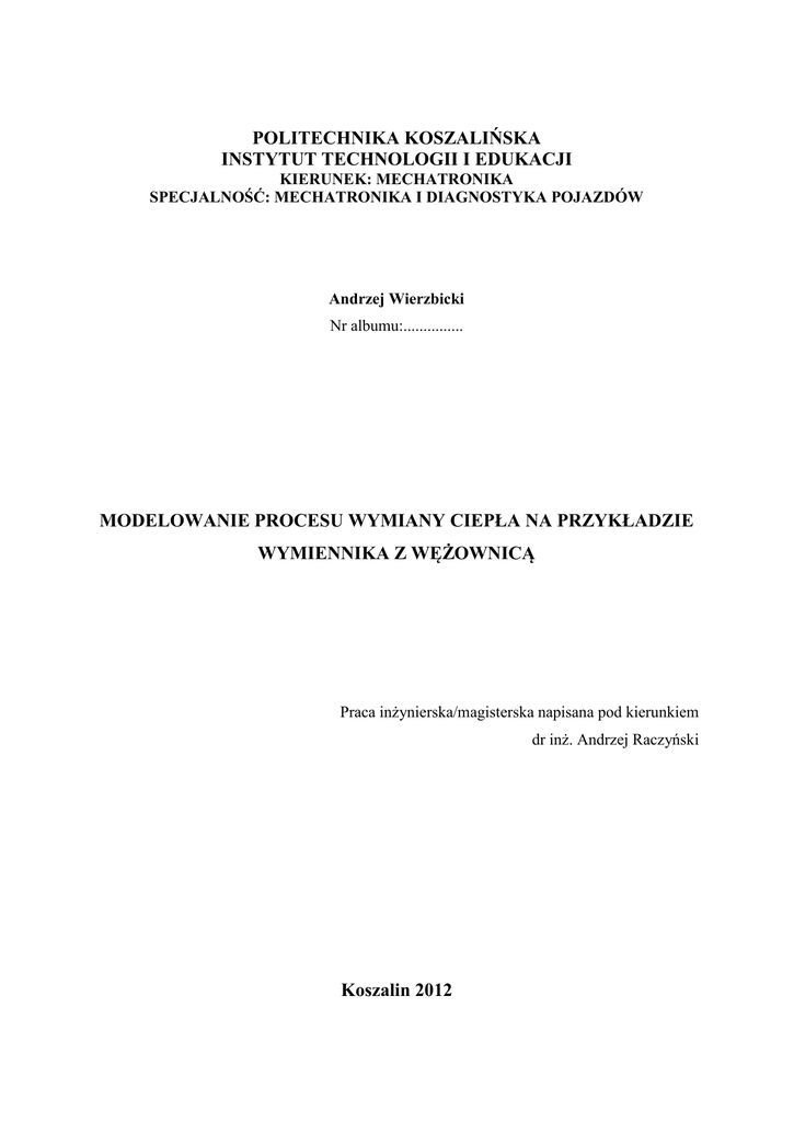POLITECHNIKA KOSZALIŃSKA INSTYTUT TECHNOLOGII I EDUKACJI KIERUNEK: MECHATRONIKA SPECJALNOŚĆ: MECHATRONIKA I DIAGNOSTYKA POJAZDÓW Andrzej Wierzbicki Nr albumu:............... MODELOWANIE PROCESU WYMIANY CIEPŁA NA PRZYKŁADZIE WYMIENNIKA Z WĘŻOWNICĄ Praca inżynierska/magisterska napisana pod kierunkiem dr inż. Andrzej Raczyński Koszalin 2012