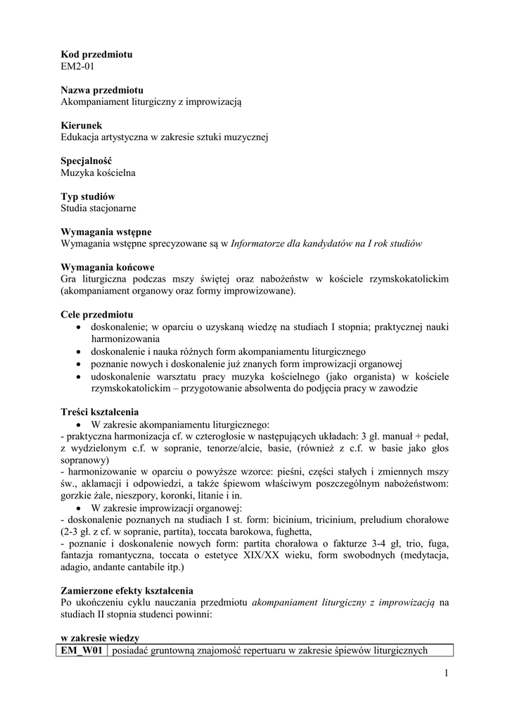 Kod przedmiotu EM2-01 Nazwa przedmiotu Akompaniament liturgiczny z improwizacją Kierunek Edukacja artystyczna w zakresie sztuki muzycznej Specjalność Muzyka kościelna Typ studiów Studia stacjonarne Wymagania wstępne Wymagania wstępne sprecyzowane są w Informatorze dla kandydatów na I rok studiów Wymagania końcowe Gra liturgiczna podczas mszy świętej oraz nabożeństw w kościele rzymskokatolickim (akompaniament organowy oraz formy improwizowane). Cele przedmiotu doskonalenie; w oparciu o uzyskaną wiedzę na studiach I stopnia; praktycznej nauki harmonizowania doskonalenie i nauka różnych form akompaniamentu liturgicznego poznanie nowych i doskonalenie już znanych form improwizacji organowej udoskonalenie warsztatu pracy muzyka kościelnego (jako organista) w kościele rzymskokatolickim – przygotowanie absolwenta do podjęcia pracy w zawodzie Treści kształcenia W zakresie akompaniamentu liturgicznego: - praktyczna harmonizacja cf. w czterogłosie w następujących układach: 3 gł. manuał + pedał, z wydzielonym c.f. w sopranie, tenorze/alcie, basie, (również z c.f. w basie jako głos sopranowy) - harmonizowanie w oparciu o powyższe wzorce: pieśni, części stałych i zmiennych mszy św., aklamacji i odpowiedzi, a także śpiewom właściwym poszczególnym nabożeństwom: gorzkie żale, nieszpory, koronki, litanie i in. W zakresie improwizacji organowej: - doskonalenie poznanych na studiach I st. form: bicinium, tricinium, preludium chorałowe (2-3 gł. z cf. w sopranie, partita), toccata barokowa, fughetta, - poznanie i doskonalenie nowych form: partita chorałowa o fakturze 3-4 gł, trio, fuga, fantazja romantyczna, toccata o estetyce XIX/XX wieku, form swobodnych (medytacja, adagio, andante cantabile itp.) Zamierzone efekty kształcenia Po ukończeniu cyklu nauczania przedmiotu akompaniament liturgiczny z improwizacją na studiach II stopnia studenci powinni: w zakresie wiedzy EM_W01 posiadać gruntowną znajomość repertuaru w zakresie śpiewów liturgicznych 1 EM_W02 posiadać umiejętność zastosowania wiedzy dotyczącej elementów dzieła muzycznego i wzorców budowy formalnej utworów instrumentalnych do tworzenia poprawnych improwizacji EM_W06 posiadać głębokie zrozumienie wzajemnych relacji pomiędzy teoretycznymi i praktycznymi elementami studiów oraz zdolność do integrowania nabytej wiedzy EM_W07 dysponować szeroką wiedzą umożliwiającą swobodną improwizację w różnych kontekstach w zakresie umiejętności EM_U01 posiadać wysoko rozwiniętą osobowość artystyczną umożliwiającą tworzenie, realizowanie i wyrażanie własnych koncepcji artystycznych EM_U07 kontynuując i rozwijając umiejętności nabyte na studiach pierwszego stopnia, poprzez indywidualną pracę utrzymywać i poszerzać swoje zdolności do tworzenia, realizowania i wyrażania własnych koncepcji artystycznych EM_U12 posiadać umiejętność swobodnego kształtowania umożliwiający odejście od zapisanego tekstu nutowego EM_U13 posiadać umiejętność improwizowania na bazie wykonywanego utworu (pieśni) EM_U14 posiadać umiejętność transponowania przebiegów melodyczno-harmonicznych muzyki w sposób w zakresie kompetencji społecznych EM_K02 rozumieć potrzebę uczenia się przez całe życie, EM_K08 posiadać umiejętność adaptowania się do nowych, zmiennych okoliczności, które mogą występować podczas wykonywania pracy zawodowej Formy kształcenia Zajęcia indywidualne Nakład pracy studenta niezbędny do osiągnięcia zamierzonych efektów kształcenia Rok I II Semestr 1 2 3 4 Punkty ECTS 2 2 1 2 Liczba godzin w tygodniu 1 1 0,5 0,5 Rodzaj zaliczenia Legenda sk sk sk sk – zaliczenie ze stopniem komisyjne ek – egzamin komisyjny ek Kryteria oceny W zakresie akompaniamentu liturgicznego: - dobór właściwych środków harmonicznych, inwencja własna studenta w tym zakresie, twórcze podejście do realizowanych zadań 2 - poprawność zastosowania wykorzystanych środków harmonicznych ze szczególnym zwróceniem uwagi na umiejętność skorelowania czynnika wertykalnego i horyzontalnego - umiejętność posługiwania się różnymi typami faktury oraz zastosowania ich w prezentowanym materiale dźwiękowym - umiejętność zastosowania różnorodnych form akompaniamentu liturgicznego w tym obowiązkowo harmonizacja trzy i czterogłosowa na manuale, czterogłosowa w układzie 3 gł. manuał + pedał, z wydzielonym c.f. w sopranie, basie - właściwy dobór rejestrów - płynność w prowadzeniu frazy, uwzględnienie oddechów, warunków akustycznych – umiejętność sugestywnego prowadzenia śpiewu instrumentem - umiejętność praktycznej harmonizacji sopranu ad hoc w układzie czterogłosowym (3gł. man. + ped.) W zakresie improwizacji organowej: - umiejętność biegłego improwizowania w oparciu o podany materiał dźwiękowy form instrumentalnych: bicinium, tricinium, preludium chorałowe (2-3 gł. z cf. w sopranie, partita), toccata barokowa, fughetta, - umiejętność improwizowania w zakresie form: partita chorałowa o fakturze 3-4 gł, trio, fuga, fantazja romantyczna, toccata o estetyce XIX/XX wieku, form swobodnych (medytacja, adagio, andante cantabile itp.) Literatura „Śpiewnik kościelny” ks. J. Siedlecki śpiewnik „Exultate Deo”, G. M. Skop „Śpiewy międzylekcyjne” ks. K. Pasionek „Ciebie, Boga, wysławiamy”, Kraków 2000 „Chorał Opolski”, Opole 1987 „Droga do Nieba” Opole 2006 „Psallite Domino Sapienter”, Opole 2004 „Praxis der Orgelimprovisation”, H. Gebhard „Schule der Choral-improvisation”, H. Keller „Grundlagen der Orgelimprovisation”, Ch. Michel-Ostertun Język wykładowy Polski, angielski, niemiecki Prowadzący dr Marek Fronc wykł. dr Tomasz Głuchowski 3