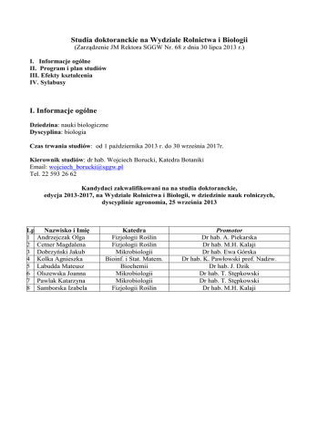 Studia doktoranckie na Wydziale Rolnictwa i Biologii (Zarządzenie JM Rektora SGGW Nr. 68 z dnia 30 lipca 2013 r.) I. Informacje ogólne II. Program i plan studiów III. Efekty kształcenia IV. Sylabusy I. Informacje ogólne Dziedzina: nauki biologiczne Dyscyplina: biologia Czas trwania studiów: od 1 października 2013 r. do 30 września 2017r. Kierownik studiów: dr hab. Wojciech Borucki, Katedra Botaniki Email: [email protected] Tel. 22 593 26 62 Kandydaci zakwalifikowani na na studia doktoranckie, edycja 2013-2017, na Wydziale Rolnictwa i Biologii, w dziedzinie nauk rolniczych, dyscyplinie agronomia, 25 września 2013 Lp. Nazwisko i Imię 1 Andrzejczak Olga 2 Cetner Magdalena 3 Dobrzyński Jakub 4 Kolka Agnieszka 5 Labudda Mateusz 6 Olszewska Joanna 7 Pawlak Katarzyna 8 Samborska Izabela Katedra Fizjologii Roślin Fizjologii Roślin Mikrobiologii Bioinf. i Stat. Matem. Biochemii Mikrobiologii Mikrobiologii Fizjologii Roślin Promotor Dr hab. A. Piekarska Dr hab. M.H. Kalaji Dr hab. Ewa Górska Dr hab. K. Pawłowski prof. Nadzw. Dr hab. J. Dzik Dr hab. T. Stępkowski Dr hab. T. Stępkowski Dr hab. M.H. Kalaji Warszawa, dnia 25.09.2013 Protokół z posiedzenia Komisji Rekrutacyjnej na studia doktoranckie w dziedzinie: nauki biologiczne i dyscyplinie biologia (zarządzenie nr 68 JM Rektora z dnia 29.07.2013) na Wydziale Rolnictwa i Biologii Posiedzenie Komisji odbyło się 25.09.2013 roku w składzie: dr hab. Grażyna Garbaczewska prof. nadz. SGGW-- przewodnicząca Komisji prof. dr hab. Wiesław Bielawski prof. dr hab. Zdzisław Wyszyński prof. dr hab. Wiesław Mądry prof. dr hab. Sławomir Podlaski prof. dr hab. Józef Chojnicki dr hab. Małgorzata Łobocka prof. nadz. SGGW dr hab. Wojciech Borucki – kierownik studiów doktoranckich, sekretarz mgr Edmund Kozieł- doktorant Kandydaci na doktorantów złożyli dokumenty pozwalające na przeprowadzenie postępowania rekrutacyjnego. W postępowaniu rekrutacyjnym wzięło udział 9 kandydatów. Oceniano: - średnią ocen z toku studiów (liczba punktów do zdobycia równa uzyskanej średniej ocen) - aktywności naukową (ocenianej w skali 0-5 pkt) - odpowiedzi w trakcie rozmowy z kandydatem (ocenianej w skali 0-10 pkt ) Kandydaci przedstawiali swoje dotychczasowe doświadczenia i osiągnięcia związane ze studiami i wykonywaniem pracy magisterskiej. Prezentowali także zainteresowania naukowe oraz założenia pracy doktorskiej. Na podstawie uzyskanej przez poszczególnych kandydatów liczby punktów przygotowano listę rankingową. Warunkiem przyjęcia na studia było zdobycie co najmniej 11pkt. Lista rankingowa dla dziedziny nauki biologiczne – dyscyplina biologia: 1. Olszewska Joanna przyjęta 2. Pawlak Katarzyna przyjęta 3. Andrzejczak Olga przyjęta 4. Labudda Mateusz przyjęty 5. Kolka Agnieszka przyjęta bez stypendium 6. Dobrzyński Jakub przyjęty 7. Samborska Izabela przyjęta 8. Cetner Magdalena przyjęta 20 pkt 20 pkt 19 pkt 19 pkt 14 pkt 13 pkt 12,5 pkt 12 pkt Biorąc pod uwagę liczbę punktów uzyskanych przez kandydatów, Komisja podjęła decyzję o przyjęciu na studia doktoranckie w dyscyplinie biologia 8 osób, w tym 1 bez stypendium. Nie wykorzystano 1 stypendium z limitu 8 stypendiów przyznanych przez JM Rektora. Wynik rekrutacji został ogłoszony kandydatom przez Panią dziekan dr hab. Grażynę Garbaczewską prof. SGGW. Kierownik studiów Dr hab. Wojciech Borucki II. Program i plan studiów Program stacjonarnych studiów doktoranckich prowadzonych na Wydziale Rolnictwa i Biologii w okresie od 1 października 2013 roku do 30 września 2017 roku w dziedzinie: nauki biologiczne, dyscyplina: biologia Nazwa zajęć Wymiar zajęć: godz. kontaktowe/ praca własna* Forma zaliczenia Sem. 1 Sem. 2 Sem. 3 Sem. 4 Sem. 5 Sem. 6 Sem. 7 Sem. 8 12 zaliczenie 30 30 30 30 30 30 30 30 90/60 5 zaliczenie 45 45 90/60 5 zaliczenie 15/10 30/20 1 2 zaliczenie zaliczenie 15/10 1 zaliczenie 30 30 Zajęcia obowiązkowe: 12 ECTS 240/120 Seminaria Zajęcia fakultatywne**: 25 ECTS ECTS Rok I Nowoczesne metody i techniki prowadzenia zajęć dydaktycznych 1) Elementy psychologii społecznej i komunikowania interpersonalnego 1) Etyka w nauce 2) Przedmioty do wyboru z dziedziny, w której są prowadzone badania*** 2) Przedmioty do wyboru z innej dziedziny*** 2) Statystyka i informatyka w biologii i rolnictwie 2) Język obcy nowoż. 2) 30/20 2 zaliczenie 15 15 180/60 8 zaliczenie 30 30 Praktyki zawodowe: 13 ECTS 330/60 13 zaliczenie 1020/420 43(!) Zajęcia dydaktyczne RAZEM: 45 Rok II Rok III Rok IV 45 15 15 15 15 30 30 30 30 45 45 45 45 45 45 165 210 150 135 105 105 75 75 * kompletowanie i studiowanie bibliografii, przygotowywanie seminariów itp. ** zajęcia fakultatywne przygotowują doktoranta do wykonywania zawodu nauczyciela akademickiego oraz do pracy o charakterze badawczym *** wybór przedmiotów po konsultacji z opiekunem naukowym 1) przedmioty do wyboru przygotowujące doktoranta do wykonywania zawodu nauczyciela akademickiego 2) przedmioty do wyboru przygotowujące doktoranta do pracy o charakterze badawczym (!) suma punktów ECTS, którą musi uzyskać doktorant Warunkiem ukończenia studiów doktoranckich jest uzyskanie przez doktoranta 5 punktów ECTS z zajęć przygotowujących do wykonywania zawodu nauczyciela akademickiego, 13 punktów ECTS z zajęć przygotowujących do pracy badawczej, 12 punktów ECTS z seminarium oraz 13 punktów ECTS z praktyk zawodowych, a zatem uzyskanie łącznie 43 punktów ECTS. Plan zajęć na studiach doktoranckich I rok, semestr I, Wydział Rolnictwa i Biologii, bud.37 Dzień/godz 8-10 Poniedziałek Statystyka i informatyka w biologii i rolnictwie prof. dr hab. W. Mądry Przedmiot do wyboru Środa Niedziela 14-16 Przedmiot do wyboru Seminarium doktoranckie dr hab. Wojciech Borucki Czwartek Sobota 12-14 Przedmiot do wyboru Wtorek Piątek 10-12 Język angielski mgr K. Smol mgr W. Pawlicka Przedmiot do wyboru g. 11-13 Nowoczesne metody i techniki prowadzenia zajęć dydaktycznych dr Ewa Lubina III
