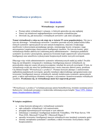 Wirtualizacja w praktyce. Autor: Marek Serafin Wirtualizacja - to proste! Poznaj zalety wirtualizacji i sytuacje, w których sprawdza się ona najlepiej Naucz się instalować najpopularniejsze rozwiązania wirtualizacyjne Dowiedz się, jak korzystać z wirtualnych serwerów i jak nimi zarządzać Temat wirtualizacji z roku na rok staje się w świecie IT coraz popularniejszy. Nie ma w tym nic dziwnego - wirtualizacja serwerów i zasobów pozwala używać jednocześnie kilku różnych systemów operacyjnych na tym samym komputerze, znacznie zwiększając możliwości wykorzystania posiadanego sprzętu, zmniejszając koszty związane z jego utrzymaniem i poprawiając elastyczność konfiguracji zasobów. Na tym nie koniec, gdyż wirtualizacja bardzo ułatwia też codzienną pracę administratorów - zmniejsza podatność systemów na awarie i przeciążenia, upraszcza tworzenie kopii zapasowych i przywracanie konfiguracji oraz umożliwia wykonywanie bezpiecznych testów nowych rozwiązań. Dlaczego więc wielu administratorów systemów informatycznych nadal jej unika? Zwykle boją się oni kłopotów związanych z instalacją i konfiguracją maszyn wirtualnych; na przeszkodzie stoją też często ich przyzwyczajenia i niechęć do nowych rozwiązań. O tym, że wirtualizacja wcale nie musi być problematyczna i może znacznie ułatwić pracę, przekona Cię lektura książki "Wirtualizacja w praktyce". Poznasz korzyści płynące z zastosowania najbardziej popularnych rozwiązań, sposoby instalacji odpowiedniego oprogramowania oraz tworzenia i konfiguracji maszyn wirtualnych, metody instalowania systemów operacyjnych gości, a także najważniejsze działania związane z używaniem i konserwowaniem wirtualnych zasobów. Przekonasz się, że wirtualizacja może być naprawdę prosta! "Wirtualizacja w praktyce" to kolejna pozycja autora bestsellerowej, świetnie ocenianej przez fachowców i doskonale przyjętej w środowisku informatycznym książki "Sieci VPN. Zdalna praca i bezpieczeństwo danych". W książce znajdziesz: wykaz korzyści płynących z wirtualizacji systemów opis rodzajów wirtualizacji i ich zastosowanie przegląd najważniejszych rozwiązań w tym zakresie informacje o instalacji i konfiguracji środowisk VirtualBox, VM Ware Server, VM Ware ESX, Microsoft Virtual PC i Microsoft Hyper-V sposoby tworzenia i konfiguracji maszyn wirtualnych oraz instalacji systemów gości metody zarządzania systemami i zasobami, a także tworzenia i korzystania z kopii bezpieczeństwa Poznaj sposoby wirtualizacji w praktyce! Spis treści: Przedmowa (7) Dla kogo jest ta książka? (7) O autorze (7) Rozdział 1. Wstęp (9) Rozdział 2. Rodzaje wirtualizacji (13) Rozdział 3. VirtualBox (19) 3.1. Instalacja VirtualBoksa w systemach MS Windows (19) 3.2. Tworzenie nowej maszyny wirtualnej (20) 3.3. Instalacja systemu operacyjnego w maszynie wirtualnej (23) 3.4. VirtualBox Guest Additions (26) 3.5. Konfiguracja sieci (28) o 3.5.1. Konfiguracja sieci w trybie NAT (28) o 3.5.2. Konfiguracja sieci w trybie mostu (bridge) (32) o 3.5.3. Konfiguracja sieci w trybie mostu z obsługą tagowanych sieci VLAN 802.1q (35) o 3.5.4. Pozostałe tryby pracy sieci w VirtualBoksie (37) 3.6. Zarządzanie wirtualnymi dyskami (39) o 3.6.1. Dodanie nowego dysku do maszyny (39) o 3.6.2. Import istniejącego dysku do maszyny (41) o 3.6.3. Klonowanie maszyn wirtualnych (42) o 3.6.4. Tworzenie i przywracanie migawek systemu (43) 3.7. Instalacja VirtualBox Extension Pack (44) 3.8. Tryb Seamless (Seamless mode) (45) 3.9. Wsparcie dla USB (46) 3.10. Współdzielone katalogi (46) 3.11. Instalacja i konfiguracja VirtualBoksa w Linuksie (47) o 3.11.1. Tworzenie maszyny wirtualnej z linii komend (48) 3.12. Zarządzanie z linii komend - polecenie VBoxManage (53) o 3.12.1. Załączanie i wyłączanie maszyny (53) o 3.12.2. Modyfikacja ustawień maszyny (54) 3.13. Automatyczne uruchamianie maszyny wraz ze startem systemu gospodarza (54) Podsumowanie (57) Rozdział 4. Wirtualizacja według VMware (59) 4.1. Instalacja VMware Player (62) 4.2. Tworzenie nowej maszyny i instalacja systemu (64) 4.3. Uruchamianie maszyny (67) Podsumowanie (68) Rozdział 5. VMware Server (69) 5.1. Pobieranie plików instalacyjnych (69) o o 5.1.1. Instalacja w systemach Windows (70) 5.1.2. Instalacja w systemach Linux (71) 5.2. Tworzenie nowej maszyny wirtualnej (73) 5.3. Uruchomienie maszyny (76) 5.4. Instalacja VMware Tools (78) 5.5. Automatyczne uruchamianie maszyny (79) 5.6. Migawki systemu (snapshots) (79) 5.7. Tworzenie linka do maszyny (81) 5.8. Nadawanie uprawnień (82) o 5.8.1. Testowanie uprawnień (84) o 5.8.2. Tworzenie nowej roli (85) 5.9. Przenoszenie maszyny z innego serwera (86) 5.10. Obsługa z linii komend (87) o 5.10.1. Wyświetlenie spisu uruchomionych maszyn (87) o 5.10.2. Wyświetlenie wszystkich zarejestrowanych maszyn (88) o 5.10.3. Uruchamianie, zatrzymanie i restartowanie maszyny (88) o 5.10.4. Uruchamianie programu na zdalnej maszynie (89) o 5.10.5. Pobieranie listy procesów z maszyny wirtualnej (89) o 5.10.6. Zakańczanie procesu w maszynie wirtualnej (89) o 5.10.7. Tworzenie migawki z linii komend (90) o 5.10.8. Przywracanie systemu z migawki (90) o 5.10.9. Wykonanie zrzutu ekranu maszyny wirtualnej do lokalnego pliku (90) 5.11. VMware Server a sieci VLAN (90) o 5.11.1. Inne zaawansowane parametry sieciowe (94) Podsumowanie (95) Rozdział 6. VMware ESXi (97) 6.1. Przygotowanie do instalacji (97) 6.2. Instalacja (98) 6.3. Wstępna konfiguracja (99) 6.4. Konfiguracja przez vSphere Client (100) 6.5. Tworzymy przestrzeń dyskową (datastore) (100) 6.6. Tworzenie nowej maszyny (102) 6.7. Pierwsze uruchomienie maszyny (103) 6.8. Konfiguracja sieci (105) o 6.8.1. Ustawienie sieci VLAN (107) o 6.8.2. Tworzenie grup portów (108) o 6.8.3. Tworzenie wirtualnego przełącznika (111) 6.9. Automatyczne uruchamianie maszyn wraz ze startem ESXi (113) 6.10. Tworzenie i przywracanie migawek (114) 6.11. Nadawanie uprawnień (115) o 6.11.1. 