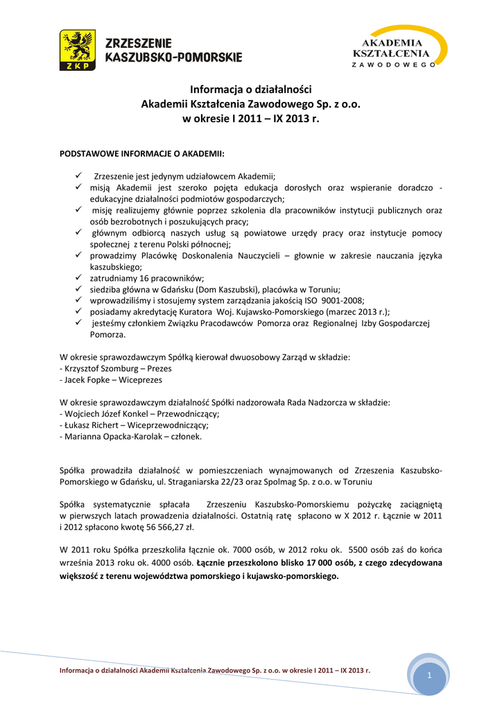 Informacja o działalności Akademii Kształcenia Zawodowego Sp. z o.o. w okresie I 2011 – IX 2013 r. PODSTAWOWE INFORMACJE O AKADEMII: Zrzeszenie jest jedynym udziałowcem Akademii; misją Akademii jest szeroko pojęta edukacja dorosłych oraz wspieranie doradczo edukacyjne działalności podmiotów gospodarczych; misję realizujemy głównie poprzez szkolenia dla pracowników instytucji publicznych oraz osób bezrobotnych i poszukujących pracy; głównym odbiorcą naszych usług są powiatowe urzędy pracy oraz instytucje pomocy społecznej z terenu Polski północnej; prowadzimy Placówkę Doskonalenia Nauczycieli – głownie w zakresie nauczania języka kaszubskiego; zatrudniamy 16 pracowników; siedziba główna w Gdańsku (Dom Kaszubski), placówka w Toruniu; wprowadziliśmy i stosujemy system zarządzania jakością ISO 9001-2008; posiadamy akredytację Kuratora Woj. Kujawsko-Pomorskiego (marzec 2013 r.); jesteśmy członkiem Związku Pracodawców Pomorza oraz Regionalnej Izby Gospodarczej Pomorza. W okresie sprawozdawczym Spółką kierował dwuosobowy Zarząd w składzie: - Krzysztof Szomburg – Prezes - Jacek Fopke – Wiceprezes W okresie sprawozdawczym działalność Spółki nadzorowała Rada Nadzorcza w składzie: - Wojciech Józef Konkel – Przewodniczący; - Łukasz Richert – Wiceprzewodniczący; - Marianna Opacka-Karolak – członek. Spółka prowadziła działalność w pomieszczeniach wynajmowanych od Zrzeszenia KaszubskoPomorskiego w Gdańsku, ul. Straganiarska 22/23 oraz Spolmag Sp. z o.o. w Toruniu Spółka systematycznie spłacała Zrzeszeniu Kaszubsko-Pomorskiemu pożyczkę zaciągniętą w pierwszych latach prowadzenia działalności. Ostatnią ratę spłacono w X 2012 r. Łącznie w 2011 i 2012 spłacono kwotę 56 566,27 zł. W 2011 roku Spółka przeszkoliła łącznie ok. 7000 osób, w 2012 roku ok. 5500 osób zaś do końca września 2013 roku ok. 4000 osób. Łącznie przeszkolono blisko 17 000 osób, z czego zdecydowana większość z terenu województwa pomorskiego i kujawsko-pomorskiego. Informacja o działalności Akademii Kształcenia Zawodowego Sp. z o.o. w okresie I 2011 – IX 2013 r. 1 NAJWAŻNIEJSZE ZLECENIA KOMERCYJNE: Warsztaty w ramach projektu systemowego: „Szkoła zawodowa szkoła pozytywnego wyboru” W latach 2011/2012 na zlecenie Krajowego Ośrodka Wspierania Edukacji Zawodowej i Ustawicznej Spółka zorganizowała 150 dwudniowych warsztatów dla 3100 dyrektorów szkół zawodowych z całej Polski oraz 1400 przedstawicieli Zamawiającego. Celem warsztatów było przygotowanie dyrektorów do wdrożenia rozwiązań służących podniesieniu jakości pracy szkół w związku z planowanymi na 2012 rok zmianami systemowymi obejmującymi: nowe podstawy programowe kształcenia w zawodach, konstrukcje szkolnych planów nauczania, tworzenie nowych programów nauczania dla zawodów, korelacji międzyprzedmiotowej. Wartość całego zamówienia wynosiła 2 386 200,00 zł. Szkolenia, wizyty studyjne, seminaria, konferencje dla pracowników pomocy społecznej W latach 2011-2013 Spółka na zlecenie Regionalnych Ośrodków Polityki Społecznej organizowała cykle szkoleń dla pracowników instytucji pomocy z ternu woj. pomorskiego i kujawsko-pomorskiego. Udział Spółki w realizowanych szkoleniach wynosił ponad 3 000 000 zł. Szkolenia egzaminacyjne dla członków Okręgowych Komisji Egzaminacyjnych W 2013 r. zrealizowano ponad 70. jednodniowych szkoleń dla 1400 członków Okręgowych Komisji Egzaminacyjnych z terenu województwa pomorskiego i kujawsko-pomorskiego. Szkolenia organizowane były wspólnie z WYG International na zlecenie Krajowego Ośrodka Wspierania Edukacji Zawodowej i Ustawicznej. DZIAŁALNOSĆ PROJEKTOWA SPÓŁKI: "PINI – program integracji niepełnosprawnych intelektualnie" (01.01.2011 – 31.12.2012) Projekt realizowany był w partnerstwie z Polskim Stowarzyszeniem na Rzecz Osób z Upośledzeniem Umysłowym (Koło w Gdańsku) w ramach VII priorytetu Programu Operacyjnego Kapitał Ludzki – Promocja integracji społecznej, działanie 7.2 Przeciwdziałanie wykluczeniu i wzmocnienie sektora ekonomii społecznej, poddziałanie 7.2.1 Aktywizacja zawodowa i społeczna osób zagrożonych wykluczeniem społecznym. Grupę docelową w projekcie stanowiły osoby posiadające miejsce zamieszkania na terenie województwa pomorskiego, z niepełnosprawnością intelektualną, niezatrudnione, w wieku aktywności zawodowej, zagrożone wykluczeniem społecznym z powodu niepełnosprawności, posiadające lekki, umiarkowany lub znaczny stopień niepełnosprawności. W ramach projektu zaktywizowano 60 osób, w tym 36 kobiet i 24 mężczyzn. Dodatkowym wsparciem zostali objęci także rodzice i opiekunowie osób niepełnosprawnych intelektualnie oraz 40 pracowników i współpracowników ośrodków i instytucji wspierających te osoby. Wartość projektu: 1 046 289,12 zł. „Akademia Samorządowca II” (01.07.2011-30.06.2013) Projekt realizowany był na rzecz partnerstwa samorządów: Gminy Miejskiej Starogard Gdański, Gminy Miejskiej Tczew, Gminy Tczew oraz Gminy Dzierzgoń w ramach V priorytetu Programu Operacyjnego Kapitał Ludzki - Dobre Rządzenie, działanie 5.2 Wzmocnienie potencjału administracji samorządowej, poddziałanie 5.2.1 Modernizacja zarządzania w administracji samorządowej. Grupę docelową projektu stanowiło 300 pracowników urzędów gmin partnerskich, w tym 192 kobiety i 60 osób w wieku powyżej 45 lat. Dla wszystkich uczestników przewidziano - 20 edycji szkoleń w ramach zadania „Państwo Prawa” z następujących tematów: „Zarządzanie sobą w czasie”, „Kodeks Postępowania Administracyjnego”, Zarządzanie ryzykiem” i „Kontrola zarządcza” oraz 20 edycji „Warsztatów profesjonalnej obsługi klienta”. Dla osób z grupy 45+ przewidziano dodatkowe wsparcie w postaci szkoleń: „Excel dla zaawansowanych” oraz „Warsztaty dla mentorów”. Ponadto dla Informacja o działalności Akademi