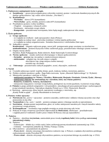 Vademecum gimnazjalisty Wiedza o społeczeństwie Elżbieta Kaźmierska 1. Podstawowe umiejętności życia w grupie. a) Socjalizacja – proces przyswajania przez człowieka wartości, postaw i zachowań charakterystycznych dla danego społeczeństwa (np. rodzic mówi dziecku: „Nie kłam”). b) Komunikacja - Werbalna - słowa (35% komunikatu) - Niewerbalna - gesty, mimika, postawa ciała (65% komunikatu) c) Przykładowe postawy wobec konfliktu: - Uległość – rezygnacja z własnych celów - Dominacja – narzucanie swego zdania - Kompromis – poszukiwanie rozwiązania, które będą mogły zaakceptować obie strony 2. Życie społeczne. a) Grupy społeczne - ze względu na wielkość: małe (przyjaciele) i duże (Polacy) - ze względu na rodzaj więzi: pierwotne (rodzina) i wtórne (partia polityczna) - ze względu na rodzaj zorganizowania: formalne (harcerstwo) i nieformalne (fani rapu) b) Jednostka w grupie: Konformizm – uleganie wpływom grupy, nawet jeśli postępowanie grupy uważamy za niewłaściwe nonkonformizm – postawa krytyczna wobec zachowań grypy, prezentowanie własnego sytemu wartości c) Organy naszej szkoły: Dyrektor, Rada Pedagogiczna, Rada rodziców, Rada Samorządu Uczniowskiego d) Normy społeczne – zasady zachowań obowiązujące w danym społeczeństwie: - formalne – prawne (np. nie parkuj w niedozwolonym miejscu) - nieformalne: religijne (np. nie jedz mięsa w piątek) obyczajowe (np. ustąp miejsca osobie starszej) moralne (np. nie kłam) e) Tolerancja – poszanowanie cudzych poglądów, uczuć, obyczajów, zachowań. 3. Naród a) Czynniki jednoczące naród: wspólne dzieje, język, tradycja, kultura, terytorium, państwo. b) Polskie symbole narodowe: godło, flaga biało-czerwona, hymn „Mazurek Dąbrowskiego” (J. Wybicki) c) Mniejszości narodowe i etniczne w Polsce - mniejszości narodowe to: Niemcy, Ukraińcy, Białorusini, Rosjanie, Ormianie, Litwini, Żydzi , Słowacy - mniejszości etniczne nie utożsamiają się z narodem, który ma własne państwo: Romowie, Łemkowie, Tatarzy, Karaimowie. - mniejszości mają prawo: rozwijać swoją kulturę, posługiwać się swoim językiem, wyznawać swoją religię d) Polonia to grupy polskich emigrantów i ich potomków, mieszkających poza granicami kraju i zachowujących swoją tożsamość narodową. Największe skupiska Polonii są w: USA, Niemczech, Brazylii. e) Stereotyp – uproszczony obraz innych, najczęściej wynikający z niewiedzy, np. „Każdy Polak to pijak” „Każdy Muzułmanin to terrorysta” 4. Postawy wobec ojczyzny: a) Patriotyzm (łac. patria = ojczyzna) – postawa szacunku, umiłowania i oddania własnej ojczyźnie oraz chęć ponoszenia za nią ofiar b) Nacjonalizm (z łac. natio = naród) – postawa uznająca sprawy własnego narodu za najważniejsze. c) Szowinizm - skrajna postać nacjonalizmu, głosi, że wobec mniejszości narodowych i innych narodów należy przyjmować wrogą postawę. d) Kosmopolityzm − zwolennicy tego poglądu uważają za swoją ojczyznę cały świat. e) Podczas II wojny światowej szowinizm odprowadził do Holocaustu. (Holocaust – prześladowania i zagłada prawie 6 milionów Żydów przez władze III Rzeszy oraz jej sojuszników) 5. Państwo a) Państwo – określone terytorium, zamieszkałe przez trwałą wspólnotę ludzi, która podlega suwerennej (niezależnej) władzy. b) Państwa: - Federacyjne – składa się z wielu części, które zachowują pewną niezależność (autonomię) np. USA. - Unitarne – wewnętrznie jednolite np. Polska, Francja, Czechy. c) Obywatelstwo – przynależność do państwa: - Prawo krwi – dziecko otrzymuje obywatelstwo rodziców (np. w Polsce); o nadaniu obywatelstwa polskiego cudzoziemcom orzeka Prezydent RP. - Prawo ziemi – dziecko otrzymuje obywatelstwo państwa, na terytorium którego się urodziło (np. w USA) 6. Ustroje państwa a) Ustroje polityczne: - demokracja – rządy ogółu obywateli - autorytaryzm – rządy oparte na autorytecie przywódcy, ograniczona demokracja; przykład: Polska w latach 1926-39 po zamachu majowym J. Piłsudskiego. - totalitaryzm – rządy dyktatora oparte na terrorze, represje wobec przeciwników; przykład: ZSRR – Józef Stalin (1924-53), III Rzesza – Adolf Hitler (1933-45). b) Formy rządów: - Monarchia – głową państwa jest dożywotnio władca (król, książę, cesarz). Przykłady monarchii: Starożytny Egipt – despotyczna Polska pierwszych Piastów – patrymonialna Polska Kazimierza Wielkiego – stanowa Francja Ludwika XIV – absolutna Współczesna Wielka Brytania – monarchia parlamentarna - Republika – władza jest wyłaniana na określona kadencję podczas wyborów. 7. Demokratyczne państwo. a) cechy demokratycznego państwa: opiera się na rządach większości, szanuje prawa mniejszości, jest pluralizm polityczny (dwie lub więcej partii) b) tradycje demokracji: - antyczna – starożytna Grecja, czasy Peryklesa, V w.p.n.e, Zgromadzenie Ludowe (tylko mężczyźni); - amerykańska – w 1776 „Deklaracja niepodległości”, w 1787 – pierwsza konstytucja na świecie; - polska – od 1493 sejm (król + izba poselska + senat), w 1791 – pierwsza konstytucja w Europie; c) rozdaje demokracji: - demokracja bezpośrednia – decyzje w konkretnej sprawie podejmują obywatele (referendum, plebiscyt); - demokracja pośrednia – decyzje podejmują wybrani przedstawiciele (radni, posłowie, senatorowie) lub - demokracja konstytucyjna – najważniejsze jest prawo; - demokracja większościowa - najważniejsza jest wola ludu (prawo nie ogranicza władzy większości). d) zalety demokracji: obywatele mają zagwarantowane prawa np. wolność słowa; e) wady demokracji: naiwny wyborca może zagłosować na nieuczciwą osobę, która w mediach robi dobre wrażenie. 8. Udział obywateli w życiu publicznym: a) organizacje pozarządowe – nie działają dla zysku (non profit) - stowarzyszenia np. Stowarzyszenie MONAR - fundacje np. W