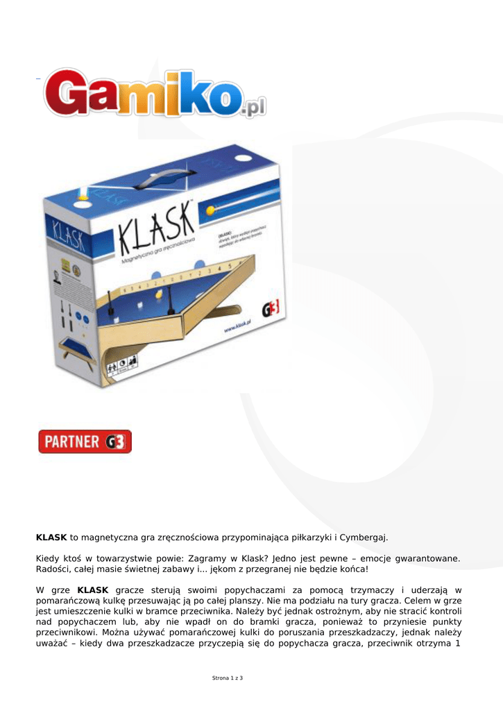 KLASK to magnetyczna gra zręcznościowa przypominająca piłkarzyki i Cymbergaj. Kiedy ktoś w towarzystwie powie: Zagramy w Klask? Jedno jest pewne – emocje gwarantowane. Radości, całej masie świetnej zabawy i... jękom z przegranej nie będzie końca! W grze KLASK gracze sterują swoimi popychaczami za pomocą trzymaczy i uderzają w pomarańczową kulkę przesuwając ją po całej planszy. Nie ma podziału na tury gracza. Celem w grze jest umieszczenie kulki w bramce przeciwnika. Należy być jednak ostrożnym, aby nie stracić kontroli nad popychaczem lub, aby nie wpadł on do bramki gracza, ponieważ to przyniesie punkty przeciwnikowi. Można używać pomarańczowej kulki do poruszania przeszkadzaczy, jednak należy uważać – kiedy dwa przeszkadzacze przyczepią się do popychacza gracza, przeciwnik otrzyma 1 Strona 1 z 3 punkt. Osoba, która jako pierwsza zdobędzie 6 punktów, wygrywa! KLASK to: Rywalizacja – wszyscy będą się świetnie bawić: dzieci z rodzicami, dziewczyna z chłopakiem, paczka kumpli, koleżanki z pracy... Każda partia będzie równie zacięta. Taktyka – strategiczne myślenie, właściwa taktyka i uważne obserwowanie każdego ruchu przeciwnika to podstawa w tej grze. Zabawa – mimo całej masy rywalizacji i sporej ilości taktyki, Klask to przede wszystkim świetna zabawa, w której mottem przewodnim jest: Radość grania! Zawartość pudełka: 4 przeszkadzacze (w tym 1 zapasowy) stół (drewniana plansza) Klask 2 magnetyczne dwuczęściowe sterówki (popychacz i trzymacz) 2 znaczniki punktów 2 kulki (w tym 1 zapasowa) woreczek do przechowywania instrukcja Wiek 8+ Liczba graczy 2 Czas gry ok. 10 minut Instrukcja polska Wydanie Strona 2 z 3 polskie Producent G3 Projektant Mikkel Bertelsen Strona 3 z 3