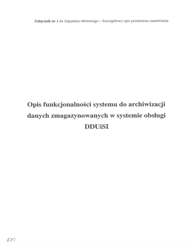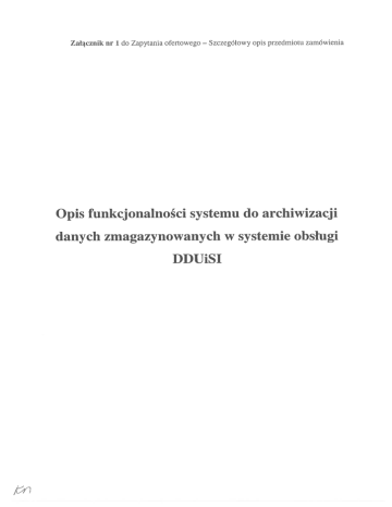 Załącznik nr 1 do Zapytania ofertowego — Szczegółowy opis przedmiotu zamówienia Opis funkcjonalności systemu do archiwizacji danych zmagazynowanych w systemie obsługi DDU1SI 1. Wstęp System powinien umożliwić zapisanie zawartości kompletnej bazy dokumentów dostępnych w systemie obsługi DDUiSI (DocuShare) w postaci archiwalnej zgodnej z następującymi roz porządzeniami: • rozporządzenie Ministra Spraw Wewnętrznych i Administracji z dnia 30 października 2006 r. w sprawie niezbędnych elementów struktury dokumentów elektronicznych (Dz. U. Nr 206, poz. 1517), • rozporządzenie Ministra Spraw Wewnętrznych i Administracji z dnia 2 listopada 2006 r. w sprawie wymagań technicznych formatów zapisu i informatycznych nośni ków danych, na których utrwalono materiały archiwalne przekazywane do archiwów państwowych (Dz. U. Nr 206, poz. 1519). Dodatkowe zalecenia dotyczące postaci metadanych są dostępne na stronie: http ://archiwa.goy.pl/pl/dokument-elektroniczny/3 63-projekt-obj anie-do-elementow struktury.html Przy zapisywaniu powinny zostać uzupełnione metadane dokumentów oraz spraw w takim zakresie, w jakim jest to możliwe na podstawie informacji zapisanych w systemie obsługi DDUiSI. Szczegółowy zakres metadanych oraz sposób ich określania zostaną uzgodnione przez Zamawiającego i Wykonawcę w trakcie realizacji przedsięwzięcia. Wynikowa postać danych ma być zapisana w folderze dyskowym lub sieciowym w trzech podfolderach, nazwanych dokumeiity, tnetadane i sprawy. 2. Dokumenty Folder dokunzenly ma zawierać wszystkie pliki zapisane w systemie obsługi DDUiSI. W przypadku szczotek i ich podpisów (wersja systemu z 2014 r.) oba pliki mają być połączo ne i zapisane w postaci jednego archiwum ZIP. Nazwa każdego pliku musi być unikalna, przy czym nazwy plików należących do poszczególnych spraw powinny mieć wspólny rdzeń. Na zwa nie może być dłuższa niż 30 znaków. Wykonawca może w szczególności wykorzystać istniejące nazwy dokumentów w systemie obsługi DDUiSI (znak sprawy i numer kolejny dokumentu dla wersji 2014, sztuczny znak sprawy z kategorią 05110 i numerem kolejnym dokumentu dla wersji wcześniejszych). Typ (rozszerzenie) każdego pliku pozostaje takie, jak w systemie obsługi DDUiSI. Dla każdego dokumentu z folderu dokumenty folder metadane ma zawierać plik XML opisu jący dokument. Nazwa pliku jest identyczna z nazwą pliku zawierającego dokument. Plik zawiera co najmniej następujące metadane: • identyfikator • twórca skrót „RCL” oraz imię i nazwisko osoby, która dodała dokument do systemu — identyczny z nazwą dokumentu; (bez określania funkcji); • tytuł tytuł aktu prawnego, z którym jest związany dokument (tak jak jest on podany — w opisie sprawy) połączony z opisem dokumentu (np. „szczotka”); data załączenia dokumentu do systemu obsługi DDUiSI; • data • format — — format dokumentu, zgodnie ze standardem MIME, z uwzględnieniem roz miaru (w bajtach); • dostęp zawsze „wszystko”; • typ — kategoria „tekst” oraz rodzaj dokumentu zapisany w systemie obsługi DDUiSI (np. szczotka do ogłoszenia); szczegółowy algorytm określania rodzaju dokumentów sprzed 2014 r. zostanie określony w fazie analizy; • status status zapisany w systemie obsługi DDUiSI (np. „częściowy”); • grupowanie (agregacja) — identyfikator sprawy, do której należy dokument (znak sprawy). Format metadanych ma być zgodny z rozporządzeniami powołanymi we wstępie i z reko mendacją dostępną na stronie Naczelnej Dyrekcji Archiwów Państwowych. Szczegółowy wykaz metadanych i sposób ich zapisu zostaną uzgodnione przez Zamawiającego i Wyko nawcę w trakcie realizacji przedsięwzięcia. 3. Sprawy Folder sprawy zawiera plik XML dla każdej sprawy zapisanej w systemie obsługi DDUiSI (dla każdego aktu prawnego). Nazwa pliku odpowiada znakowi sprawy. Plik zawiera co naj mniej następujące metadane: • identyfikator — znak sprawy (dla spraw sprzed 2014 r. określona na podstawie nazwy pliku zawierającego wizę); • tytuł — tytuł aktu prawnego, tak jak jest on wpisany w systemie obsługi DDUiSI; • data wydania data wydania aktu w dzienniku urzędowym (określona na podstawie atrybutu sprawy albo daty załączenia pozycji sprawy w systemie obsługi DDUiSI); dla aktów wydanych przez 2012 r.; • numer dziennika • pozycja • twórca redaktor, na którego zadekretowano daną sprawę (może być kilku redakto — — pozycja, pod którą wydano akt prawny; rów), Dziennik Ustaw lub Monitor Polski; • rodzaj wydania • dostęp zawsze „wszystko”; • rodzaj aktu prawnego ze słownika; • data stworzenia; • data założenia sprawy; • data wizowania — — data utworzenia pliku wizy. Szczegółowy zakres metadanych oraz sposób ich określania, a także sposób zapisu w struktu rze XML numeru dziennika, pozycji, rodzaju wydania i rodzaju aktu prawnego zostaną uzgodnione przez Zamawiającego i Wykonawcę w trakcie realizacji przedsięwzięcia.