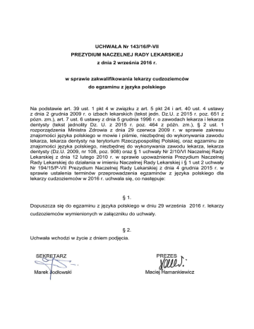 UCHWAŁA Nr 143/16/P-VII PREZYDIUM NACZELNEJ RADY LEKARSKIEJ z dnia 2 września 2016 r. w sprawie zakwalifikowania lekarzy cudzoziemców do egzaminu z języka polskiego Na podstawie art. 39 ust. 1 pkt 4 w związku z art. 5 pkt 24 i art. 40 ust. 4 ustawy z dnia 2 grudnia 2009 r. o izbach lekarskich (tekst jedn. Dz.U. z 2015 r. poz. 651 z pózn. zm.), art. 7 ust. 6 ustawy z dnia 5 grudnia 1996 r. o zawodach lekarza i lekarza dentysty (tekst jednolity Dz. U. z 2015 r. poz. 464 z późn. zm.), § 2 ust. 1 rozporządzenia Ministra Zdrowia z dnia 29 czerwca 2009 r. w sprawie zakresu znajomości języka polskiego w mowie i piśmie, niezbędnej do wykonywania zawodu lekarza, lekarza dentysty na terytorium Rzeczypospolitej Polskiej, oraz egzaminu ze znajomości języka polskiego, niezbędnej do wykonywania zawodu lekarza, lekarza dentysty (Dz.U. 2009, nr 108, poz. 908) oraz § 1 uchwały Nr 2/10/VI Naczelnej Rady Lekarskiej z dnia 12 lutego 2010 r. w sprawie upoważnienia Prezydium Naczelnej Rady Lekarskiej do działania w imieniu Naczelnej Rady Lekarskiej i § 1 ust 2 uchwały Nr 194/15/P-VII Prezydium Naczelnej Rady Lekarskiej z dnia 4 grudnia 2015 r. w sprawie ustalenia terminów przeprowadzenia egzaminów z języka polskiego dla lekarzy cudzoziemców w 2016 r. uchwala się, co następuje: § 1. Dopuszcza się do egzaminu z języka polskiego w dniu 29 września 2016 r. lekarzy cudzoziemców wymienionych w załączniku do uchwały. § 2. Uchwała wchodzi w życie z dniem podjęcia. Załącznik do uchwały PNRL Nr 143/16/P-VII z dnia 02.09.2016 r. Lista lekarzy cudzoziemców zakwalifikowanych do egzaminu z języka polskiego w dniu 29 września 2016 r. Lekarze: 1. Maksim Son 2. Rudiger Schmidt 3. Alla Snicere 4. Jolanta Juniewicz 5. Isidora Lazrevic 6. Adam Plotka 7. Michael Sieniawski 8. Anna Alexandra Rogalski 9. Irena Krupienko 10. Natalia Okhrymovych 11. Julia Lominska 12. Natalia Mąsior 13. Andriy Yarka 14. Igor Mokryk 15. Tetiana Lohrynovska 16. Iryna Khozylo 17. Anna Kuboth Kanada Niemcy Łotwa Republika Litewska Szwecja Wielka Brytania Niemcy Niemcy Białoruś Ukraina Ukraina Ukraina Ukraina Ukraina Ukraina Ukraina Polska/Niemcy 2