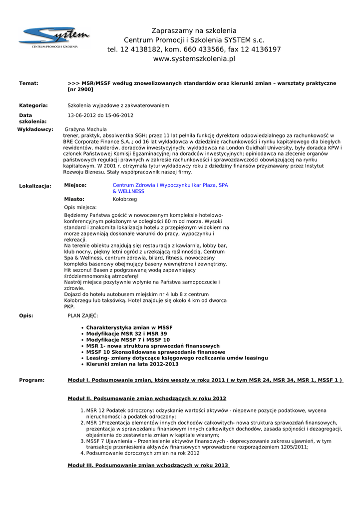 Zapraszamy na szkolenia Centrum Promocji i Szkolenia SYSTEM s.c. tel. 12 4138182, kom. 660 433566, fax 12 4136197 www.systemszkolenia.pl Temat: >>> MSR/MSSF według znowelizowanych standardów oraz kierunki zmian – warsztaty praktyczne [nr 2900] Kategoria: Szkolenia wyjazdowe z zakwaterowaniem Data szkolenia: 13-06-2012 do 15-06-2012 Wykładowcy: Lokalizacja: Grażyna GrażynaMachula Machula trener, trener,praktyk, praktyk,absolwentka absolwentkaSGH; SGH;przez przez11 11lat latpełniła pełniłafunkcję funkcjędyrektora dyrektoraodpowiedzialnego odpowiedzialnegoza zarachunkowość rachunkowośćww BRE BRECorporate CorporateFinance FinanceS.A..; S.A..;od od16 16lat latwykładowca wykładowcawwdziedzinie dziedzinierachunkowości rachunkowościi irynku rynkukapitałowego kapitałowegodla dlabiegłych biegłych rewidentów, rewidentów,maklerów, maklerów,doradców doradcówinwestycyjnych; inwestycyjnych;wykładowca wykładowcana naLondon LondonGuidhall GuidhallUniversity, University,były byłydoradca doradcaKPW KPWi i członek członekPaństwowej PaństwowejKomisji KomisjiEgzaminacyjnej Egzaminacyjnejna nadoradców doradcówinwestycyjnych; inwestycyjnych;opiniodawca opiniodawcana nazlecenie zlecenieorganów organów państwowych państwowychregulacji regulacjiprawnych prawnychwwzakresie zakresierachunkowości rachunkowościi isprawozdawczości sprawozdawczościobowiązującej obowiązującejna narynku rynku kapitałowym. kapitałowym.WW2001 2001r.r.otrzymała otrzymałatytuł tytułwykładowcy wykładowcyroku rokuzzdziedziny dziedzinyfinansów finansówprzyznawany przyznawanyprzez przezInstytut Instytut Rozwoju RozwojuBiznesu. Biznesu.Stały Staływspółpracownik współpracowniknaszej naszejfirmy. firmy. Miejsce: Miejsce: Centrum Zdrowia i Wypoczynku Ikar Plaza, SPA Centrum Zdrowia i Wypoczynku Ikar Plaza, SPA && WELLNESS WELLNESS Miasto: Miasto: Opis miejsca: Opis miejsca: Kołobrzeg Kołobrzeg Będziemy Państwa gościć ww nowoczesnym kompleksie hotelowoBędziemy Państwa gościć nowoczesnym kompleksie hotelowokonferencyjnym położonym ww odległości 6060 mm odod morza. Wysoki konferencyjnym położonym odległości morza. Wysoki standard i znakomita lokalizacja hotelu z przepięknym widokiem nana standard i znakomita lokalizacja hotelu z przepięknym widokiem morze zapewniają doskonałe warunki dodo pracy, wypoczynku i i morze zapewniają doskonałe warunki pracy, wypoczynku rekreacji. rekreacji. NaNa terenie obiektu znajdują się: restauracja z kawiarnią, lobby bar, terenie obiektu znajdują się: restauracja z kawiarnią, lobby bar, klub nocny, piękny letni ogród z urzekającą roślinnością, Centrum klub nocny, piękny letni ogród z urzekającą roślinnością, Centrum Spa && Wellness, centrum zdrowia, bilard, fitness, nowoczesny Spa Wellness, centrum zdrowia, bilard, fitness, nowoczesny kompleks basenowy obejmujący baseny wewnętrzne i zewnętrzny. kompleks basenowy obejmujący baseny wewnętrzne i zewnętrzny. HitHit sezonu! Basen z podgrzewaną wodą zapewniający sezonu! Basen z podgrzewaną wodą zapewniający śródziemnomorską atmosferę! śródziemnomorską atmosferę! Nastrój miejsca pozytywnie wpłynie nana Państwa samopoczucie i i Nastrój miejsca pozytywnie wpłynie Państwa samopoczucie zdrowie. zdrowie. Dojazd dodo hotelu autobusem miejskim nrnr 44 lub 88 z centrum Dojazd hotelu autobusem miejskim lub z centrum Kołobrzegu lub taksówką. Hotel znajduje się około 44 km odod dworca Kołobrzegu lub taksówką. Hotel znajduje się około km dworca PKP. PKP. Opis: PLAN ZAJĘĆ: Charakterystyka zmian w MSSF Modyfikacje MSR 32 i MSR 39 Modyfikacje MSSF 7 i MSSF 10 MSR 1- nowa struktura sprawozdań finansowych MSSF 10 Skonsolidowane sprawozdanie finansowe Leasing- zmiany dotyczące księgowego rozliczania umów leasingu Kierunki zmian na lata 2012-2013 Program: Moduł I. Podsumowanie zmian, które weszły w roku 2011 ( w tym MSR 24, MSR 34, MSR 1, MSSF 1 ) Moduł II. Podsumowanie zmian wchodzących w roku 2012 1. MSR 12 Podatek odroczony: odzyskanie wartości aktywów - niepewne pozycje podatkowe, wycena nieruchomości a podatek odroczony; 2. MSR 1Prezentacja elementów innych dochodów całkowitych- nowa struktura sprawozdań finansowych, prezentacja w sprawozdaniu finansowym innych całkowitych dochodów, zasada spójności i dezagregacji, objaśnienia do zestawienia zmian w kapitale własnym; 3. MSSF 7 Ujawnienia – Przeniesienie aktywów finansowych - doprecyzowanie zakresu ujawnień, w tym transakcje przeniesienia aktywów finansowych wprowadzone rozporządzeniem 1205/2011; 4. Podsumowanie dorocznych zmian na rok 2012 Moduł III. Podsumowanie zmian wchodzących w roku 2013 1. Charakterystyka projektu MSSF 9 w tym: informacje ogólne dotyczące charakteru zmian, zachowanie porównywalności, okres obowiązywania standardu, wymagania dotyczące klasyfikacji i wyceny aktywów finansowych (instrumentów dłużnych i kapitałowych), model klasyfikacji aktywów finansowych wchodzących w zakres MSSF 9, test modelu biznesowego oraz test charakterystyki umownych przepływów pieniężnych, kryteria wyceny po koszcie zamortyzowanym, nowa kategoria wyceny - aktywa finansowe wyceniane w wartości godziwej przez inne całkowite dochody, ujmowanie utraty wartości ograniczone do aktywów wycenianych po koszcie zamortyzowanym, zlikwidowanie kategorii aktywów dostępnych do sprzedaży, zlikwidowanie kategorii aktywów utrzymywanych do terminu wymagalności, pochodne instrumenty wbudowane, wyeliminowanie wyceny nie notowanych inwestycji kapitałowych po koszcie z uwzględnieniem utraty wartości, kredyty bez prawa regresu, instrumenty powiązane umownie, reklasyfikacja, skutki wprowadzenia MSSF 9, zagadnienia związane ze zobowiązaniami; klasyfikacja praw poboru 2. Charakterystyka MSSF 10 Skonsolidowane sprawozdanie finansowe oraz MSR 27 Jednostkowe sprawozdania finansowe 3. Zmiany w regulacjach Regulacje MSR 28 „Inwestycje w jednostkach stowarzyszonych i w