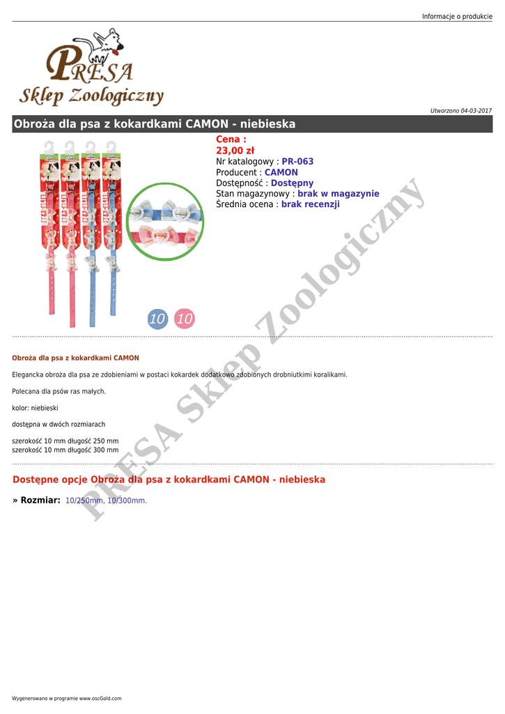 Informacje o produkcie Utworzono 04-03-2017 Obroża dla psa z kokardkami CAMON - niebieska Cena : 23,00 zł le p Zo o lo gi cz ny Nr katalogowy : PR-063 Producent : CAMON Dostępność : Dostępny Stan magazynowy : brak w magazynie Średnia ocena : brak recenzji Obroża dla psa z kokardkami CAMON Polecana dla psów ras małych. kolor: niebieski ES A dostępna w dwóch rozmiarach Sk Elegancka obroża dla psa ze zdobieniami w postaci kokardek dodatkowo zdobionych drobniutkimi koralikami. szerokość 10 mm długość 250 mm szerokość 10 mm długość 300 mm PR Dostępne opcje Obroża dla psa z kokardkami CAMON - niebieska » Rozmiar: 10/250mm, 10/300mm. Wygenerowano w programie www.oscGold.com