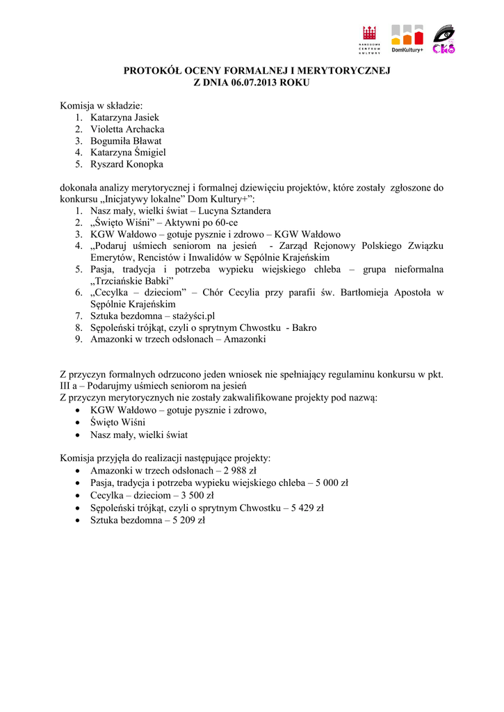 PROTOKÓŁ OCENY FORMALNEJ I MERYTORYCZNEJ Z DNIA 06.07.2013 ROKU Komisja w składzie: 1. Katarzyna Jasiek 2. Violetta Archacka 3. Bogumiła Bławat 4. Katarzyna Śmigiel 5. Ryszard Konopka dokonała analizy merytorycznej i formalnej dziewięciu projektów, które zostały zgłoszone do konkursu „Inicjatywy lokalne” Dom Kultury+”: 1. Nasz mały, wielki świat – Lucyna Sztandera 2. „Święto Wiśni” – Aktywni po 60-ce 3. KGW Wałdowo – gotuje pysznie i zdrowo – KGW Wałdowo 4. „Podaruj uśmiech seniorom na jesień - Zarząd Rejonowy Polskiego Związku Emerytów, Rencistów i Inwalidów w Sępólnie Krajeńskim 5. Pasja, tradycja i potrzeba wypieku wiejskiego chleba – grupa nieformalna „Trzciańskie Babki” 6. „Cecylka – dzieciom” – Chór Cecylia przy parafii św. Bartłomieja Apostoła w Sępólnie Krajeńskim 7. Sztuka bezdomna – stażyści.pl 8. Sępoleński trójkąt, czyli o sprytnym Chwostku - Bakro 9. Amazonki w trzech odsłonach – Amazonki Z przyczyn formalnych odrzucono jeden wniosek nie spełniający regulaminu konkursu w pkt. III a – Podarujmy uśmiech seniorom na jesień Z przyczyn merytorycznych nie zostały zakwalifikowane projekty pod nazwą: KGW Wałdowo – gotuje pysznie i zdrowo, Święto Wiśni Nasz mały, wielki świat Komisja przyjęła do realizacji następujące projekty: Amazonki w trzech odsłonach – 2 988 zł Pasja, tradycja i potrzeba wypieku wiejskiego chleba – 5 000 zł Cecylka – dzieciom – 3 500 zł Sępoleński trójkąt, czyli o sprytnym Chwostku – 5 429 zł Sztuka bezdomna – 5 209 zł