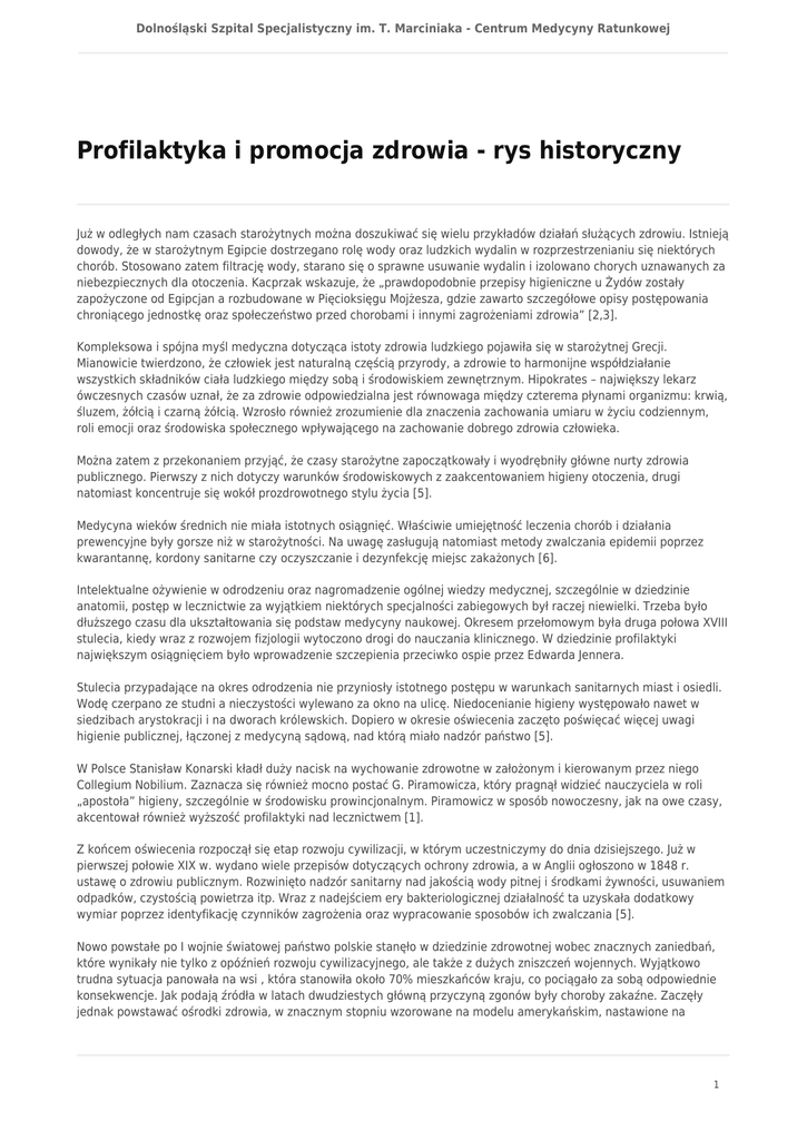 Dolnośląski Szpital Specjalistyczny im. T. Marciniaka - Centrum Medycyny Ratunkowej Profilaktyka i promocja zdrowia - rys historyczny Już w odległych nam czasach starożytnych można doszukiwać się wielu przykładów działań służących zdrowiu. Istnieją dowody, że w starożytnym Egipcie dostrzegano rolę wody oraz ludzkich wydalin w rozprzestrzenianiu się niektórych chorób. Stosowano zatem filtrację wody, starano się o sprawne usuwanie wydalin i izolowano chorych uznawanych za niebezpiecznych dla otoczenia. Kacprzak wskazuje, że „prawdopodobnie przepisy higieniczne u Żydów zostały zapożyczone od Egipcjan a rozbudowane w Pięcioksięgu Mojżesza, gdzie zawarto szczegółowe opisy postępowania chroniącego jednostkę oraz społeczeństwo przed chorobami i innymi zagrożeniami zdrowia” [2,3]. Kompleksowa i spójna myśl medyczna dotycząca istoty zdrowia ludzkiego pojawiła się w starożytnej Grecji. Mianowicie twierdzono, że człowiek jest naturalną częścią przyrody, a zdrowie to harmonijne współdziałanie wszystkich składników ciała ludzkiego między sobą i środowiskiem zewnętrznym. Hipokrates – największy lekarz ówczesnych czasów uznał, że za zdrowie odpowiedzialna jest równowaga między czterema płynami organizmu: krwią, śluzem, żółcią i czarną żółcią. Wzrosło również zrozumienie dla znaczenia zachowania umiaru w życiu codziennym, roli emocji oraz środowiska społecznego wpływającego na zachowanie dobrego zdrowia człowieka. Można zatem z przekonaniem przyjąć, że czasy starożytne zapoczątkowały i wyodrębniły główne nurty zdrowia publicznego. Pierwszy z nich dotyczy warunków środowiskowych z zaakcentowaniem higieny otoczenia, drugi natomiast koncentruje się wokół prozdrowotnego stylu życia [5]. Medycyna wieków średnich nie miała istotnych osiągnięć. Właściwie umiejętność leczenia chorób i działania prewencyjne były gorsze niż w starożytności. Na uwagę zasługują natomiast metody zwalczania epidemii poprzez kwarantannę, kordony sanitarne czy oczyszczanie i dezynfekcję miejsc zakażonych [6]. Intelektualne ożywienie w odrodzeniu oraz nagromadzenie ogólnej wiedzy medycznej, szczególnie w dziedzinie anatomii, postęp w lecznictwie za wyjątkiem niektórych specjalności zabiegowych był raczej niewielki. Trzeba było dłuższego czasu dla ukształtowania się podstaw medycyny naukowej. Okresem przełomowym była druga połowa XVIII stulecia, kiedy wraz z rozwojem fizjologii wytoczono drogi do nauczania klinicznego. W dziedzinie profilaktyki największym osiągnięciem było wprowadzenie szczepienia przeciwko ospie przez Edwarda Jennera. Stulecia przypadające na okres odrodzenia nie przyniosły istotnego postępu w warunkach sanitarnych miast i osiedli. Wodę czerpano ze studni a nieczystości wylewano za okno na ulicę. Niedocenianie higieny występowało nawet w siedzibach arystokracji i na dworach królewskich. Dopiero w okresie oświecenia zaczęto poświęcać więcej uwagi higienie publicznej, łączonej z medycyną sądową, nad którą miało nadzór państwo [5]. W Polsce Stanisław Konarski kładł duży nacisk na wychowanie zdrowotne w założonym i kierowanym przez niego Collegium Nobilium. Zaznacza się również mocno postać G. Piramowicza, który pragnął widzieć nauczyciela w roli „apostoła” higieny, szczególnie w środowisku prowincjonalnym. Piramowicz w sposób nowoczesny, jak na owe czasy, akcentował również wyższość profilaktyki nad lecznictwem [1]. Z końcem oświecenia rozpoczął się etap rozwoju cywilizacji, w którym uczestniczymy do dnia dzisiejszego. Już w pierwszej połowie XIX w. wydano wiele przepisów dotyczących ochrony zdrowia, a w Anglii ogłoszono w 1848 r. ustawę o zdrowiu publicznym. Rozwinięto nadzór sanitarny nad jakością wody pitnej i środkami żywności, usuwaniem odpadków, czystością powietrza itp. Wraz z nadejściem ery bakteriologicznej działalność ta uzyskała dodatkowy wymiar poprzez identyfikację czynników zagrożenia oraz wypracowanie sposobów ich zwalczania [5]. Nowo powstałe po I wojnie światowej państwo polskie stanęło w dziedzinie zdrowotnej wobec znacznych zaniedbań, które wynikały nie tylko z opóźnień rozwoju cywilizacyjnego, ale także z dużych zniszczeń wojennych. Wyjątkowo trudna sytuacja panowała na wsi , która stanowiła około 70% mieszkańców kraju, co pociągało za sobą odpowiednie konsekwencje. Jak podają źródła w latach dwudziestych główną przyczyną zgonów były choroby zakaźne. Zaczęły jednak powstawać ośrodki zdrowia, w znacznym stopniu wzorowane na modelu amerykańskim, nastawione na 1 Dolnośląski Szpital Specjalistyczny im. T. Marciniaka - Centrum Medycyny Ratunkowej działalność higieniczno-oświatowo-wychowawczą. Potrzeby jakie zaistniały w ówczesnych warunkach wymagały nie tylko zapobiegania ale i również specjalistycznej działalności leczniczej, w tym szczególnie leczenia chorób wenerycznych, jaglicy czy gruźlicy. Przez co najmniej 20 lat po zakończeniu II wojny światowej stan zdrowia ludności Polski uległ dynamicznej poprawie. Zachodzące w kraju przemiany dawały znaczne efekty zdrowotne: spadek umieralności niemowląt, ograniczenie chorób zakaźnych, wydłużenie przeciętnego czasu trwania życia [7]. Początkowe korzystne zmiany sytuacji zdrowotnej wynikały głównie z ogólnej poprawy warunków bytowych i sanitarnych, upowszechnienie szczepień oraz powstanie sprawnej służby sanitarno-epidemiologicznej. W Polsce 25 lat po wojnie rozpoczął się okres mniej pomyślny, podobnie jak we wszystkich krajach Europy Środkowej i Wschodniej, reprezentujących ten sam system społeczno-polityczny. Głębszy kryzys w tych krajach m.in. niekorzystnie rzutował na warunki zdrowotne, włączając w to zachowania zdrowotne i styl życia mieszkańców. Na przestrzeni ostatnich 50 lat przeprowadzono tysiące badań epidemiologicznych, 