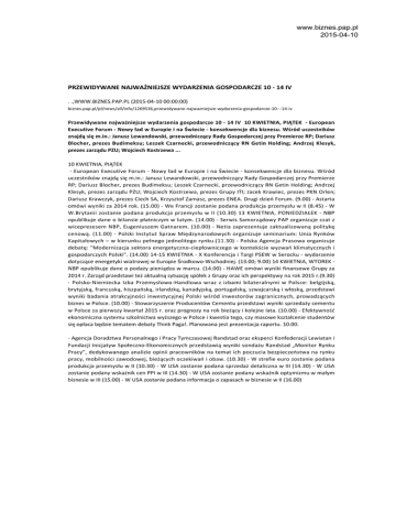 www.biznes.pap.pl 2015-04-10 PRZEWIDYWANE NAJWAŻNIEJSZE WYDARZENIA GOSPODARCZE 10 - 14 IV . .,WWW.BIZNES.PAP.PL (2015-04-10 00:00:00) biznes.pap.pl/pl/news/all/info/1269536,przewidywane-najwazniejsze-wydarzenia-gospodarcze-10---14-iv Przewidywane najważniejsze wydarzenia gospodarcze 10 - 14 IV 10 KWIETNIA, PIĄTEK - European Executive Forum - Nowy ład w Europie i na Świecie - konsekwencje dla biznesu. Wśród uczestników znajdą się m.in.: Janusz Lewandowski, przewodniczący Rady Gospodarczej przy Premierze RP; Dariusz Blocher, prezes Budimeksu; Leszek Czarnecki, przewodniczący RN Getin Holding; Andrzej Klesyk, prezes zarządu PZU; Wojciech Kostrzewa ... 10 KWIETNIA, PIĄTEK - European Executive Forum - Nowy ład w Europie i na Świecie - konsekwencje dla biznesu. Wśród uczestników znajdą się m.in.: Janusz Lewandowski, przewodniczący Rady Gospodarczej przy Premierze RP; Dariusz Blocher, prezes Budimeksu; Leszek Czarnecki, przewodniczący RN Getin Holding; Andrzej Klesyk, prezes zarządu PZU; Wojciech Kostrzewa, prezes Grupy ITI; Jacek Krawiec, prezes PKN Orlen; Dariusz Krawczyk, prezes Ciech SA, Krzysztof Zamasz, prezes ENEA. Drugi dzień Forum. (9.00) - Astarta omówi wyniki za 2014 rok. (15.00) - We Francji zostanie podana produkcja przemysłu w II (8.45) - W W.Brytanii zostanie podana produkcja przemysłu w II (10.30) 13 KWIETNIA, PONIEDZIAŁEK - NBP opublikuje dane o bilansie płatniczym w lutym. (14.00) - Serwis Samorządowy PAP organizuje czat z wiceprezesem NBP, Eugeniuszem Gatnarem. (10.00) - Netia zaprezentuje zaktualizowaną politykę cenową. (11.00) - Polski Instytut Spraw Międzynarodowych organizuje seminarium: Unia Rynków Kapitałowych – w kierunku pełnego jednolitego rynku.(11.30) - Polska Agencja Prasowa organizuje debatę: "Modernizacja sektora energetyczno-ciepłowniczego w kontekście wyzwań klimatycznych i gospodarczych Polski". (14.00) 14-15 KWIETNIA - X Konferencja i Targi PSEW w Serocku - wydarzenie dotyczące energetyki wiatrowej w Europie Środkowo-Wschodniej. (13.00; 9.00) 14 KWIETNIA, WTOREK NBP opublikuje dane o podaży pieniądza w marcu. (14.00) - HAWE omówi wyniki finansowe Grupy za 2014 r. Zarząd przedstawi też aktualną sytuację spółek z Grupy oraz ich perspektywy na rok 2015 r.(9.30) - Polsko-Niemiecka Izba Przemysłowo-Handlowa wraz z izbami bilateralnymi w Polsce: belgijską, brytyjską, francuską, hiszpańską, irlandzką, kanadyjską, portugalską, szwajcarską i włoską, przedstawi wyniki badania atrakcyjności inwestycyjnej Polski wśród inwestorów zagranicznych, prowadzących biznes w Polsce. (10.00) - Stowarzyszenie Producentów Cementu przedstawi wyniki sprzedaży cementu w Polsce za pierwszy kwartał 2015 r. oraz prognozy na rok bieżący i kolejne lata. (10.00) - Efektywność ekonomiczna systemu szkolnictwa wyższego w Polsce i kwestia tego, czy masowe kształcenie studentów się opłaca będzie tematem debaty Think Paga!. Planowana jest prezentacja raportu. 10.00. - Agencja Doradztwa Personalnego i Pracy Tymczasowej Randstad oraz eksperci Konfederacji Lewiatan i Fundacji Inicjatyw Społeczno-Ekonomicznych przedstawią wyniki sondażu Randstad „Monitor Rynku Pracy”, dedykowanego analizie opinii pracowników na temat ich poczucia bezpieczeństwa na rynku pracy, mobilności zawodowej, bieżących oczekiwań i obaw. (10.30) - W strefie euro zostanie podana produkcja przemysłu w II (10.30) - W USA zostanie podana sprzedaż detaliczna w III (14.30) - W USA zostanie podany wskaźnik cen PPI w III (14.30) - W USA zostanie podany wskaźnik optymizmu w małym biznesie w III (15.00) - W USA zostanie podana informacja o zapasach w biznesie w II (16.00) www.biznes.pap.pl 2015-04-10 =========================================================== (Gwiazdka) oznacza ostatnią aktualizację zapowiedzi. ============================================================ GUS ogłasza dane, przekazując je po 14.00 do PAP oraz dziennikarzom, którzy oczekują w biurze rzecznika GUS. Dane powinny być też dostępne na stronie www.stat.gov.pl i przez telefon pod numerami: 608-31-35 i 608-31-36. ============================================================ Miesięczny bilans płatniczy na bazie transakcji publikowany jest 30 dni roboczych po zakończeniu miesiąca, którego dane dotyczą. ============================================================ UWAGA: Przedstawione zapowiedzi odzwierciedlają stan wiedzy na dzień ich publikacji i są codziennie aktualizowane. Zapowiedzi powstają na podstawie oficjalnych informacji przesłanych do PAP przez zainteresowane instytucje lub publicznych wypowiedzi ich przedstawicieli. Zapowiedzi nie należy traktować, jako zaproszenia. Redakcja Ekonomiczna (PAP) ana/ jtt/ asa/ osz/ aj/ dan/ nik/ jba/