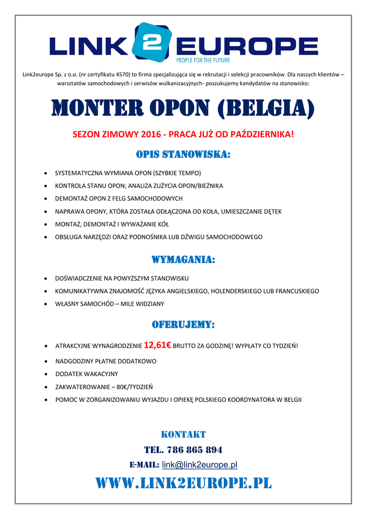 Link2europe Sp. z o.o. (nr certyfikatu 4570) to firma specjalizująca się w rekrutacji i selekcji pracowników. Dla naszych klientów – warsztatów samochodowych i serwisów wulkanizacyjnych- poszukujemy kandydatów na stanowisko: MONTER OPON (Belgia) SEZON ZIMOWY 2016 - PRACA JUŻ OD PAŹDZIERNIKA! OPIS STANOWISKA: SYSTEMATYCZNA WYMIANA OPON (SZYBKIE TEMPO) KONTROLA STANU OPON; ANALIZA ZUŻYCIA OPON/BIEŻNIKA DEMONTAŻ OPON Z FELG SAMOCHODOWYCH NAPRAWA OPONY, KTÓRA ZOSTAŁA ODŁĄCZONA OD KOŁA, UMIESZCZANIE DĘTEK MONTAŻ, DEMONTAŻ I WYWAŻANIE KÓŁ OBSŁUGA NARZĘDZI ORAZ PODNOŚNIKA LUB DŹWIGU SAMOCHODOWEGO WYMAGANIA: DOŚWIADCZENIE NA POWYŻSZYM STANOWISKU KOMUNIKATYWNA ZNAJOMOŚĆ JĘZYKA ANGIELSKIEGO, HOLENDERSKIEGO LUB FRANCUSKIEGO WŁASNY SAMOCHÓD – MILE WIDZIANY OFERUJEMY: ATRAKCYJNE WYNAGRODZENIE 12,61€ BRUTTO ZA GODZINĘ! WYPŁATY CO TYDZIEŃ! NADGODZINY PŁATNE DODATKOWO DODATEK WAKACYJNY ZAKWATEROWANIE – 80€/TYDZIEŃ POMOC W ZORGANIZOWANIU WYJAZDU I OPIEKĘ POLSKIEGO KOORDYNATORA W BELGII KONTAKT Tel. 786 865 894 e-mail: [email protected] www.link2europe.pl