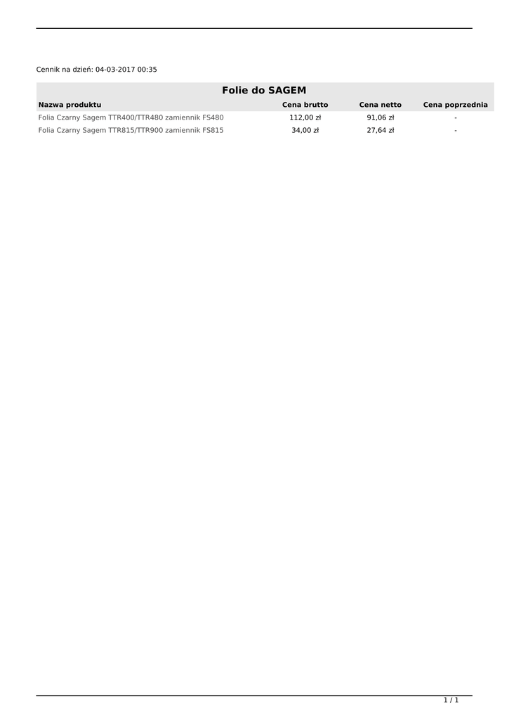 Cennik na dzień: 04-03-2017 00:35 Folie do SAGEM Nazwa produktu Cena brutto Cena netto Cena poprzednia Folia Czarny Sagem TTR400/TTR480 zamiennik FS480 112,00 zł 91,06 zł - Folia Czarny Sagem TTR815/TTR900 zamiennik FS815 34,00 zł 27,64 zł - 1/1 Powered by TCPDF (www.tcpdf.org)