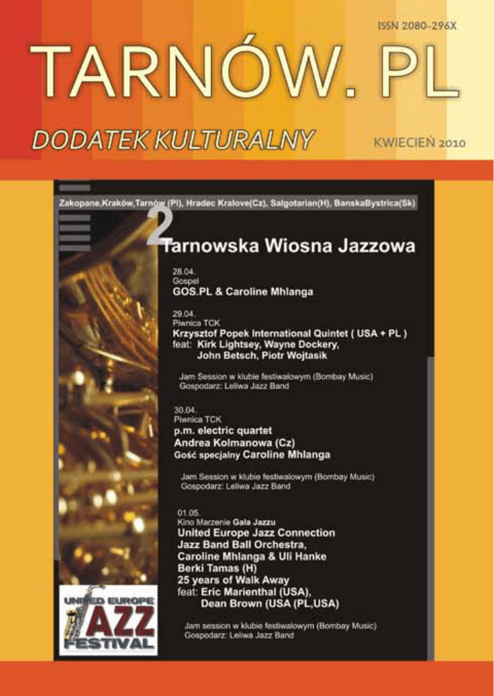KULTURA 1 KALENDARZ KULTURALNY KWIECIEŃ 2010 www.kultura.tarnow.pl kwiecień 2010 r. KULTURA 2 29 marca – 25 kwietnia 9 kwietnia, godz. 18.30 Wystawa malarstwa Anny Śliwińskiej – Kukla Wernisaż wystawy malarstwa Lidii Połeć – cykl prezentacji młodych tarnowskich artystów Galeria Piwnica - Muzeum Okręgowe, Rynek 20-21 KALENDARZ KULTURALNY KWIECIEŃ 2010 www.kultura.tarnow.pl Galeria Mała BWA do 30 kwietnia, godz. 10.00 -18.00 (codziennie oprócz niedziel i świąt) „NA ZAWSZE TARNÓW” – wystawa multimedialna Na 21 ekranach LCD prezentowane są wizualizacje nowych obiektów Tarnowa przyszłości w zestawieniu z ich obecnym stanem oraz tarnowskie instytucje kultury. Ekrany pozwalają na prezentacje nawet kilkuset fotografii i projektów architektonicznych. Wystawa swym zakresem obejmuje trzy obszary: przestrzeń publiczną, kulturę i sztukę, przemysł, handel i usługi. Galeria TCK 10 kwietnia, godz. 19.00 Spektakl Tarnowskiego Teatru: „Ildefonsjada, czyli niech żyje Mistrz!”, reż. M. Krzysica Pałac Młodzieży, ul. Piłsudskiego 24 11 kwietnia, godz. 16.00 4 kwietnia, godz. 10.30 Suma Pontyfikalna – oprawa liturgii w wykonaniu Chóru Pueri Cantores Tarnovienses i Tarnowskiej Orkiestry Kameralnej Bazylika Katedralna Spektakl Tarnowskiego Teatru: „Kukuryku na patyku, czyli o dwóch takich”, reż. T. Kowalski Rzecz o dwóch chłopcach, którzy podejmując wspólne zabawy, przekomarzają się i rywalizują ze sobą kwiecień 2010 r. KULTURA czyniąc sobie nawzajem rozmaite psoty, a równocześnie uczą się tego co jest najcenniejsze – trudnej sztuki przyjaźni. I choć często się na siebie obrażają, to jednak wspólne doświadczenie nieszczęścia uczy ich obu rozumu, a przede wszystkim wspólnej zabawy, współdziałania i braterskiej solidarności. Pałac Młodzieży, ul. Piłsudskiego 24 3 15 kwietnia, godz. 16.00 Klub „13”: „Gdy umierał Zbawiciel” 3 - aktowy szkic dramatu osnutego na tle Męki Pańskiej w wykonaniu koła teatralnego „Kurtyna” działającego przy VI LO w Tarnowie. Filia Nr 13 MBP, ul. Starodąbrowska 4 15 kwietnia, godz. 18.00 11 kwietnia, godz. 18.00 Recital kameralny: Artur Jaroń (fortepian), Tomasz Strahl (wiolonczela) Dworek I. J. Paderewskiego w Kąśnej Dolnej Wernisaż wystawy Michała Smółki, ucznia Jerzego Dudy– Gracza połączony z impresją poetycko-muzyczną Galeria Hortar, ul. Legionów 32 11 i 12 kwietnia, godz. 20.00 15 kwietnia, godz. 18.00 Spektakl Teatru Nie Teraz „Liczba Aniołów”, reż. A.T. Żak Estrada Młodych - recital dyplomowy Tomasza Kumięgi (tenor), absolwenta ZSM w Tarnowie Spektakl jest autorską kompilacją tekstów ilustrującą zmagania człowieka z diabłem; puentuje poszukiwania Teatru inspirowane twórczością Władysława Hasiora. Opowieść o opętaniu – tu i teraz – z użyciem rekwizytów tego świata, których używać może i używa jak najbardziej szatan. Dworzec PKS W Tarnowie Sala Lustrzana 15 kwietnia, godz. 18.00 Spotkanie autorskie Grzegorza Szczerby i promocja publikacji „Darowizna Księcia Romana Sanguszki”. Autor w sposób rzetelny i wyczerpujący opisuje okoliczności, w jakich kwiecień 2010 r. KALENDARZ KULTURALNY KWIECIEŃ 2010 www.kultura.tarnow.pl KULTURA www.kultura.tarnow.pl w listopadzie 1938 roku książę Roman Sanguszko darował Gminie Miasta Tarnowa wzgórze zamkowe (...) Czytelnia Naukowa MBP, ul. Krakowska 4 została odkryciem roku 2006 przez miesięcznik Machina i Program 3 Polskiego Radia. Piwnice TCK 4 15 kwietnia, godz. 19.00 KALENDARZ KULTURALNY KWIECIEŃ 2010 Z cyklu „Wieczory teatralne” – „Madame”, reż. E. Lachnit Ponad sto lat temu, 8 kwietnia 1909 roku, zmarła jedna z największych aktorek XIX wieku: dla Polaków Helena Modrzejewska, dla reszty Europy i Amerykanów… Madame Modjeska. Jest wyobrażonym portretem Heleny Modrzejewskiej, aktorki, która w wieku 37 lat rozpoczyna wszystko od nowa w obcym kraju. MCK 16 kwietnia, godz. 18.30 Wernisaż wystawy komiksu oraz spotkanie z Wojciechem Birkiem – autorem antologii komiksu Galeria Pasaż Tertila 16 kwietnia, godz. 19.00 „MUCHY” – koncert rockowy. „Muchy” – to polska grupa muzyczna założona w Poznaniu w 2004 roku, 16 kwietnia, godz. 19.00 Koncert „MSZA KREOLSKA” Ariela Ramireza Punktem wyjścia dzieła, w którym tak wspaniały wyraz znalazła liturgia ludowa, są rytmy i melodie folkloru, Argentyny i innych krajów Ameryki Południowej. „Msza kreolska” Ramireza, wzbudzająca zachwyt krytyki i publiczności całego świata, ukazuje nam, jak w muzycznym kształcie zawrzeć można najwyższe wartości ducha ludzkiego, jak i sam akt religijny jest w stanie podnieść na szczyty artyzmu muzykę ludową. Sala Małopolskiego Urzędu Wojewódzkiego, al. Solidarności 5 kwiecień 2010 r. KULTURA www.kultura.tarnow.pl 5 17 – 18 kwietnia 18 kwietnia, godz. 19.00 Puchar Okręgu Małopolskiego i Ogólnopolski Turniej Tańca Towarzyskiego „eMiKa 2010” Spektakl Tarnowskiego Teatru: „Wszystko o kobietach ”reż. K. Prus Hala Widowiskowo-Sportowa Pałacu Młodzieży, ul. Gumniska 28 Pałac Młodzieży, ul. Piłsudskiego 24 Spektakl Tarnowskiego Teatru: „Glany na glanc” – reż. T. Piasecki Spektakl mówi o ważnych problemach współczesnego świata, o zagrożeniach, o młodzieżowych subkulturach, szukających inspiracji w nazistowskiej ideologii. Pałac Młodzieży, ul. Piłsudskiego 24 18 kwietnia, godz. 17.00 Estrada Młodych - recital dyplomowy Gabrieli Baran (skrzypce) i Tomasza Borucha (gitara), absolwentów ZSM w Tarnowie Sala Lustrzana 20 kwietnia, godz. 18.00 Alfabet polski 2: Dominik Lejman – spotkanie z artystą i otwarcie wystawy „Muzyka malowana wyobraźnią”: Wiosenne spotkania przy napojach – koncert przy kawie Koncert fortepianowy – utwory młodego Chopina w wykonaniu Dominiki Szlezynger. Wernisaż wystawy – Wilfried de Meyer:„Koronka flamandzka”. Pokaz kolekcji Pracowni Mody, Szycia i Wizażu Pałacu Młodzie