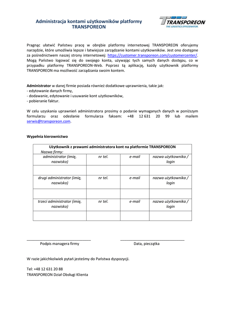 Administracja kontami użytkowników platformy TRANSPOREON Pragnąc ułatwid Paostwu pracę w obrębie platformy internetowej TRANSPOREON oferujemy narzędzie, które umożliwia lepsze i łatwiejsze zarządzanie kontami użytkowników. Jest ono dostępne za pośrednictwem naszej strony internetowej: https://customer.transporeon.com/customercenter/. Mogą Paostwo logowad się do swojego konta, używając tych samych danych dostępu, co w przypadku platformy TRANSPOREON-Web. Poprzez tą aplikację, każdy użytkownik platformy TRANSPOREON ma możliwośd zarządzania swoim kontem. Administrator w danej firmie posiada również dodatkowe uprawnienia, takie jak: - edytowanie danych firmy, - dodawanie, edytowanie i usuwanie kont użytkowników, - pobieranie faktur. W celu uzyskania uprawnieo administratora prosimy o podanie wymaganych danych w poniższym formularzu oraz odesłanie formularza faksem: +48 12 631 20 99 lub mailem [email protected]. Wypełnia kierownictwo Użytkownik z prawami administratora kont na platformie TRANSPOREON Nazwa firmy: administrator (imię, nr tel. e-mail nazwa użytkownika / nazwisko) login drugi administrator (imię, nazwisko) nr tel. e-mail nazwa użytkownika / login trzeci administrator (imię, nazwisko) nr tel. e-mail nazwa użytkownika / login _______________________________ Podpis managera firmy _______________________________ Data, pieczątka W razie jakichkolwiek pytao jesteśmy do Paostwa dyspozycji. Tel: +48 12 631 20 88 TRANSPOREON Dział Obsługi Klienta