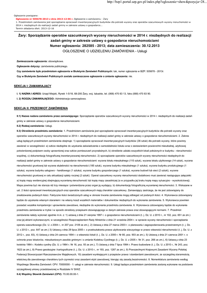 http://bzp1.portal.uzp.gov.pl/index.php?ogloszenie=show&pozycja=28... Ogłoszenie powiązane: Ogłoszenie nr 505678-2013 z dnia 2013-12-06 r. Ogłoszenie o zamówieniu - Żary 1. Przedmiotem zamówienia jest sporządzanie opracowań inwentaryzacyjnych budynków dla potrzeb wyceny oraz operatów szacunkowych wyceny nieruchomości w 2014 r. niezbędnych do realizacji zadań gminy w zakresie ustawy o gospodarce... Termin składania ofert: 2013-12-16 Żary: Sporządzanie operatów szacunkowych wyceny nieruchomości w 2014 r. niezbędnych do realizacji zadań gminy w zakresie ustawy o gospodarce nieruchomościami Numer ogłoszenia: 282585 - 2013; data zamieszczenia: 30.12.2013 OGŁOSZENIE O UDZIELENIU ZAMÓWIENIA - Usługi Zamieszczanie ogłoszenia: obowiązkowe. Ogłoszenie dotyczy: zamówienia publicznego. Czy zamówienie było przedmiotem ogłoszenia w Biuletynie Zamówień Publicznych: tak, numer ogłoszenia w BZP: 505678 - 2013r. Czy w Biuletynie Zamówień Publicznych zostało zamieszczone ogłoszenie o zmianie ogłoszenia: nie. SEKCJA I: ZAMAWIAJĄCY I. 1) NAZWA I ADRES: Urząd Miejski, Rynek 1-5/18, 68-200 Żary, woj. lubuskie, tel. (068) 470 83 13, faks (068) 470 83 90. I. 2) RODZAJ ZAMAWIAJĄCEGO: Administracja samorządowa. SEKCJA II: PRZEDMIOT ZAMÓWIENIA II.1) Nazwa nadana zamówieniu przez zamawiającego: Sporządzanie operatów szacunkowych wyceny nieruchomości w 2014 r. niezbędnych do realizacji zadań gminy w zakresie ustawy o gospodarce nieruchomościami. II.2) Rodzaj zamówienia: Usługi. II.3) Określenie przedmiotu zamówienia: 1. Przedmiotem zamówienia jest sporządzanie opracowań inwentaryzacyjnych budynków dla potrzeb wyceny oraz operatów szacunkowych wyceny nieruchomości w 2014 r. niezbędnych do realizacji zadań gminy w zakresie ustawy o gospodarce nieruchomościami. 2. Zakres usług będących przedmiotem zamówienia obejmuje: 1) sporządzanie opracowań inwentaryzacyjnych budynków (36 sztuk) dla potrzeb wyceny, które powinny zawierać w szczególności: a) szkice niezbędne do uzyskania zaświadczenia o samodzielności lokalu wraz z zestawieniem powierzchni mieszkalnej, użytkowej potwierdzonej podpisem osoby uprawnionej oraz szkice pomieszczeń przynależnych, b) określenie udziału wszystkich lokali położonych w budynku - nieruchomości wspólnej, c) dokumentację fotograficzną inwentaryzowanej nieruchomości. 2) sporządzanie operatów szacunkowych wyceny nieruchomości niezbędnych do realizacji zadań gminy w zakresie ustawy o gospodarce nieruchomościami: wycena lokalu mieszkalnego (115 sztuk), wycena lokalu użytkowego (14 sztuk), wycena nieruchomości gruntowej lub wycena służebności na nieruchomości (185 sztuk), wycena budynku mieszkalnego (1 sztuka), wycena budynku produkcyjnego (1 sztuka), wycena budynku usługowo - handlowego (1 sztuka), wycena budynku gospodarczego (1 sztuka), wycena budowli lub sieci (2 sztuki), wycena nieruchomości gruntowej w celu aktualizacji opłaty rocznej (2 sztuki). Operat szacunkowy wyceny nieruchomości dodatkowo musi zawierać następujące załączniki: a) kopię mapy ewidencyjnej obejmującą wycenianą nieruchomość lub kopię mapy zasadniczej (a w przypadku jej braku kopię mapy sytuacyjno - wysokościowej). Mapa powinna być nie starsza niż trzy miesiące i potwierdzona przez organ ją wydający, b) dokumentację fotograficzną wycenianej nieruchomości. 3. Wskazane w ust. 2 ilości opracowań inwentaryzacyjnych oraz operatów szacunkowych mają charakter szacunkowy. Zamawiający zastrzega, że nie jest zobowiązany do zrealizowania podanych ilości. Faktyczne ilości świadczonych usług w okresie trwania zamówienia mogą odbiegać od podanych ilości. 4. Wykonawca zobowiązany będzie do uzyskania własnym staraniem i na własny koszt wszelkich materiałów i dokumentów niezbędnych do wykonania zamówienia. 5. Wykonawca powinien posiadać wszelkie kompetencje i uprawnienia zawodowe, niezbędne do wykonania przedmiotu zamówienia. 6. Wykonawca zobowiązany będzie do wykonania przedmiotu zamówienia w trybie i w sposób określony przepisami obowiązującego w danym zakresie prawa oraz obowiązującymi normami. 7. Przedmiot zamówienia należy wykonać zgodnie m.in. z: 1) ustawą z dnia 21 sierpnia 1997 r. o gospodarce nieruchomościami (t. j. Dz. U. z 2010 r., nr 102, poz. 651 ze zm.) oraz jej aktami wykonawczymi, w szczególności Rozporządzeniem Rady Ministrów z dnia 21 września 2004 r. w sprawie wyceny nieruchomości i sporządzania operatu szacunkowego (Dz. U. z 2004 r., nr 207 poz. 2109 ze zm.), 2) Ustawą z dnia 27 marca 2003 r. o planowaniu i zagospodarowaniu przestrzennym (t. j. Dz. U. z 2012 r., poz. 647 ze zm.) 3) Ustawą z dnia 29 lipca 2005 r. o przekształceniu prawa użytkowania wieczystego w prawo własności nieruchomości (t. j. Dz. U. z 2012 r., poz. 83), 4) Ustawą z dnia 24 czerwca 1994 r. o własności lokali (t. j. Dz. U. z 2000 r. Nr 80, poz. 903 ze zm.), 5) Ustawą z dnia 21 czerwca 2001 r. o ochronie praw lokatorów, mieszkaniowym zasobie gminnym i o zmianie Kodeksu Cywilnego (t. j. Dz. U. z 2005 r. Nr 31, poz. 266 ze zm.), 6) Ustawą z dnia 23 kwietnia 1964 r. Kodeks cywilny (Dz. U. z 1964 r. Nr 16, poz. 93 ze zm.), 7) Ustawą z dnia 7 lipca 1994 r. Prawo budowlane (t. j. Dz. U. z 2010 r., Nr 243, poz. 1623 ze zm.), 8) Prawo geodezyjne i kartograficzne (t. j. Dz. U. z 2010 r., nr 193, poz. 1287 ze zm.), 9) Powszechnymi Krajowymi Zasadami Wyceny Polskiej Federacji Stowarzyszeń Rzeczoznawców Majątkowych, 10) zasadami wynikającymi z przepisów prawa i standardami zawodowymi, ze szczególną starannością właściwą dla zawodowego charakteru tych czynności oraz zasadami etyki zawodowej, kierując się zasadą bezstronności. 8. Nomenklatura zamówienia według Wspólnego Słownika Zamówień: CPV: 70000000 - 1: usługi w zakresie nieruchomości. 9. Usługi będące przedmiotem zamówienia zostaną wykonane na podstawie szczegółowej umowy przedstawionej w Rozdzi