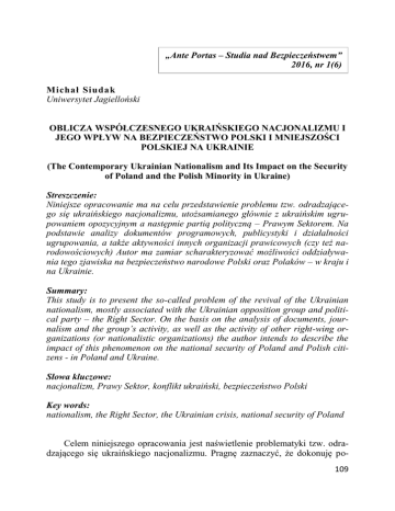 „Ante Portas – Studia nad Bezpieczeństwem” 2016, nr 1(6) Michał Siudak Uniwersytet Jagielloński OBLICZA WSPÓŁCZESNEGO UKRAIŃSKIEGO NACJONALIZMU I JEGO WPŁYW NA BEZPIECZEŃSTWO POLSKI I MNIEJSZOŚCI POLSKIEJ NA UKRAINIE (The Contemporary Ukrainian Nationalism and Its Impact on the Security of Poland and the Polish Minority in Ukraine) Streszczenie: Niniejsze opracowanie ma na celu przedstawienie problemu tzw. odradzającego się ukraińskiego nacjonalizmu, utożsamianego głównie z ukraińskim ugrupowaniem opozycyjnym a następnie partią polityczną – Prawym Sektorem. Na podstawie analizy dokumentów programowych, publicystyki i działalności ugrupowania, a także aktywności innych organizacji prawicowych (czy też narodowościowych) Autor ma zamiar scharakteryzować możliwości oddziaływania tego zjawiska na bezpieczeństwo narodowe Polski oraz Polaków – w kraju i na Ukrainie. Summary: This study is to present the so-called problem of the revival of the Ukrainian nationalism, mostly associated with the Ukrainian opposition group and political party – the Right Sector. On the basis on the analysis of documents, journalism and the group’s activity, as well as the activity of other right-wing organizations (or nationalistic organizations) the author intends to describe the impact of this phenomenon on the national security of Poland and Polish citizens - in Poland and Ukraine. Słowa kluczowe: nacjonalizm, Prawy Sektor, konflikt ukraiński, bezpieczeństwo Polski Key words: nationalism, the Right Sector, the Ukrainian crisis, national security of Poland Celem niniejszego opracowania jest naświetlenie problematyki tzw. odradzającego się ukraińskiego nacjonalizmu. Pragnę zaznaczyć, że dokonuję po109 działu współczesnego ukraińskiego nacjonalizmu na tzw. tradycyjny – nawiązujący do myśli politycznej Mykoły Michnowskiego, Dmytra Doncowa, Stepana Bandery oraz powojennej diaspory ukraińskiej z RFN, USA i Kanady, którego przedstawicielami są członkowie Kongresu Ukraińskich Nacjonalistów, oraz tzw. nacjonalizm pomajdanowy, utożsamiany z Prawym Sektorem. Organizacja Prawy Sektor powstała w czasie protestów antyrządowych na Ukrainie. Ujawniła się 1 grudnia 2013 roku, gdy ok. 200 członków organizacji zaatakowało na ul. Bankowej kordon milicji strzegącej budynków rządowych. Głównym członem Prawego Sektora byli członkowie mało znanych na Ukrainie organizacji paramilitarnych Patriot Ukrajiny, Tryzub, Biały Młot, część działaczy Ukraińskiego Zgromadzenia Narodowego – Ukraińskiej Samoobrony Ludowej (UNA-UNSO), mniejszych grupek nacjonalistycznych i piłkarscy ultrasi, głównie Dynama Kijów1. Ze strony internetowej organizacji, a także z wypowiedzi przywódców organizacji wynika, iż Prawy Sektor opowiada się za kontynuacją wojny na wschodzie Ukrainy. Walka w Donbasie powinna trwać i zakończyć się zwycięstwem, a nie zawarciem pokoju. Historyczną misją tej wojny, którą członkowie organizacji nazywają Wyzwoleńczą, jest zamknięcie dla Ukraińców (raz na zawsze, bądź na kilka pokoleń wprzód) kwestii rosyjskiej. Członkowie Prawego Sektora są zdecydowanie antyrosyjscy, przy czym nie jest to antyrosyjskość rozumiana jako antyputinizm – ale antyrosyjskość w sensie kulturowym oraz geopolitycznym. W materiałach umieszczanych na oficjalnej stronie internetowej ugrupowania poszczególni autorzy twierdzą, że Rosja przegrawszy wojnę o Donbas, mocno obciążona sankcjami i stratami wojskowymi, utraciwszy fundament ideologiczny i celowy, zacznie rozpadać się w najbliższym czasie. Można zaryzykować twierdzenie, że jednym z głównych celów strategicznych i politycznych działaczy Prawego Sektora jest doprowadzenie do rozbicia Rosji, którą uważają za nieprzejednanego wroga Ukrainy i sprawcę niemalże wszystkich ukraińskich niepowodzeń politycznych i gospodarczych, zarówno w czasach historycznych, jak i obecnie. Programem minimum tej organizacji na odcinku rosyjskim jest podpisanie przez władze Ukrainy pokoju bezpośrednio z prezydentem Władimirem Putinem – gdyż podpisanie pokoju (bądź zawieszenia broni) z donbaskimi separatystami spowoduje, że trwająca od 2014 roku wojna wejdzie do historii jako konflikt wewnątrz-ukraiński, a nie – jak chcą tego prawosektorowcy – wyzwolicielska wojna ukraińsko-rosyjska. W kwestii geopolitycznej Prawy Sektor opowiada się za poza blokowym statusem Ukrainy. W jednym z wywiadów przywódca organizacji Dmytro Jarosz stwierdził: „Prawy Sektor nie opowiada się i nie opowiadał za wejściem 1 Czczą Banderę, biją Berkut. Sotnie Prawego Sektora nie chcą kompromisu, <http://www.tvn24.pl/czcza-bandere-bija-berkut-sotnie-prawego-sektora-nie-chcakompromisu,392162,s.html> (14.11.2015); zob. także: <http://pravyysektor.info/about.html> (14.11.2015). 110 Ukrainy do UE. Uważamy, że Ukraina ma być podmiotem, a nie przedmiotem geopolityki. Opowiadamy się za poza blokowym statusem Ukrainy, występujemy tak samo jak górnicy z Donbasu przeciwko temu, aby u nas na Ukrainie zostały zlokalizowane bazy NATO i żeby Ukraina była członkiem NATO” 2. Najbliższymi sojusznikami Ukrainy powinny być kraje Europy ŚrodkowoWschodniej, Północnej oraz kraje basenu Morza Czarnego: Szwecja, Litwa, Polska, Turcja oraz Gruzja. Kierownictwu omawianej organizacji zależy także na dobrych stosunkach z Polską. „Mieliśmy niełatwe okresy w historii naszych wzajemnych stosunków. Były czasy, kiedy byliśmy sojusznikami, były czasy, kiedy byliśmy wrogami. Ale teraz w XXI wieku między polskim i ukraińskim narodem, zgodnie z naszymi głębokimi przekonaniami... Nie ma między nami tych rozbieżności, które były kiedyś. W tej chwili trzeba żyć przyszłością, a nie przeszłością. My, ukraińscy nacjonaliści jesteśmy gotowi, by polski naród był dla nas bratnim narodem... i żeby antyimperialny i antyrosyjski front był zjednoczony... między Polakami, U