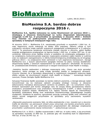 BioMaxima S.A. bardzo dobrze rozpoczyna 2016 r.