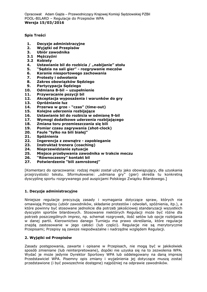 Opracował: Adam Gajda – Przewodniczący Krajowej Komisji Sędziowskiej PZBil POOL-BILARD – Regulacje do Przepisów WPA Wersja 15/03/2016 Spis Treści 1. 2. 3. 3.1 3.2 4. 5. 6. 7. 8. 9. 10. 11. 12. 13. 14. 15. 16. 17. 18. 19. 20. 21. 22. 23. 24. 25. 26. 27. Decyzje administracyjne Wyjątki od Przepisów Ubiór zawodnika Mężczyźni Kobiety Ustawianie bil do rozbicia / „nabijanie” stołu “Sędzia na sali gier” - rozgrywanie meczów Karanie niesportowego zachowania Protesty i odwołania Zakres obowiązków Sędziego Partycypacja Sędziego Odmiana 8-bil – uzupełnienie Przywracanie pozycji bil Akceptacja wyposażenia i warunków do gry Opróżnianie łuz Przerwa w grze - “czas” (time-out) Kolejne uderzenia rozbijające Ustawianie bil do rozbicia w odmianę 9-bil Wymogi dodatkowe uderzenia rozbijającego Zmiana toru przemieszczania się bili Pomiar czasu zagrywania (shot-clock) Faule “tylko na bili białej” Spóźnienia Ingerencja z zewnątrz - zapobieganie Instruktaż trenera (coaching) Nieprzewidzianie sytuacje Miejsce przebywania zawodnika w trakcie meczu “Równoczesny” kontakt bil Potwierdzenie “bili zamrożonej” [Komentarz do opracowania: rodzaj męski został użyty jako obowiązujący, dla uzyskania przejrzystości tekstu. Sformułowanie: „odmiana gry” (gier) określa tu konkretną dyscyplinę sportu rozgrywanego pod auspicjami Polskiego Związku Bilardowego.] 1. Decyzje administracyjne Niniejsze regulacje precyzują zasady i wymagania dotyczące spraw, których nie omawiają Przepisy (ubiór zawodników, składanie protestów i odwołań, spóźnienia, itp.), a które powinny być stosowane jednolicie dla potrzeb jakościowej standaryzacji wszystkich dyscyplin sportów bilardowych. Stosowanie niektórych Regulacji może być różne dla potrzeb poszczególnych imprez, np. schemat rozgrywek, ilość setów lub opcje rozbijania w danej partii. Kierownictwo danego Turnieju ma prawo określania, które regulacje znajdą zastosowanie w jego całości (lub części). Regulacje nie są merytorycznie Przepisami; Przepisy są zawsze niepodważalne i nadrzędne względem Regulacji. 2. Wyjątki od Przepisów Zasady postępowania, zawarte i opisane w Przepisach, nie mogą być w jakikolwiek sposób zmieniane (lub reinterpretowane), dopóki nie uzyska się na to zezwolenia WPA. Wydać je może jedynie Dyrektor Sportowy WPA lub oddelegowany na daną imprezę Przedstawiciel WPA. Pisemny opis zmiany i wyjaśnienia jej dotyczące muszą zostać przedstawione (i być powszechnie dostępne) najpóźniej na odprawie zawodników. Opracował: Adam Gajda – Przewodniczący Krajowej Komisji Sędziowskiej PZBil 3. Ubiór zawodnika Ubiór zawodnika musi zawsze spełniać wymogi rangi zawodów; musi być czysty, odpowiedni, w zadbanym stanie. Jeśli zawodnik nie jest pewien prawidłowości swego stroju powinien on skonsultować swe wątpliwości z Dyrektorem Turnieju, którego opinia jest wiążąca i ostateczna. W sytuacjach wyjątkowych Dyrektor Turnieju może dopuścić warunkowo nieodpowiedni strój np. po zagubienie bagażu w trakcie podróży lotniczej. Za niedostosowanie swego stroju do wymogów turnieju zawodnik może być zdyskwalifikowany. Jeśli odpowiednie zarządzenie nie stanowi inaczej, wymagania niniejszych Regulacji są obowiązujące. Poniżej znajdują się opisy określające poprawny strój zawodnika w zawodach rozgrywanych pod auspicjami WPA i zrzeszonych organizacji. 3.1 Mężczyźni Obowiązuje koszula lub koszulka typu “polo”, dowolnego koloru i z przynajmniej krótkim rękawem; muszą być one czyste, zadbane i w dobrym stanie. Przez cały czas trwania turnieju koszula (lub koszulka) musi być wsunięta w spodnie. Koszulki typu „T-shirt” są zabronione. Obowiązują długie, wizytowe spodnie; muszą być one czyste, zadbane i w dobrym stanie; kolor spodni jest nieistotny. Dżinsy i sztruksy są zabronione; jednakże dopuszczalny jest dżinsowy krój spodni. Obuwie musi spełniać wymogi wizytowego i pasować do reszty ubioru. Tenisówki, sandały, itp. są zabronione. Obuwie stylizowane na styl sportowy (tylko jednolite, wykonane ze skóry lub materiałów skóropodobnych) może być używane, ale tylko, jeśli bezwarunkowo spełnia wymogi akceptowalnego jako wizytowe; ocena Dyrektora Turnieju jest w tej kwestii wiążąca i ostateczna. 3.2 Kobiety Obowiązuje wizytowa bluzka, sukienka, koszula lub koszulka typu “polo” z rękawem; muszą być one schludne, zadbane i zakrywające ramiona. Koszulki typu „T-shirt” są zabronione. Obowiązują długie, wizytowe spodnie; muszą być one czyste, zadbane, w dobrym stanie; kolor spodni jest nieistotny. Dozwolone jest noszenie spódnicy, jednakże musi ona zakrywać kolana. Dżinsy i sztruksy są zabronione; jednakże dopuszczalny jest dżinsowy krój spodni. Obuwie musi spełniać wymogi wizytowego i pasować do reszty ubioru. Tenisówki, sandały, itp. są zabronione. Obuwie stylizowane na styl sportowy (tylko jednolite, wykonane ze skóry lub materiałów skóropodobnych) może być używane, ale tylko, jeśli bezwarunkowo spełnia wymogi akceptowalnego jako wizytowe; ocena Dyrektora Turnieju jest w tej kwestii wiążąca i ostateczna. 4. Szablon do ustawiania bil 4.Szablon Szablon może być używany do odmian gry: 8-bil, 9-bil, i 10-bil. Zabroniony jest do odmiany 14/1. 4.1 Układanie szablonu Stół musi być oznaczony przez rozpoczęciem zawodów: lina pionowa musi być namalowana dla ułożenia szablonu. Linia musi być wystarczająco długa, by przechodziła przez dolny i górny otwór w szablonie. 4.2 Usuwanie szablonu Po rozbiciu, szablon musi być usunięty ze stołu przez sędziego tak szybko jak to możliwe bez poruszenia żadnej bili. Jeśli sędzia nie jest obecny przy stole, a bile utrudniają zdjęcie szablonu, przeciwnik musi być obecny przy stole, żeby usunąć szablon. Jeśli nie ma przeszkód, zawodnik przy stole może usunąć szablon bez ingerencji przeciwnika. Z obe