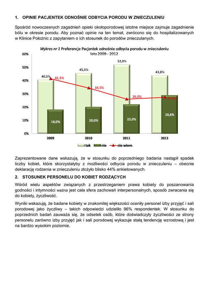 1. OPINIE PACJENTEK ODNOŚNIE ODBYCIA PORODU W ZNIECZULENIU Spośród nowoczesnych zagadnień opieki okołoporodowej istotne miejsce zajmuje zagadnienie bólu w okresie porodu. Aby poznać opinie na ten temat, zwrócono się do hospitalizowanych w Klinice Położnic z zapytaniem o ich stosunek do porodów znieczulanych. Zaprezentowane dane wskazują, że w stosunku do poprzedniego badania nastąpił spadek liczby kobiet, które skorzystałyby z możliwości odbycia porodu w znieczuleniu – obecnie deklarację rodzenia w znieczuleniu złożyło blisko 44% ankietowanych. 2. STOSUNEK PERSONELU DO KOBIET RODZĄCYCH Wśród wielu aspektów związanych z przestrzeganiem prawa kobiety do poszanowania godności i intymności ważna jest cała sfera zachowań interpersonalnych, sposób zwracania się do kobiety, życzliwość. Wyniki wskazują, że badane kobiety w znakomitej większości oceniły personel izby przyjęć i sali porodowej jako życzliwy – takich odpowiedzi udzieliło 96% respondentek. W stosunku do poprzednich badań zauważa się, że odsetek osób, które doświadczyły życzliwości ze strony personelu zarówno izby przyjęć jak i sali porodowej wykazuje stałą tendencję wzrostową i jest na bardzo wysokim poziomie. 3. SWOBODA RODZENIA W tej kategorii oceniano, czy Klinika uznaje prawo kobiety do zgodnego z jej instynktem zachowania i wyboru najwygodniejszej pozycji w czasie porodu. Zauważa się, że z każdym rokiem maleje odsetek kobiet, którym personel narzuca pozycję do odbycia porodu. Tegoroczne badanie pokazało, że blisko 100% rodzących kobiet mogła sama wybrać pozycję, w jakiej chce urodzić, bądź dokonała tego wyboru za radą personelu. 4. OBECNOŚĆ PRZY PORODZIE BLISKIEJ OSOBY Poród to nie tylko zdarzenie medyczne, ale przede wszystkim wydarzenie o wielkim znaczeniu dla psychiki i tożsamości kobiety, ogromne przeżycie emocjonalne, a także wydarzenie rodzinne. Pacjentka przebywająca w szpitalu zachowuje swe prawa do ochrony życia prywatnego i więzi rodzinnych, między innymi poprzez prawo do wsparcia ze strony osoby bliskiej, przez nią wybranej. W czasie badania ocenie poddano stosunek personelu sali porodowej do osoby towarzyszącej kobiecie przy porodzie. W odniesieniu do poprzednich okresów badawczych obserwuje się duży wzrost wskazań pozytywnych. Wszystkie ankietowane kobiety (100%) stwierdziły, że bliska im osoba była traktowana w sposób życzliwy. 5. KONTAKT MATKI Z DZIECKIEM Niezakłócony, wczesny kontakt matki z dzieckiem tuż po porodzie pomaga w zawiązaniu więzi między nimi i zwiększa prawdopodobieństwo udanego karmienia piersią. Wiele badań potwierdziło, że matki powinny mieć kontakt z dziećmi tak szybko po porodzie, jak sobie tego życzą i tak długo jak chcą. Otrzymane wyniki pokazują, że wszystkie respondentki – 100% miały bezpośredni kontakt z dzieckiem tuż po porodzie. Uzyskany wynik jest lepszy od danych z wcześniejszych badań. 6. INFORMOWANIE Prawo kobiety do bycia poinformowaną o stanie jej zdrowia, o każdym przeprowadzanym zabiegu, o podaniu leku i innych czynnościach podczas pobytu w szpitalu, wynika z konstytucyjnego prawa jednostki do stanowienia o sobie oraz do ochrony jej integralności. Zauważa się, stały wzrost zadowolenia Pacjentek w tym aspekcie usługi. W stosunku do poprzedniego badania wzrósł odsetek kobiet (blisko o 1/4), które przez cały okres otrzymywały pełne i wyczerpujące informacje o przebiegu porodu i podawanych środkach. Prawo do informacji jest ściśle związane z prawem do udzielania zgody na wszelkie zabiegi medyczne. Podczas pobytu w szpitalu Pacjentka powinna mieć możliwość swobodnego podejmowania decyzji. Analizując dane z lat 2010 – 2012 zauważa się, że następuje stały wzrost wskazań gdzie uzgadniano z rodzącą zabieg nacięcia krocza – takiej odpowiedzi udzieliło ponad osiem na dziesięć ankietowanych kobiet. Matka i ojciec noworodka od chwili jego narodzin są jego przedstawicielami ustawowymi, a zatem na personelu medycznym spoczywa obowiązek informowania ich o wszystkim, co dotyczy ich dziecka, a także pytanie rodziców o zgodę na każdą interwencję medyczną. Wyniki badań są zadowalające i wskazują na systematyczny wzrost satysfakcji Pacjentek z jakości udzielanych im informacji. Obecnie 86% ankietowanych uważa, że informacje o stanie dziecka otrzymane od lekarza pediatry były wyczerpujące. 7. OPIEKA PO PORODZIE Realizacja prawa do opieki i leczenia w związku z porodem obejmuje także opiekę nad kobietą i dzieckiem po porodzie. W Klinice Ginekologii i Położnictwa matki przebywają przez cały okres pobytu z dziećmi w jednej sali, ale jeśli chcą odpocząć, mogą oddać dziecko na jakiś okres pod opiekę personelu. Rola personelu oddziału położniczo – noworodkowego w propagowaniu i zachęcaniu matek do karmienia piersią, nauka karmienia piersią, porady laktacyjne oraz szeroko prowadzona edukacja z zakresu prawidłowego pielęgnowania noworodka, jest kluczowa. Najbardziej efektywna w podtrzymaniu karmienia piersią jest stała pomoc wykwalifikowanego personelu. Zadowolenie Pacjentek z tego aspektu opieki okołoporodowej utrzymuje się na wysokim poziomie. W obecnym badaniu wzrósł jeszcze odsetek matek (95%), którym personel z własnej inicjatywy służył pomocą w karmieniu i pielęgnacji noworodka. Sprawowanie pełnej opieki nad Położnicą, udzielanie pomocy i wsparcia w trudnych sytuacjach wchodzi w zakres podstawowych obowiązków personelu oddziału położniczo – noworodkowego. W omawianych okresach badawczych średnio dziewięć na dziesięć respondentek zawsze czuło się otoczone opieką, zawsze też otrzymywały pomoc w czynnościach pielęgnacyjnych. Obecne badanie wskazuje na wzrost satysfakcji w tym aspekcie usług. 8. WYKONYWANIE ZABIEGÓW PRZY DZIECKU W OBECNOŚCI MATKI Matka ma prawo uczestniczyć przy wykonywaniu u jej dziecka czynności lub zabiegów typu badanie lekarskie, 