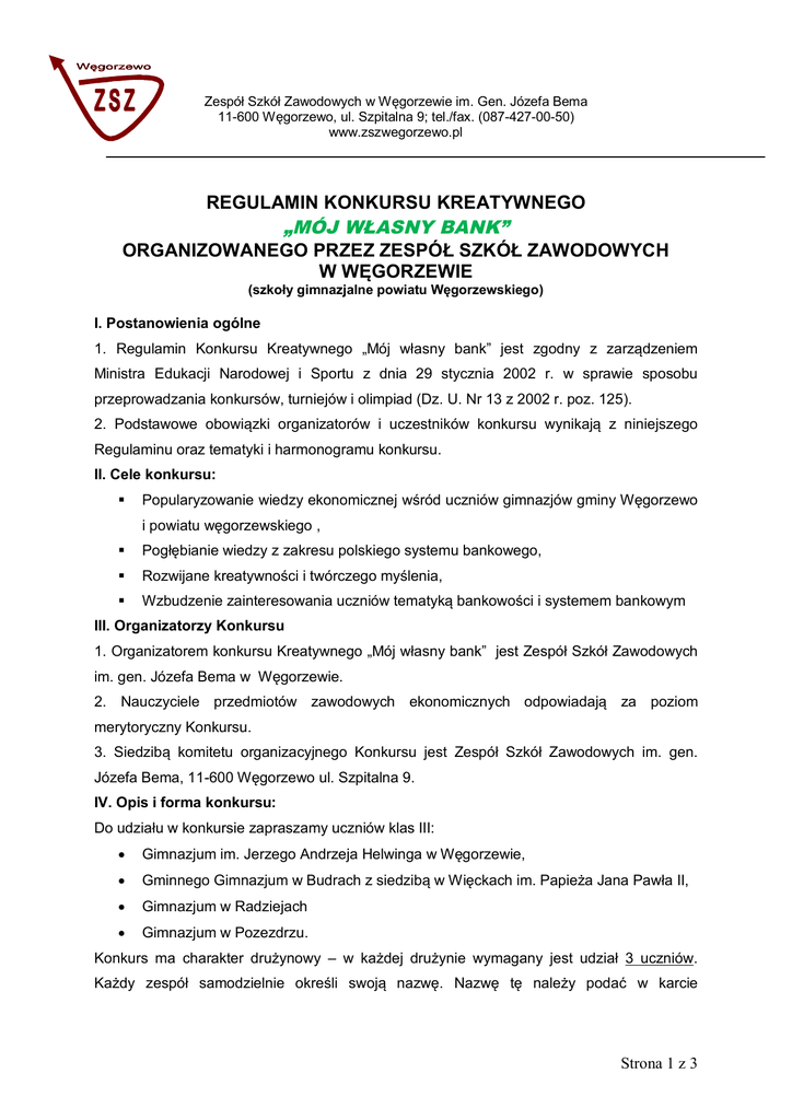 Zespół Szkół Zawodowych w Węgorzewie im. Gen. Józefa Bema 11-600 Węgorzewo, ul. Szpitalna 9; tel./fax. (087-427-00-50) www.zszwegorzewo.pl REGULAMIN KONKURSU KREATYWNEGO „MÓJ WŁASNY BANK” ORGANIZOWANEGO PRZEZ ZESPÓŁ SZKÓŁ ZAWODOWYCH W WĘGORZEWIE (szkoły gimnazjalne powiatu Węgorzewskiego) I. Postanowienia ogólne 1. Regulamin Konkursu Kreatywnego „Mój własny bank” jest zgodny z zarządzeniem Ministra Edukacji Narodowej i Sportu z dnia 29 stycznia 2002 r. w sprawie sposobu przeprowadzania konkursów, turniejów i olimpiad (Dz. U. Nr 13 z 2002 r. poz. 125). 2. Podstawowe obowiązki organizatorów i uczestników konkursu wynikają z niniejszego Regulaminu oraz tematyki i harmonogramu konkursu. II. Cele konkursu: Popularyzowanie wiedzy ekonomicznej wśród uczniów gimnazjów gminy Węgorzewo i powiatu węgorzewskiego , Pogłębianie wiedzy z zakresu polskiego systemu bankowego, Rozwijane kreatywności i twórczego myślenia, Wzbudzenie zainteresowania uczniów tematyką bankowości i systemem bankowym III. Organizatorzy Konkursu 1. Organizatorem konkursu Kreatywnego „Mój własny bank” jest Zespół Szkół Zawodowych im. gen. Józefa Bema w Węgorzewie. 2. Nauczyciele przedmiotów zawodowych ekonomicznych odpowiadają za poziom merytoryczny Konkursu. 3. Siedzibą komitetu organizacyjnego Konkursu jest Zespół Szkół Zawodowych im. gen. Józefa Bema, 11-600 Węgorzewo ul. Szpitalna 9. IV. Opis i forma konkursu: Do udziału w konkursie zapraszamy uczniów klas III: Gimnazjum im. Jerzego Andrzeja Helwinga w Węgorzewie, Gminnego Gimnazjum w Budrach z siedzibą w Więckach im. Papieża Jana Pawła II, Gimnazjum w Radziejach Gimnazjum w Pozezdrzu. Konkurs ma charakter drużynowy – w każdej drużynie wymagany jest udział 3 uczniów. Każdy zespół samodzielnie określi swoją nazwę. Nazwę tę należy podać w karcie Strona 1 z 3 zgłoszenia. Nazwa zespołu nie może zawierać określeń kontrowersyjnych lub dwuznacznych. Dopuszczalne jest tworzenie zespołów uczniów z różnych klas. Konkurs będzie składał się z III etapów, z których każdy oceniany będzie oddzielenie a suma ich punktów zadecyduje o zwycięstwie drużyny. Drużyny wcielą się w rolę przyszłych właścicieli banków i otrzymają następujące zadania: 1. Każdy przyszły „bankowiec” powinien wykazać się wiedzą z zakresu bankowości. W związku z tym w I części konkursu każda z drużyn otrzyma do rozwiązania test składający się z 20 pytań zamkniętych z zakresu bankowości. Test uczniowie rozwiązują drużynowo. Czas trwania testu – 20 minut. Wymagania i materiały umieszczone zostaną na szkolnej stronie internetowej: www.zszwegorzewo.pl 2. W II części konkursu uczniowie otrzymają zadania kreatywne: a) Każdy bank posiada elementy identyfikacji wizualnej (nazwę, logo, kolorystkę itp.) Uczestnicy będą musieli wymyśleć nazwę swojego banku, zaprojektować logo, oraz dobrać odpowiednią kolorystykę). W nazwie obowiązkowo musi pojawić się słowo BANK. Uczestnicy będą musieli przedstawić wizualizację swojego banku (plakat) nazwa oraz logo banku. b) Każdy bank posiada bogatą ofertę produktów i usług reklamowych Zadaniem uczestników będzie wymyślenie oryginalnego hasła reklamowego zachęcającego do oszczędzania i zakładania lokat. Czas na wykonanie obu zadań praktycznych 45 minut. V. Zasady i kryteria punktowania Każdy zespół może otrzymać maksymalnie 50 punktów, według następujących kryteriów: Etap I – test wiedzy teoretycznej 20 pkt, Etap II – elementy identyfikacji wizualnej plakat 20 pkt, Etap III - hasło reklamowe 10 pkt Konkurs oceniany będzie przez powołaną do tego celu komisję konkursową. VI. Termin i miejsce konkursu: Konkurs odbędzie się w siedzibie Zespołu Szkół Zawodowych im. gen. Józefa Bema w Węgorzewie ul. Szpitalna 9, w dniu 30 marca 2016r. o godz. 13.00. VII. Forma zgłoszenia: Chęć udziału w konkursie należy zgłosić swojemu wychowawcy klasy. Wychowawca wpisuje chętnych do udziału uczniów na karcie zgłoszenia dostępnej na stronie internetowej Zespołu Szkół Zawodowych w Węgorzewie, pod adresem: www.zszwegorzewo.pl w zakładce: Konkursy oraz w sekretariacie szkoły. Wychowawca klasy po zebraniu listy chętnych Strona 2 z 3 uczniów składa deklaracje uczestnictwa w sekretariacie szkoły w nieprzekraczalnym terminie do 21 marca 2016r. do godz. 14-ej. VIII. Nagrody Trzy zwycięskie zespoły otrzymają dyplomy oraz nagrody rzeczowe (Nagrody różnicowane będą wartościowo). W przypadku uzyskania takiej samej liczby punktów w walce o miejsca I-III zostanie przeprowadzona „dogrywka” w formie testu pytań otwartych. Organizatorzy konkursu zastrzegają sobie prawo do zmiany regulaminu w szczególnych przypadkach. Koordynator konkursu: Zuzanna Kowalska – wicedyrektor szkoły oraz nauczyciel przedmiotów zawodowych ekonomicznych. Telefon kontaktowy: (87)427-00-50 adres e-mail: [email protected] Strona 3 z 3
