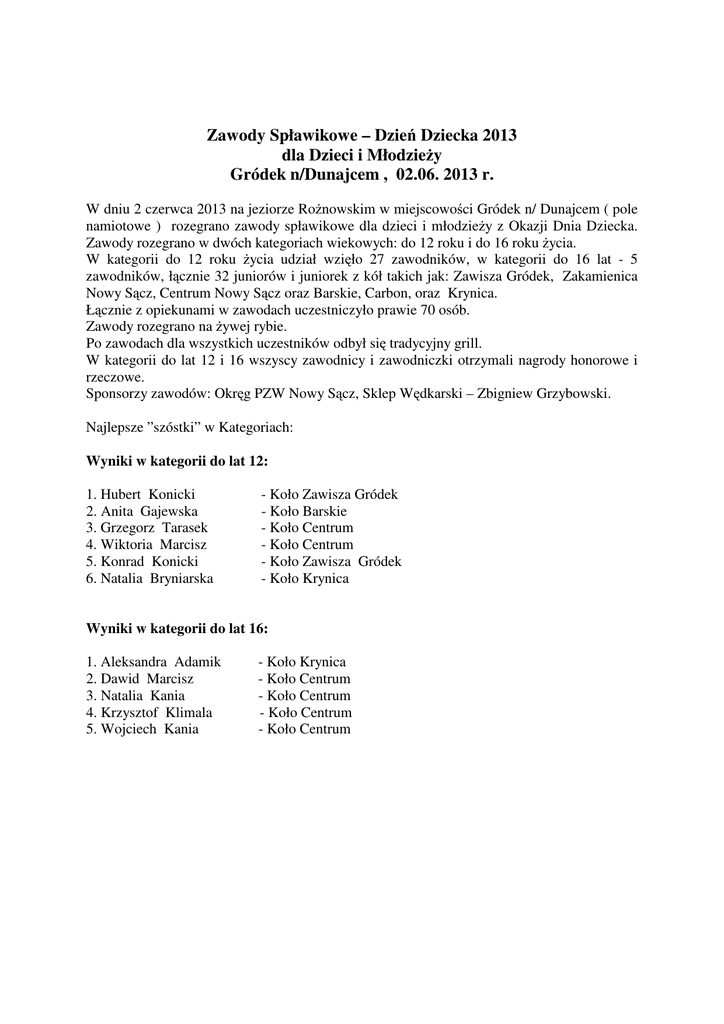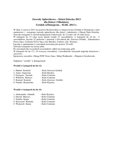 Zawody Spławikowe – Dzie Dziecka 2013 dla Dzieci i Młodzie y Gródek n/Dunajcem , 02.06. 2013 r. W dniu 2 czerwca 2013 na jeziorze Ro nowskim w miejscowo ci Gródek n/ Dunajcem ( pole namiotowe ) rozegrano zawody spławikowe dla dzieci i młodzie y z Okazji Dnia Dziecka. Zawody rozegrano w dwóch kategoriach wiekowych: do 12 roku i do 16 roku ycia. W kategorii do 12 roku ycia udział wzi ło 27 zawodników, w kategorii do 16 lat - 5 zawodników, ł cznie 32 juniorów i juniorek z kół takich jak: Zawisza Gródek, Zakamienica Nowy S cz, Centrum Nowy S cz oraz Barskie, Carbon, oraz Krynica. Ł cznie z opiekunami w zawodach uczestniczyło prawie 70 osób. Zawody rozegrano na ywej rybie. Po zawodach dla wszystkich uczestników odbył si tradycyjny grill. W kategorii do lat 12 i 16 wszyscy zawodnicy i zawodniczki otrzymali nagrody honorowe i rzeczowe. Sponsorzy zawodów: Okr g PZW Nowy S cz, Sklep W dkarski – Zbigniew Grzybowski. Najlepsze ”szóstki” w Kategoriach: Wyniki w kategorii do lat 12: 1. Hubert Konicki 2. Anita Gajewska 3. Grzegorz Tarasek 4. Wiktoria Marcisz 5. Konrad Konicki 6. Natalia Bryniarska - Koło Zawisza Gródek - Koło Barskie - Koło Centrum - Koło Centrum - Koło Zawisza Gródek - Koło Krynica Wyniki w kategorii do lat 16: 1. Aleksandra Adamik 2. Dawid Marcisz 3. Natalia Kania 4. Krzysztof Klimala 5. Wojciech Kania - Koło Krynica - Koło Centrum - Koło Centrum - Koło Centrum - Koło Centrum