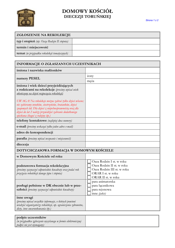 DOMOWY KOŚCIÓŁ DIECEZJI TORUŃSKIEJ Strona 1 z 2 ZGŁOSZENIE NA REKOLEKCJE typ i stopień (np. Oaza Rodzin II stopnia) termin i miejscowość temat (w przypadku rekolekcji tematycznych) INFORMACJE O ZGŁASZANYCH UCZESTNIKACH imiona i nazwiska małżonków numery PESEL żony męża imiona i wiek dzieci przyjeżdżających z rodzicami na rekolekcje (prosimy wpisać wiek ukończony na dzień rozpoczęcia rekolekcji) UWAGA! Na rekolekcje można zabrać tylko dzieci własne; nie zabieramy wnuków, siostrzeńców, bratanków, dzieci znajomych itd. Dla dzieci z niepełnosprawnością oraz dla dzieci do lat 2 należy przewidzieć zabranie dodatkowego opiekuna (kogoś z rodziny itp.) telefony kontaktowe (najlepiej dwa numery) e-mail (prosimy wskazać tylko jeden adres e-mail) adres do korespondencji parafia (prosimy wpisać wezwanie i miejscowość) diecezja DOTYCHCZASOWA FORMACJA W DOMOWYM KOŚCIELE w Domowym Kościele od roku podstawowa formacja rekolekcyjna (prosimy zaznaczyć odpowiednie kwadraty oraz podać rok przeżycia rekolekcji danego typu i stopnia) posługi pełnione w DK obecnie lub w przeszłości (prosimy zaznaczyć odpowiednie kwadraty) inne uwagi (prosimy wpisać wszelkie informacje, o których powinni wiedzieć organizatorzy rekolekcji, np. ograniczenia zdrowotne, diety, inne uwarunkowania itp.) podpis uczestników (w przypadku zgłoszenie wysyłanego w formie elektronicznej podpis nie jest wymagany) Oaza Rodzin I st. w roku Oaza Rodzin II st. w roku Oaza Rodzin III st. w roku ORAR I st. w roku ORAR II st. w roku para animatorska para łącznikowa para rejonowa inne (jakie) DOMOWY KOŚCIÓŁ DIECEZJI TORUŃSKIEJ Strona 2 z 2 Potwierdzenie zgłoszenia na rekolekcje przez parę diecezjalną (czytelny podpis pary diecezjalnej z macierzystej diecezji wraz z telefonem i mailem kontaktowym) Uwaga! W przypadku przesyłania zgłoszenia w formie elektronicznej należy wysłać je także do pary diecezjalnej swojej macierzystej diecezji z prośba o potwierdzenia zgłoszenia drogą elektroniczną. Oryginalny podpis nie jest w takim przypadku wymagany. Wypełnioną i podpisaną kartę zgłoszenia na rekolekcje należy przesłać do Diakonii Oaz Rekolekcyjnych Domowego Kościoła diecezji toruńskiej: pocztą elektroniczną na adres mailowy: [email protected], albo pocztą tradycyjną na adres: Teresa i Marian Kopcowie, ul. Tarnowska 30, 87-100 Toruń. Przedpłaty na rekolekcje organizowane przez Domowy Kościół diecezji toruńskiej należy wpłacać na rachunek bankowy: odbiorca: numer: tytułem: Domowy Kościół Toruń 78 1140 2004 0000 3202 7400 4461 wpłata na rekolekcje typ i stopień lub temat, termin i miejscowość (bardzo prosimy o dokładne wpisywanie tych danych)