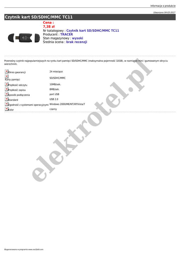 Informacje o produkcie Utworzono 04-03-2017 Czytnik kart SD/SDHC/MMC TC11 Cena : 7,38 zł Nr katalogowy : Czytnik kart SD/SDHC/MMC TC11 Producent : TRACER Stan magazynowy : wysoki Średnia ocena : brak recenzji Przenośny czytnik najpopularniejszych na rynku kart pamięci SD/SDHC/MMC (maksymalna pojemność 32GB), w rozmiarze mini i gumowanym okryciu wierzchnim. l.p l 24 miesiące Okres gwarancji Prędkość odczytu 10MB/sek. Prędkość zapisu 8MB/sek. Sposób podłączenia port USB Standard USB 2.0 te SD/SDHC/MMC Karty pamięci Zgodność z systemami operacyjnymi Windows 2000/ME/NT/XP/Vista/7 czarny el ek tr o Kolor Wygenerowano w programie www.oscGold.com