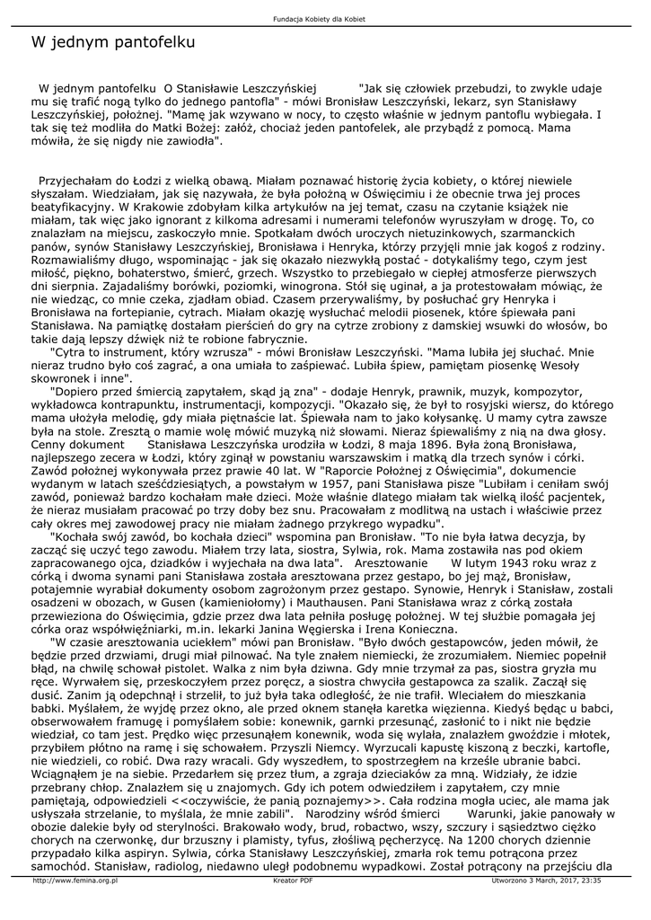 Fundacja Kobiety dla Kobiet W jednym pantofelku W jednym pantofelku O Stanisławie Leszczyńskiej "Jak się człowiek przebudzi, to zwykle udaje mu się trafić nogą tylko do jednego pantofla" - mówi Bronisław Leszczyński, lekarz, syn Stanisławy Leszczyńskiej, położnej. "Mamę jak wzywano w nocy, to często właśnie w jednym pantoflu wybiegała. I tak się też modliła do Matki Bożej: załóż, chociaż jeden pantofelek, ale przybądź z pomocą. Mama mówiła, że się nigdy nie zawiodła". Przyjechałam do Łodzi z wielką obawą. Miałam poznawać historię życia kobiety, o której niewiele słyszałam. Wiedziałam, jak się nazywała, że była położną w Oświęcimiu i że obecnie trwa jej proces beatyfikacyjny. W Krakowie zdobyłam kilka artykułów na jej temat, czasu na czytanie książek nie miałam, tak więc jako ignorant z kilkoma adresami i numerami telefonów wyruszyłam w drogę. To, co znalazłam na miejscu, zaskoczyło mnie. Spotkałam dwóch uroczych nietuzinkowych, szarmanckich panów, synów Stanisławy Leszczyńskiej, Bronisława i Henryka, którzy przyjęli mnie jak kogoś z rodziny. Rozmawialiśmy długo, wspominając - jak się okazało niezwykłą postać - dotykaliśmy tego, czym jest miłość, piękno, bohaterstwo, śmierć, grzech. Wszystko to przebiegało w ciepłej atmosferze pierwszych dni sierpnia. Zajadaliśmy borówki, poziomki, winogrona. Stół się uginał, a ja protestowałam mówiąc, że nie wiedząc, co mnie czeka, zjadłam obiad. Czasem przerywaliśmy, by posłuchać gry Henryka i Bronisława na fortepianie, cytrach. Miałam okazję wysłuchać melodii piosenek, które śpiewała pani Stanisława. Na pamiątkę dostałam pierścień do gry na cytrze zrobiony z damskiej wsuwki do włosów, bo takie dają lepszy dźwięk niż te robione fabrycznie. "Cytra to instrument, który wzrusza" - mówi Bronisław Leszczyński. "Mama lubiła jej słuchać. Mnie nieraz trudno było coś zagrać, a ona umiała to zaśpiewać. Lubiła śpiew, pamiętam piosenkę Wesoły skowronek i inne". "Dopiero przed śmiercią zapytałem, skąd ją zna" - dodaje Henryk, prawnik, muzyk, kompozytor, wykładowca kontrapunktu, instrumentacji, kompozycji. "Okazało się, że był to rosyjski wiersz, do którego mama ułożyła melodię, gdy miała piętnaście lat. Śpiewała nam to jako kołysankę. U mamy cytra zawsze była na stole. Zresztą o mamie wolę mówić muzyką niż słowami. Nieraz śpiewaliśmy z nią na dwa głosy. Cenny dokument Stanisława Leszczyńska urodziła w Łodzi, 8 maja 1896. Była żoną Bronisława, najlepszego zecera w Łodzi, który zginął w powstaniu warszawskim i matką dla trzech synów i córki. Zawód położnej wykonywała przez prawie 40 lat. W "Raporcie Położnej z Oświęcimia", dokumencie wydanym w latach sześćdziesiątych, a powstałym w 1957, pani Stanisława pisze "Lubiłam i ceniłam swój zawód, ponieważ bardzo kochałam małe dzieci. Może właśnie dlatego miałam tak wielką ilość pacjentek, że nieraz musiałam pracować po trzy doby bez snu. Pracowałam z modlitwą na ustach i właściwie przez cały okres mej zawodowej pracy nie miałam żadnego przykrego wypadku". "Kochała swój zawód, bo kochała dzieci" wspomina pan Bronisław. "To nie była łatwa decyzja, by zacząć się uczyć tego zawodu. Miałem trzy lata, siostra, Sylwia, rok. Mama zostawiła nas pod okiem zapracowanego ojca, dziadków i wyjechała na dwa lata". Aresztowanie W lutym 1943 roku wraz z córką i dwoma synami pani Stanisława została aresztowana przez gestapo, bo jej mąż, Bronisław, potajemnie wyrabiał dokumenty osobom zagrożonym przez gestapo. Synowie, Henryk i Stanisław, zostali osadzeni w obozach, w Gusen (kamieniołomy) i Mauthausen. Pani Stanisława wraz z córką została przewieziona do Oświęcimia, gdzie przez dwa lata pełniła posługę położnej. W tej służbie pomagała jej córka oraz współwięźniarki, m.in. lekarki Janina Węgierska i Irena Konieczna. "W czasie aresztowania uciekłem" mówi pan Bronisław. "Było dwóch gestapowców, jeden mówił, że będzie przed drzwiami, drugi miał pilnować. Na tyle znałem niemiecki, że zrozumiałem. Niemiec popełnił błąd, na chwilę schował pistolet. Walka z nim była dziwna. Gdy mnie trzymał za pas, siostra gryzła mu ręce. Wyrwałem się, przeskoczyłem przez poręcz, a siostra chwyciła gestapowca za szalik. Zaczął się dusić. Zanim ją odepchnął i strzelił, to już była taka odległość, że nie trafił. Wleciałem do mieszkania babki. Myślałem, że wyjdę przez okno, ale przed oknem stanęła karetka więzienna. Kiedyś będąc u babci, obserwowałem framugę i pomyślałem sobie: konewnik, garnki przesunąć, zasłonić to i nikt nie będzie wiedział, co tam jest. Prędko więc przesunąłem konewnik, woda się wylała, znalazłem gwoździe i młotek, przybiłem płótno na ramę i się schowałem. Przyszli Niemcy. Wyrzucali kapustę kiszoną z beczki, kartofle, nie wiedzieli, co robić. Dwa razy wracali. Gdy wyszedłem, to spostrzegłem na krześle ubranie babci. Wciągnąłem je na siebie. Przedarłem się przez tłum, a zgraja dzieciaków za mną. Widziały, że idzie przebrany chłop. Znalazłem się u znajomych. Gdy ich potem odwiedziłem i zapytałem, czy mnie pamiętają, odpowiedzieli <<oczywiście, że panią poznajemy>>. Cała rodzina mogła uciec, ale mama jak usłyszała strzelanie, to myślala, że mnie zabili". Narodziny wśród śmierci Warunki, jakie panowały w obozie dalekie były od sterylności. Brakowało wody, brud, robactwo, wszy, szczury i sąsiedztwo ciężko chorych na czerwonkę, dur brzuszny i plamisty, tyfus, złośliwą pęcherzycę. Na 1200 chorych dziennie przypadało kilka aspiryn. Sylwia, córka Stanisławy Leszczyńskiej, zmarła rok temu potrącona przez samochód. Stanisław, radiolog, niedawno uległ podobnemu wypadkowi. Został potrącony na przejściu dla http://www.femina.org.pl Kreator PDF Utwor