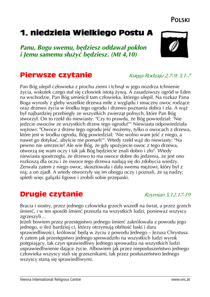 Polski Panu, Bogu swemu, będziesz oddawał pokłon i Jemu samemu służyć będziesz. (Mt 4,10) Pan Bóg ulepił człowieka z prochu ziemi i tchnął w jego nozdrza tchnienie życia, wskutek czego stał się człowiek istotą żywą. A zasadziwszy ogród w Eden na wschodzie, Pan Bóg umieścił tam człowieka, którego ulepił. Na rozkaz Pana Boga wyrosły z gleby wszelkie drzewa miłe z wyglądu i smaczny owoc rodzące oraz drzewo życia w środku tego ogrodu i drzewo poznania dobra i zła. A wąż był najbardziej przebiegły ze wszystkich zwierząt polnych, które Pan Bóg stworzył. On to rzekł do niewiasty: "Czy to prawda, że Bóg powiedział: 'Nie jedzcie owoców ze wszystkich drzew tego ogrodu?'" Niewiasta odpowiedziała wężowi: "Owoce z drzew tego ogrodu jeść możemy, tylko o owocach z drzewa, które jest w środku ogrodu, Bóg powiedział: 'Nie wolno wam jeść z niego, a nawet go dotykać, abyście nie pomarli'". Wtedy rzekł wąż do niewiasty: "Na pewno nie umrzecie! Ale wie Bóg, że gdy spożyjecie owoc z tego drzewa, otworzą się wam oczy i tak jak Bóg będziecie znali dobro i zło". Wtedy niewiasta spostrzegła, że drzewo to ma owoce dobre do jedzenia, że jest ono rozkoszą dla oczu i że owoce tego drzewa nadają się do zdobycia wiedzy. Zerwała zatem z niego owoc, skosztowała i dała swemu mężowi, który był z nią; a on zjadł. A wtedy otworzyły się im obojgu oczy i poznali, że są nadzy; spletli więc gałązki figowe i zrobili sobie przepaski. Bracia i siostry, przez jednego człowieka grzech wszedł na świat, a przez grzech śmierć, i w ten sposób śmierć przeszła na wszystkich ludzi, ponieważ wszyscy zgrzeszyli… Jeżeli bowiem przez przestępstwo jednego śmierć zakrólowała z powodu jego jednego, o ileż bardziej ci, którzy otrzymują obfitość łaski i daru sprawiedliwości, królować będą w życiu z powodu Jednego – Jezusa Chrystusa. A zatem jak przestępstwo jednego sprowadziło na wszystkich ludzi wyrok potępiający, tak czyn sprawiedliwy Jednego sprowadza na wszystkich ludzi usprawiedliwienie dające życie. Albowiem jak przez nieposłuszeństwo jednego człowieka wszyscy stali się grzesznikami, tak przez posłuszeństwo Jednego wszyscy staną się sprawiedliwymi. Vienna International Religious Centre www.virc.at Duch wyprowadził Jezusa na pustynię, aby był kuszony przez diabła. A gdy przepościł czterdzieści dni i czterdzieści nocy, odczuł w końcu głód. Wtedy przystąpił kusiciel i rzekł do Niego: "Jeśli jesteś Synem Bożym, powiedz, żeby te kamienie stały się chlebem". Lecz On mu odparł: "Napisane jest: 'Nie samym chlebem żyje człowiek, lecz każdym słowem, które pochodzi z ust Bożych'". Wtedy wziął Go diabeł do Miasta świętego, postawił na narożniku świątyni i rzekł Mu: "Jeśli jesteś Synem Bożym, rzuć się w dół, jest przecież napisane: 'Aniołom swoim rozkażę o Tobie, a na rękach nosić Cię będą, byś przypadkiem nie uraził swej nogi o kamień'". Odrzekł mu Jezus: "Ale jest napisane także: 'Nie będziesz wystawiał na próbę Pana, Boga swego'". Jeszcze raz wziął Go diabeł na bardzo wysoką górę, pokazał Mu wszystkie królestwa świata oraz ich przepych i rzekł do Niego: "Dam Ci to wszystko, jeśli upadniesz i oddasz mi pokłon". Na to odrzekł mu Jezus: "Idź precz, szatanie! Jest bowiem napisane: 'Panu, Bogu swemu, będziesz oddawał pokłon i Jemu samemu służyć będziesz'". Wtedy opuścił Go diabeł, a oto aniołowie przystąpili i usługiwali Mu. Czterdziestodniowy czas postu na pustyni umożliwia ciału i duchowi Jezusa stanie się bardziej wolnym, a świadomości Jego posłannictwa bardziej dojrzałą. Jednocześnie pozwala Mu doświadczyć, solidarnie ze wszystkimi głodującymi i prześladowanymi, 40 lat wygnania i samotności Izraelitów podczas ich wędrówki po pustyni po wyjściu z Egiptu. W życiu Jezusa nie kończy się jednak wszystko na tym jednorazowym kuszeniu. Biblia w swoim szczególnym opisie potrójnego kuszenia chce przede wszystkim uzmysłowić, że Jezus, prawdziwy człowiek i prawdziwy Bóg, jest wystawiany na próbę przez zło w ciągu całego swojego życia. Kuszenia ze strony przeciwników Jezusa miały na celu zamazanie i zniszczenie świadomości Jego misji. Czy uda Mu się zrezygnować z pokazowych cudów i światowych pożądań władzy? Czy wytrzyma pokładanie zaufania jedynie w Bożych planach, a nie we własnych siłach? Wówczas, gdy Jezus wyczuwał pokusę światowego mesjanizmu, odrzucał ją, aby tym samym oprzeć się jedynie na słowie Boga. Usuwał się od mas ludzkich, które domagały się cudów i chciały uczynić go królem. Zdecydowanie gani Piotra, gdy tamten próbuje uciec od swojej drogi cierpienia. Jezus był gotowy pić z gorzkiego kielicha i zrezygnować z ratowania siebie samego, gdy wisiał na krzyżu. U początku czasu Wielkiego Postu Jezus wskazuje nam kierunek. Nie należy wybierać pokus i przyjemności społeczeństwa konsumpcyjnego, pieniądza lub ambicji, lecz tego, który powinien być jedynym, prawdziwym źródłem naszego życia i naszego działania – samego Boga. Vienna International Religious Centre [email protected] Panu, Bogu swemu, będziesz oddawał pokłon i Jemu samemu służyć będziesz. (Mt 4,10) Pan Bóg ulepił człowieka z prochu ziemi i tchnął w jego nozdrza tchnienie życia, wskutek czego stał się człowiek istotą żywą. A zasadziwszy ogród w Eden na wschodzie, Pan Bóg umieścił tam człowieka, którego ulepił. Na rozkaz Pana Boga wyrosły z gleby wszelkie drzewa miłe z wyglądu i smaczny owoc rodzące oraz drzewo życia w środku tego ogrodu i drzewo poznania dobra i zła. A wąż był najbardziej przebiegły ze wszystkich zwierząt polnych, które Pan Bóg stworzył. On to rzekł do niewiasty: "Czy to prawda, że Bóg powiedział: 'Nie jedzcie owoców ze wszystkich drzew tego ogrodu?'" Niewiasta odpowiedziała wężowi: "Owoce z drzew tego ogrodu jeść możem