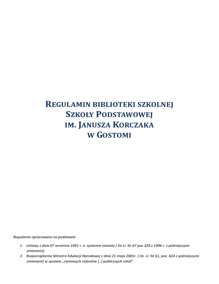 REGULAMIN BIBLIOTEKI SZKOLNEJ SZKOŁY PODSTAWOWEJ IM. JANUSZA KORCZAKA W GOSTOMI Regulamin opracowano na podstawie: 1. Ustawy z dnia 07 września 1991 r. o systemie oświaty ( Dz.U. Nr 67 poz.329 z 1996 r. z późniejszymi zmianami); 2. Rozporządzenia Ministra Edukacji Narodowej z dnia 21 maja 2001r. ( Dz. U. Nr 61, poz. 624 z późniejszymi zmianami) w sprawie „ramowych statutów *..+ publicznych szkół”. Regulamin biblioteki szkolnej §1. Szkoła Podstawowa im. Janusza Korczaka w Gostomi Cele i zadania. 1. Biblioteka jest interdyscyplinarną pracownią szkolną, która: a) służy realizacji potrzeb i zainteresowao uczniów, b) służy do realizacji zadao dydaktyczno-wychowawczych, c) pełni funkcje szkolnego ośrodka informacji, d) wspiera doskonalenie zawodowe nauczycieli, e) popularyzuje wiedzę pedagogiczną wśród rodziców, f) uczestniczy w przygotowaniu uczniów do samokształcenia i edukacji ustawicznej. 2. Funkcje biblioteki: a) kształcąca poprzez: I. rozbudzenie i rozwijanie potrzeb czytelniczych i informacyjnych związanych z nauką szkolną i z indywidualnymi zainteresowaniami uczniów, II. przysposabianie ich do samokształcenia, III. aktywne uczestniczenie w realizacji szkolnego programu ścieżek między przedmiotowych, IV. tworzenie warunków do poszukiwania, porządkowania i wykorzystywania informacji z różnych źródeł oraz efektywnego posługiwania się technologią informacyjną, V. kształtowanie kultury czytelniczej i wzbogacanie kultury humanistycznej uczniów, VI. wdrażanie czytelników do poszanowania książki, czasopisma i innych materiałów bibliotecznych oraz sprzętu komputerowego. b) opiekuocza poprzez: I. rozpoznawanie aktywności czytelniczej uczniów, potrzeb i poziomu kompetencji czytelniczych, II. wykrywanie u potencjalnych czytelników przyczyn braku potrzeby czytania i udzielanie pomocy w ich przezwyciężaniu, III. wspomaganie działao szkoły w realizacji programów: ekologicznego, profilaktyki prozdrowotnej, przeciwdziałaniu uzależnieniom, ekologicznych, IV. otaczanie opieką wszystkich uczniów w ich poszukiwaniach czytelniczych, V. wspomaganie rodziców w rozwiązywaniu problemów wychowawczych poprzez wskazywanie im literatury pedagogicznej. c) kulturalna poprzez: I. uczestniczenie w rozwijaniu życia kulturalnego uczniów, II. wspieranie kształtowania umiejętności odbioru wartości kulturalnych oraz ich tworzenia. 3. Do zadao biblioteki szkolnej należy: a) popularyzacja nowości wydawniczych, b) statystyka czytelnictwa, c) informacja problemowa oparta na wykorzystaniu tradycyjnego i komputerowego warsztatu informacyjnego, d) komputeryzacja biblioteki e) wystawki tematyczne i okolicznościowe, f) renowacja i konserwacja księgozbioru. 4. Biblioteka składa się z: a) Wypożyczalni. b) Czytelni. c) Pracowni multimedialnej. -1- Regulamin biblioteki szkolnej §2. Szkoła Podstawowa im. Janusza Korczaka w Gostomi Zbiory 1. Biblioteka Szkolna gromadzi książki, czasopisma i inne materiały niezbędne do realizacji planu dydaktycznowychowawczego szkoły. 2. Zbiory biblioteki szkolnej obejmują dwie grupy materiałów: a) dokumenty piśmiennicze: I. wydawnictwa informacyjne (słowniki językowe, encyklopedie, atlasy, roczniki statystyczne, teksty źródłowe itp.), II. podręczniki i programy szkolne dla nauczycieli, III. lektury podstawowe do języka polskiego i innych przedmiotów nauczania, IV. lektury uzupełniające do języka polskiego, V. literaturę popularnonaukową i naukową, VI. wybrane pozycje z literatury pięknej, VII. wydawnictwa albumowe z dziedziny krajoznawstwa, VIII. czasopisma: (a) dla młodzieży, (b) specjalistyczne dotyczące specjalności nauczanych w szkole, (c) ogólnopedagogiczne, (d) naukowe i popularnonaukowe, (e) społeczno-kulturalne, (f) gazety, (g) inne wydawnictwa potrzebne do realizacji poszczególnych przedmiotów nauczania i zajęd edukacyjnych (normy, literaturę firmową itp.), (h) podstawowe wydawnictwa z psychologii, socjologii, pedagogiki i dydaktyki stanowiące pomoc w pracy dydaktyczno-wychowawczej nauczycieli i pedagogizacji rodziców, (i) publikacje nauczycieli. b) dokumenty niepiśmiennicze: I. nowoczesne nośniki informacji (płyty CD, DVD, dyskietki), II. kasety magnetofonowe, III. materiały audiowizualne wytworzone w procesie dydaktycznym szkoły, IV. filmy dydaktyczne popularnonaukowe i instruktażowe. 3. W bibliotece szkolnej stosuje się następujące zasady rozmieszczenia zbiorów: a) księgozbiór podstawowy w wypożyczalni, b) czasopisma w czytelni, c) zbiory wydzielone(częściowo wymienne) np. słowniki, atlasy w pracowniach i klasach. 4. Księgozbiór ustawiony jest w układzie działowo-alfabetycznym: a) dział lektur według układu alfabetycznego, b) literatura naukowa, fachowa, popularnonaukowa według UKD, c) księgozbiór dla nauczycieli według UKD, d) wydzielony dział literatury dotyczącej „Godzin do dyspozycji wychowawcy”, e) wszystkie zbiory biblioteczne opatrzone są sygnaturą, f) zbiory audiowizualne ułożone są według poszczególnych typów zbiorów w układzie numerycznym. §3. Organizacja udostępniania zbiorów 1. Czytelnicy mają prawo do bezpłatnego korzystania z księgozbioru biblioteki. 2. Z biblioteki szkolnej mogą korzystad: -2- Regulamin biblioteki szkolnej a) b) c) d) Szkoła Podstawowa im. Janusza Korczaka w Gostomi uczniowie szkoły, pracownicy szkoły, rodzice uczniów szkoły, inni użytkownicy na podstawie pisemnej zgody Dyrektora Szkoły. 3. Każdy uczeo klasy pierwszej i nowo przyjęty do szkoły zapoznaje się z regulaminem biblioteki szkolnej potwierdzając to podpisem na liście klasowej przechowywanej w bibliotece szkolnej. 4. Księgozbiór podręczny (słowniki, encyklopedie, leksykony, wydawnictwa albumowe) udostępnia się tylko w czytelni, a pozostałe książki i czasopisma można wypożyczad do domu. 5. W przypadku zniszczenia lub zagubienia książki, czasopisma, płyty CD lub innego nośnika informacji, czytelnik z