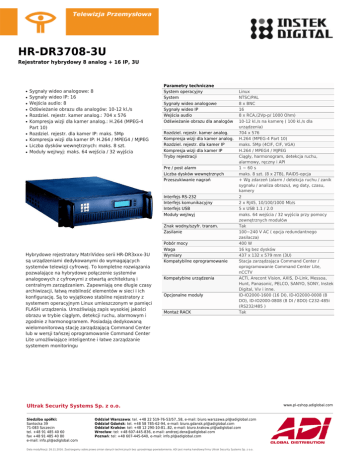 HR-DR3708-3U Rejestrator hybrydowy 8 analog + 16 IP, 3U ● ● ● ● ● ● ● ● ● ● Sygnały wideo analogowe: 8 Sygnały wideo IP: 16 Wejścia audio: 8 Odświeżanie obrazu dla analogów: 10-12 kl./s Rozdziel. rejestr. kamer analog.: 704 x 576 Kompresja wizji dla kamer analog.: H.264 (MPEG-4 Part 10) Rozdziel. rejestr. dla kamer IP: maks. 5Mp Kompresja wizji dla kamer IP: H.264 / MPEG4 / MJPEG Liczba dysków wewnętrznych: maks. 8 szt. Moduły wej/wyj: maks. 64 wejścia / 32 wyjścia Parametry techniczne System operacyjny System Sygnały wideo analogowe Sygnały wideo IP Wejścia audio Odświeżanie obrazu dla analogów Rozdziel. rejestr. kamer analog. Kompresja wizji dla kamer analog. Rozdziel. rejestr. dla kamer IP Kompresja wizji dla kamer IP Tryby rejestracji Pre / post alarm Liczba dysków wewnętrznych Przeszukiwanie nagrań Interfejs RS-232 Interfejs komunikacyjny Interfejs USB Moduły wej/wyj Znak wodny/szyfr. transm. Zasilanie Hybrydowe rejestratory MatriVideo serii HR-DR3xxx-3U są urządzeniami dedykowanymi do wymagających systemów telewizji cyfrowej. To kompletne rozwiązania pozwalające na hybrydowe połączenie systemów analogowych z cyfrowymi z otwartą architekturą i centralnym zarządzaniem. Zapewniają one długie czasy archiwizacji, łatwą mobilność elementów w sieci i ich konfigurację. Są to wyjątkowo stabilne rejestratory z systemem operacyjnym Linux umieszczonym w pamięci FLASH urządzenia. Umożliwiają zapis wysokiej jakości obrazu w trybie ciągłym, detekcji ruchu, alarmowym i zgodnie z harmonogramem. Posiadają dedykowaną wielomonitorową stację zarządzającą Command Center lub w wersji tańszej oprogramowanie Command Center Lite umożliwiające inteligentne i łatwe zarządzanie systemem monitoringu Pobór mocy Waga Wymiary Kompatybilne oprogramowanie Kompatybine urządzenia Opcjonalne moduły Montaż RACK Linux NTSC/PAL 8 x BNC 16 8 x RCA,(2Vp-p/ 1000 Ohm) 10-12 kl./s na kamerę ( 100 kl./s dla urządzenia) 704 x 576 H.264 (MPEG-4 Part 10) maks. 5Mp (4CIF, CIF, VGA) H.264 / MPEG4 / MJPEG Ciągły, harmonogram, detekcja ruchu, alarmowy, ręczny i API 1 ~ 60 s maks. 8 szt. (8 x 2TB), RAID5-opcja + Wg zdarzeń (alarm / detekcja ruchu / zanik sygnału / analiza obrazu), wg daty, czasu, kamery 2 2 x RJ45, 10/100/1000 Mb/s 5 x USB 1.1 / 2.0 maks. 64 wejścia / 32 wyjścia przy pomocy zewnętrznych modułów Tak 100~240 V AC ( opcja redundantnego zasilacza) 400 W 16 kg bez dysków 437 x 132 x 579 mm (3U) Stacja zarządzająca Command Center / oprogramowanie Command Center Lite, nCCTV ACTi, Arecont Vision, AXIS, D-Link, Messoa, Hunt, Panasonic, PELCO, SANYO, SONY, Instek Digital, Viv i inne. ID-IO2000-1600 (16 DI), ID-IO2000-0008 (8 DO), ID-IO2000-0808 (8 DI / 8DO) C232-485i (RS232/485 ) Tak Ultrak Security Systems Sp. z o.o. Siedziba spółki: Santocka 39 71-083 Szczecin tel. +48 91 485 40 60 fax +48 91 485 40 80 e-mail: [email protected] Oddział Warszawa: tel. +48 22 519-76-53/57..58, e-mail: [email protected] Oddział Gdańsk: tel. +48 58 785-62-94, e-mail: [email protected] Oddział Kraków: tel: +48 12 290-10-81..82, e-mail: [email protected] Wrocław: tel: +48 607-445-836, e-mail: [email protected] Poznań: tel: +48 607-445-640, e-mail: [email protected] Data modyfikacji: 26.11.2016. Zastrzegamy sobie prawo zmian danych technicznych bez uprzedniego powiadomienia. ADI jest marką handlową firmy Ultrak Security Systems Sp. z o.o. www.pl-eshop.adiglobal.com