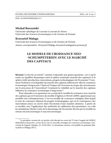 STUDIA OECONOMICA POSNANIENSIA 2016, vol. 4, no. 3 DOI: 10.18559/SOEP.2016.3.3 Michał Burzyński Université catholique de Louvain à Louvain-la-Neuve Université des Sciences Economiques et de Gestion de Poznań Krzysztof Malaga Université des Sciences Economiques et de Gestion de Poznań Auteur correspondant : Krzysztof Malaga, [email protected] LE MODELE DE CROISSANCE NEO-SCHUMPETERIEN AVEC LE MARCHÉ DES CAPITAUX Résumé: Le but de cet article1 consiste à répondre aux quatre questions : est-ce qu’il existe un équilibre dynamique entre la sphère nominale (marché des capitaux) et la sphère réelle (production, innovations, progrès technologique) de l’économie ? Comment l’échéance et la liquidité du marché des capitaux influencent-elles la croissance économique à long terme ? Quel est l’impact de l’aversion au risque des investisseurs sur le processus de l’innovation? Comment la volatilité sur le marché des capitaux influence la croissance économique à long terme ? Pour répondre à ces questions on a construit le modèle de croissance avec marché des capitaux qui est l’extension du modèle d’Aghion et Howitt [2009], appartenant aux modèles néo-schumpeteriens. C’est un modèle de croissance endogène dans lequel le taux de croissance dépend du progrès technologique, qui est la conséquence des innovations mises en oeuvre dans l’économie d’une manière aléatoire. A partir de ce modèle, avec l’application des méthodes de calibration des paramètres, on a fait les simulations Monte Carlo de la dynamique de l’économie décrite par le modèle au niveau microéconomique et macroéconomique. 1 La première version de cet article a été discuté au cours du 57-ème Congrès de l‘AIELF, Refondation financière, sorties de la crise et nouvelles stratégies de croissance économique, Université de Zagreb, Opatija, 23–25.05.2011. La deuxième version a été publié en polonais [Burzyński et Malaga 2011]. 48 Michał Burzyński, Krzysztof Malaga Mots Clé : croissance économique, modèles néo-schumpeteriens, destruction créative, innovations, progrès technologique, diffusion de la technologie, marché des capitaux, marchés des biens intermédiaires et finaux, secteur de R&D, gouvernement. JEL Classyfication : G4, E6. THE NEO-SCHUMPETERIAN GROWTH MODEL WITH THE CAPITAL MARKET Abstract: The purpose of this article is to answer the four questions: what is the dynamic equilibrium between the nominal sphere (capital market) and the real sphere (production, innovation, technological progress) of the economy? How do the maturity and liquidity of the capital market influence long-term growth? What is the impact of the relative risk aversion of investors on the process of innovation? How does long-term volatility in the capital market influences economic growth? To answer these questions we have built the model of growth of the the capital market. It extends the Aghion and Howitt model [2009], which belongs to the group of neo-Schumpeterian models. It is an endogenous growth model in which the rate of growth depends on technological progress that results from innovations implemented in the economy in a random manner. Based on that model, after calibration of its parameters, we have presented the results of the application of the Monte Carlo method to the simulation of an economy’s dynamics on both microeconomic and macroeconomic levels. Keywords: economic growth, neo-Schumpeterian models, creative destruction, innovation, technological development, diffusion of technology, capital markets, markets for intermediate and final goods, R&D sector, government. Introduction Un des problèmes clé dans la théorie contemporaine de la croissance économique est la recherche de la réponse à la question sur les conditions d’existence de l’équilibre dynamique entre les sphères réelle et nominale de l’économie. Par la sphère réelle de l’économie on comprend tous les processus dont l’essence et les effets concernent les aspects matériels. Tandis que par la sphère nominale de l’économie on comprend les processus, qui sont liés à l’existence des marchés financiers et des capitaux – Malaga [2011]. Le modèle de croissance néo-schumpétérien avec le marché des capitaux 49 L’impact du marché des capitaux sur la croissance économique à long terme est envisagé dans le cadres de trois domaines thématiques: impact de l’échéance et de liquidité du marché des capitaux sur la croissance économique, implication de la volatilité pour le marché des capitaux, croissance économique et les coûts d’acquisition du capital financier par les entreprises et le rôle de l’intégration internationale des marchés des capitaux dans la croissance et le développement économique ainsi que pour la stabilité financière à l’échelle mondiale. Les conclusions qui suivent de nombreuses recherches empiriques en ce domaine et qui sont réalisées avec l’application des différents modèles et méthodes économetriques ne sont pas claires. Par exemple, Beck, Levine et Loayza [2000] et Beck et Levine [2004], à la base de la recherche sur les différents pays et périodes, ont déclaré que le marché des capitaux à l’état de maturité stimule l’accumulation du capital physique et les investissements dans le secteur R&D. Ils constatent aussi qu’il existe une corrélation positive entre les variables qui décrivent le marché des capitaux en maturité et le PIB par tête. D’autre part, Arestis et Demetriades [1997, 2001] affirment qu’à cause d’une grande complexité des processus analysés il est impossible à formuler les conclusions générales sur les relations entre les marchés des capitaux et le PIB par tête. Enfin, Stiglitz [2000], préconise que la libéralisation des marchés financiers, de plus en plus grande, génére l’instabilité dans l’économie mondiale, ce qui n’est pas propice pour la cr