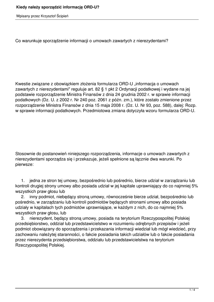 Kiedy należy sporządzić informację ORD-U? Wpisany przez Krzysztof Ścipień Co warunkuje sporządzenie informacji o umowach zawartych z nierezydentami? Kwestie związane z obowiązkiem złożenia formularza ORD-U „informacja o umowach zawartych z nierezydentami" reguluje art. 82 § 1 pkt 2 Ordynacji podatkowej i wydane na jej podstawie rozporządzenie Ministra Finansów z dnia 24 grudnia 2002 r. w sprawie informacji podatkowych (Dz. U. z 2002 r. Nr 240 poz. 2061 z późn. zm.), które zostało zmienione przez rozporządzenie Ministra Finansów z dnia 15 maja 2008 r. (Dz. U. Nr 93, poz. 588), dalej: Rozp. w sprawie informacji podatkowych. Przedmiotowa zmiana dotyczyła wzoru formularza ORD-U. Stosownie do postanowień niniejszego rozporządzenia, informacje o umowach zawartych z nierezydentami sporządza się i przekazuje, jeżeli spełnione są łącznie dwa warunki. Po pierwsze: 1. jedna ze stron tej umowy, bezpośrednio lub pośrednio, bierze udział w zarządzaniu lub kontroli drugiej strony umowy albo posiada udział w jej kapitale uprawniający do co najmniej 5% wszystkich praw głosu lub 2. inny podmiot, niebędący stroną umowy, równocześnie bierze udział, bezpośrednio lub pośrednio, w zarządzaniu lub kontroli podmiotów będących stronami umowy albo posiada udziały w kapitałach tych podmiotów uprawniające, w każdym z nich, do co najmniej 5% wszystkich praw głosu, lub 3. nierezydent, będący stroną umowy, posiada na terytorium Rzeczypospolitej Polskiej przedsiębiorstwo, oddział lub przedstawicielstwo w rozumieniu odrębnych przepisów i jeżeli podmiot obowiązany do sporządzenia i przekazania informacji wiedział lub mógł wiedzieć, przy zachowaniu należytej staranności, o fakcie posiadania takich udziałów lub o fakcie posiadania przez nierezydenta przedsiębiorstwa, oddziału lub przedstawicielstwa na terytorium Rzeczypospolitej Polskiej. 1/4 Kiedy należy sporządzić informację ORD-U? Wpisany przez Krzysztof Ścipień Drugim warunkiem jest przekroczenie ustalonych progów kwotowych. I tak, do konkretyzacji obowiązku sporządzenia i przekazania informacji ORD-U dojdzie, gdy w przypadkach wymienionych powyżej odpowiednio: - w punktach 1 i 2 - zawarto umowy w danym roku podatkowym z tym samym nierezydentem, a suma należności albo suma zobowiązań wynikająca z tych umów przekroczyła równowartość 300 000 euro; - w punkcie 3 - zawarto umowy w danym roku podatkowym, w których jednorazowa wartość należności albo zobowiązań przekroczyła równowartość 5 000 euro. Podane wyżej kwoty w euro przelicza się na walutę polską po średnim kursie ustalonym przez Narodowy Bank Polski, na dzień 30 września roku poprzedzającego rok podatkowy, w którym zawarto umowę. W celu zdefiniowania pojęcia nierezydent należy odwołać się do przepisów ustawy z dnia 27 lipca 2002 r. Prawo dewizowe (Dz. U. Nr 141, poz. 1178 ze zm.), dalej: Prawo dewizowe. W myśl przepisu art. 2 ust. 1 pkt 2 Prawa dewizowego za nierezydenta uważa się: - osoby fizyczne mające miejsce zamieszkania za granicą oraz osoby prawne, a także inne podmioty mające siedzibę za granicą, posiadające zdolność zaciągania zobowiązań i nabywania praw we własnym imieniu; nierezydentami są również znajdujące się za granicą oddziały, przedstawicielstwa i przedsiębiorstwa utworzone przez rezydentów, - obce przedstawicielstwa dyplomatyczne, urzędy konsularne i inne obce przedstawicielstwa oraz misje specjalne i organizacje międzynarodowe, korzystające z immunitetów i przywilejów dyplomatycznych lub konsularnych. W informacji ORD-U podatnik jest zobowiązany uwzględnić wartość należności lub zobowiązań wynikającą z umów sporządzonych w formie pisemnej lub wartość wynikającą z wystawionych 2/4 Kiedy należy sporządzić informację ORD-U? Wpisany przez Krzysztof Ścipień lub otrzymanych faktur albo rachunków potwierdzających zawarcie umowy. Złożenie formularza ORD-U będzie konieczne również w sytuacji, gdy przekroczenie określonego progu kwotowego nastąpi w okresie późniejszym niż samo zawarcie umowy z nierezydentem. Na taką ewentualność zwrócił uwagę Naczelnik Pierwszego Mazowieckiego Urzędu Skarbowego w Warszawie w postanowieniu z dnia 13 września 2006 r., sygn. akt: 1471/DPD2/423-98/06/JB, stwierdzając, że nie jest konieczne wystąpienie jednocześnie obydwu zdarzeń, tj. zawarcia umowy i kwoty wynikającej z umowy w wysokości przekraczającej 300 000 euro. Dowodzenie, że obowiązek sporządzenia formularza ORD-U konkretyzuje się w sytuacji łącznego wystąpienia zawarcia umowy wraz z jednoczesnym przekroczeniem kwoty granicznej w tym samym roku podatkowym uznać należy za nieuprawnioną interpretację, która zawęża rozumienie przepisu § 3 ust. 2 Rozp. w sprawie informacji podatkowych, w którym nie zostało wskazane, aby zdarzenia te miały wystąpić w jednym i tym samym roku podatkowym. Czy w sytuacji, gdy doszło do zawarcia ustnie umowy pożyczki, a transfer środków nastąpił, taką operację również należy uwzględnić w informacji ORD-U? Z uwagi na konstrukcję prawną umowy pożyczki uregulowaną w art. 720 ustawy z dnia 23 kwietnia 1964 r. Kodeks cywilny (Dz. U. Nr 16, poz. 93 ze zm.), umowa pożyczki jest umową konsensualną, a zatem dochodzi do skutku przez samo porozumienie stron, a wydanie przedmiotu pożyczki i przeniesienie jej własności na pożyczkobiorcę stanowi wykonanie zawartej już umowy. Dlatego też zawarcie umowy pożyczki w formie ustnych porozumień również należy ująć w informacji ORD-U. 3/4 Kiedy należy sporządzić informację ORD-U? Wpisany przez Krzysztof Ścipień Informację ORD-U należy sporządzić za cały rok podatkowy w terminie trzech miesięcy, licząc od zakończenia danego roku podatkowego, przesyłając ją naczelnikowi urzędu skarbowego właściwemu ze względu na adres siedziby albo miejsce zamieszkania podmiotu sporządzającego informację. W pra