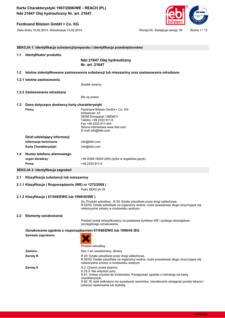 Karta Charakterystyki 1907/2006/WE - REACH (PL) febi 21647 Olej hydrauliczny Nr. art. 21647 Ferdinand Bilstein GmbH + Co. KG Data druku 18.02.2014, Aktualizacja 13.02.2014 1.1 Strona 1 / 12 Identyfikator produktu febi 21647 Olej hydrauliczny Nr. art. 21647 1.2 Istotne zidentyfikowane zastosowania substancji lub mieszaniny oraz zastosowania odradzane 1.2.1 Istotne zastosowania 1.2.2 Zastosowania odradzane 1.3 1.4 Firma Ferdinand Bilstein GmbH + Co. KG Wilhelmstr. 47 58256 Ennepetal / NIEMCY Telefon +49 2333 911-0 Fax +49 2333 911-444 Strona internetowa www.febi.com E-mail [email protected] Informacje techniczne [email protected] Karta Charakterystyki [email protected] Numer telefonu alarmowego organ doradczy Firma 2.1 +49 2333 911-0 Klasyfikacja substancji lub mieszaniny 2.1.1 Patrz SEKCJA 16 2.1.2 Klasyfikacja ( 67/548/EWG lub 1999/45/WE ) 2.2 Elementy oznakowania szczególnego oznakowania. Produkt szkodliwy Zawiera: Dec-1-en uwodorniony, dimery Zwroty R Zwroty S charakterystyki. bfe00050 Karta Charakterystyki 1907/2006/WE - REACH (PL) febi 21647 Olej hydrauliczny Nr. art. 21647 Ferdinand Bilstein GmbH + Co. KG Data druku 18.02.2014, Aktualizacja 13.02.2014 Strona 2 / 12 2.3 Nie zawiera substancji PBT wzgl. vPvB. Produkt typu: 50 - < 99 Dec-1-en uwodorniony, dimery CAS: 68649-11-6, EINECS/ELINCS: 500-228-5, ECB-Nr.: 01-2119493069-28-XXXX GHS/CLP: Acute Tox. 4: H332 - Asp. Tox. 1: H304 EEC: Xn, R 20-65 2,4 - < 5 CAS: 64742-79-6, EINECS/ELINCS: 265-182-8, EU-INDEX: 649-222-00-5 GHS/CLP: Acute Tox. 4: H332 - Asp. Tox. 1: H304 - Skin Irrit. 2: H315 - Aquatic Chronic 2: H411 EEC: Xn-N, R 20-65-38-51/53 0,1 - < 1 Butylowany hydroksytoluen CAS: 128-37-0, EINECS/ELINCS: 204-881-4, ECB-Nr.: 01-2119565113-46-XXXX GHS/CLP: Aquatic Chronic 1: H410, M = 1 EEC: N, R 50/53 0,1 - < 1 Phosphate ester derivative (Germany:72243/00/2010.0061) GHS/CLP: Aquatic Chronic 2: H411 - Eye Irrit. 2: H319 - Skin Irrit. 2: H315 EEC: Xi-N, R 36/38-51/53 Lista SVHC (Candidate List of Substances of Very High Concern for authorisation): nie SEKCJA 4: Pierwsza pomoc 4.1 Informacje ogólne oddechowych Kontakt z oczami 4.2 4.3 poszkodowanym Leczenie objawowe. bfe00050 Karta Charakterystyki 1907/2006/WE - REACH (PL) febi 21647 Olej hydrauliczny Nr. art. 21647 Ferdinand Bilstein GmbH + Co. KG Data druku 18.02.2014, Aktualizacja 13.02.2014 Strona 3 / 12 5.1 5.2 5.3 6.1 6.2 lub bariery olejowej). 6.3 6.4 Odniesienia do innych sekcji Patrz SEKCJA 8+13 7.1 przyjmowanie lekarstw. 7.2 7.3 Patrz sekcja 1.2 bfe00050 Karta Charakterystyki 1907/2006/WE - REACH (PL) febi 21647 Olej hydrauliczny Nr. art. 21647 Ferdinand Bilstein GmbH + Co. KG Data druku 18.02.2014, Aktualizacja 13.02.2014 Strona 4 / 12 8.1 granicznych, nad którymi konieczny jest dozór w miejscu pracy (PL) nie dotyczy DNEL 0,1 - < 1 Butylowany hydroksytoluen, CAS: 128-37-0 PNEC 0,1 - < 1 Butylowany hydroksytoluen, CAS: 128-37-0 gleba, 1,04 mg/kg. Woda (morska), 0,0004 mg/l. 8.2 Ochrona oczu W przypadku ryzyka rozprysków: Okulary ochronne. kauczuk nitrylowy, >120 min (EN 374). Neoprene, >480 min (EN 374). Ochrona skóry Inne Ochrona dróg oddechowych Brak. Ograniczenie i kontrola Patrz SEKCJA 6+7. naturalnego bfe00050 Karta Charakterystyki 1907/2006/WE - REACH (PL) febi 21647 Olej hydrauliczny Nr. art. 21647 Ferdinand Bilstein GmbH + Co. KG Data druku 18.02.2014, Aktualizacja 13.02.2014 Strona 5 / 12 9.1 Stan skupienia ciecz Kolor zielony Zapach charakterystyczny Próg zapachu nie dotyczy nie dotyczy nie dotyczy Temperatura wrzenia [°C] nieoznaczony 160 (ISO 2592) nieoznaczony nie dotyczy nie dotyczy Utlenianie brak nieoznaczony 0,831 (DIN 51757) (15 °C / 59,0 °F) nie dotyczy nieoznaczony oktanol/woda] 18,5 mm²/s (40°C); (DIN 51562) nieoznaczony do powietrza nieoznaczony 9.2 Temperatura topnienia [°C] nieoznaczony Samozapalenie [°C] nie dotyczy Temperatura rozpadu [°C] nieoznaczony Inne informacje Brak. 10.1 10.2 Produkt w normalnych warunkach jest stabilny. 10.3 Reaguje z kwasami. Reaguje z mocnymi zasadami. 10.4 Patrz SEKCJA 7.2. 10.5 10.6 bfe00050 Karta Charakterystyki 1907/2006/WE - REACH (PL) febi 21647 Olej hydrauliczny Nr. art. 21647 Ferdinand Bilstein GmbH + Co. KG Data druku 18.02.2014, Aktualizacja 13.02.2014 Strona 6 / 12 SEKCJA 11: Informacje toksykologiczne 11.1 0,1 - < 1 Phosphate ester derivative (Germany:72243/00/2010.0061) LD50, skórne, Szczur: > 2000 mg/l. LD50, ustne, Szczur: > 2000 mg/l. 50 - < 99 Dec-1-en uwodorniony, dimery, CAS: 68649-11-6 LD50, skórne, Królik: > 3000 mg/l. LD50, ustne, Szczur: > 5000 mg/l. LC50, wdechowe, Szczur: <2,09 mg/l 4h. 0,1 - < 1 Butylowany hydroksytoluen, CAS: 128-37-0 LD50, skórne, Królik: > 2000 mg/kg (Lit.). LD50, ustne, Szczur: 2930 mg/kg (Lit.). nieoznaczony nieoznaczony nieoznaczony nieoznaczony nieoznaczony nieoznaczony nieoznaczony reprodukcji nieoznaczony Uwagi ogólne SEKCJA 12: Informacje ekologiczne 12.1 0,1 - < 1 Phosphate ester derivative (Germany:72243/00/2010.0061) LC50, (96h), fish: 5,5 mg/l. EC50, (48h), Daphnia magna: 1,2 mg/l. 50 - < 99 Dec-1-en uwodorniony, dimery, CAS: 68649-11-6 LC50, (96h), fish: > 1000 mg/l. EC50, Algae: > 1000 mg/l. EC50, (48h), Daphnia magna: > 1000 mg/l. 0,1 - < 1 Butylowany hydroksytoluen, CAS: 128-37-0 LC50, (96h), Brachidanio rerio: > 0,42 mg/l (Lit.). LC50, (48h), Daphnia magna: > 0,57 mg/l (Lit.). EC50, (72h), Scenedesmus subspicatus: > 0,42 mg/l (Lit.). bfe00050 Karta Charakterystyki 1907/2006/WE - REACH (PL) febi 21647 Olej hydrauliczny Nr. art. 21647 Ferdinand Bilstein GmbH + Co. KG Data druku 18.02.2014, Aktualizacja 13.02.2014 Strona 7 / 12 12.2 nieoznaczony nieoznaczony Biodegradacja nieoznaczony 12.3 12.4 12.5 12.6 Brak danych ekologicznych. 13.1 Metody unieszkodliwiania odpadów Produkt Kod substancji odpadowej (zalecany) 130206* Nieoczyszczone opakowania Kod substancji odpadowej (zalecany) 150110* SEKCJA 14: Informacje o transporcie 14.1 Numer UN (numer ONZ) 14.2 Transport morski wg IMDG NOT CLASSIFIED AS "DANGEROUS GOODS" Transport lotniczy wg IATA N