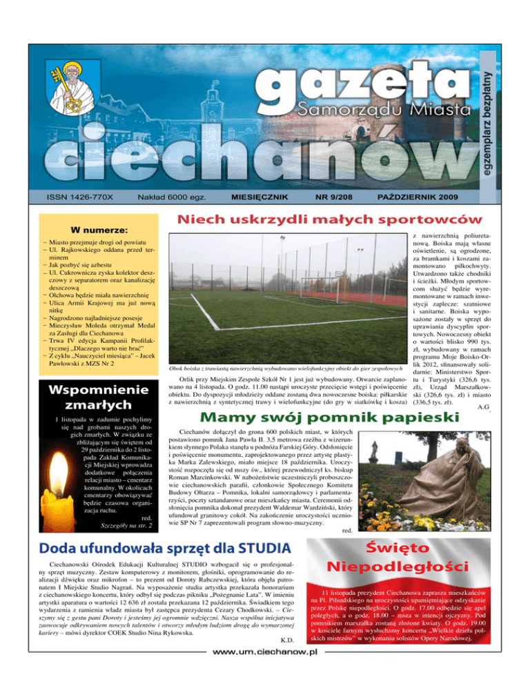 ISSN 1426-770X Nakład 6000 egz. W numerze: – Miasto przejmuje drogi od powiatu – Ul. Rajkowskiego oddana przed terminem – Jak pozbyć się azbestu – Ul. Cukrownicza zyska kolektor deszczowy z separatorem oraz kanalizację deszczową – Olchowa będzie miała nawierzchnię – Ulica Armii Krajowej ma już nową nitkę – Nagrodzono najładniejsze posesje – Mieczysław Moleda otrzymał Medal za Zasługi dla Ciechanowa – Trwa IV edycja Kampanii Profilaktycznej „Dlaczego warto nie brać” – Z cyklu „Nauczyciel miesiąca” – Jacek Pawłowski z MZS Nr 2 Wspomnienie zmarłych 1 listopada w zadumie pochylimy się nad grobami naszych drogich zmarłych. W związku ze zbliżającym się świętem od 29 października do 2 listopada Zakład Komunikacji Miejskiej wprowadza dodatkowe połączenia relacji miasto – cmentarz komunalny. W okolicach cmentarzy obowiązywać będzie czasowa organizacja ruchu. red. Szczegóły na str. 2 MIESIĘCZNIK NR 9/208 PAŹDZIERNIK 2009 Niech uskrzydli małych sportowców Obok boiska z trawiastą nawierzchnią wybudowano wielofunkcyjny obiekt do gier zespołowych Orlik przy Miejskim Zespole Szkół Nr 1 jest już wybudowany. Otwarcie zaplanowano na 4 listopada. O godz. 11.00 nastąpi uroczyste przecięcie wstęgi i poświęcenie obiektu. Do dyspozycji młodzieży oddane zostaną dwa nowoczesne boiska: piłkarskie z nawierzchnią z syntetycznej trawy i wielofunkcyjne (do gry w siatkówkę i kosza) z nawierzchnią poliuretanową. Boiska mają własne oświetlenie, są ogrodzone, za bramkami i koszami zamontowano piłkochwyty. Utwardzono także chodniki i ścieżki. Młodym sportowcom służyć będzie wyremontowane w ramach inwestycji zaplecze: szatniowe i sanitarne. Boiska wyposażone zostały w sprzęt do uprawiania dyscyplin sportowych. Nowoczesny obiekt o wartości blisko 990 tys. zł, wybudowany w ramach programu Moje Boisko-Orlik 2012, sfinansowały solidarnie: Ministerstwo Sportu i Turystyki (326,6 tys. zł), Urząd Marszałkowski (326,6 tys. zł) i miasto (336,5 tys. zł). A.G. Mamy swój pomnik papieski Ciechanów dołączył do grona 600 polskich miast, w których postawiono pomnik Jana Pawła II. 3,5 metrowa rzeźba z wizerunkiem słynnego Polaka stanęła u podnóża Farskiej Góry. Odsłonięcie i poświęcenie monumentu, zaprojektowanego przez artystę plastyka Marka Zalewskiego, miało miejsce 18 października. Uroczystość rozpoczęła się od mszy św., której przewodniczył ks. biskup Roman Marcinkowski. W nabożeństwie uczestniczyli proboszczowie ciechanowskich parafii, członkowie Społecznego Komitetu Budowy Ołtarza – Pomnika, lokalni samorządowcy i parlamentarzyści, poczty sztandarowe oraz mieszkańcy miasta. Ceremonii odsłonięcia pomnika dokonał prezydent Waldemar Wardziński, który ufundował granitowy cokół. Na zakończenie uroczystości uczniowie SP Nr 7 zaprezentowali program słowno-muzyczny. red. Doda ufundowała sprzęt dla STUDIA Ciechanowski Ośrodek Edukacji Kulturalnej STUDIO wzbogacił się o profesjonalny sprzęt muzyczny. Zestaw komputerowy z monitorem, głośniki, oprogramowanie do realizacji dźwięku oraz mikrofon – to prezent od Doroty Rabczewskiej, która objęła patronatem I Miejskie Studio Nagrań. Na wyposażenie studia artystka przekazała honorarium z ciechanowskiego koncertu, który odbył się podczas pikniku „Pożegnanie Lata”. W imieniu artystki aparatura o wartości 12 636 zł została przekazana 12 października. Świadkiem tego wydarzenia z ramienia władz miasta był zastępca prezydenta Cezary Chodkowski. – Cieszymy się z gestu pani Doroty i jesteśmy jej ogromnie wdzięczni. Nasza wspólna inicjatywa zaowocuje odkrywaniem nowych talentów i otworzy młodym ludziom drogę do wymarzonej kariery – mówi dyrektor COEK Studio Nina Rykowska. K.D. Święto Niepodległości 11 listopada prezydent Ciechanowa zaprasza mieszkańców na Pl. Piłsudskiego na uroczystości upamiętniające odzyskanie przez Polskę niepodległości. O godz. 17.00 odbędzie się apel poległych, a o godz. 18.00 – msza w intencji ojczyzny. Pod pomnikiem marszałka zostaną złożone kwiaty. O godz. 19.00 w kościele farnym wysłuchamy koncertu „Wielkie dzieła polskich mistrzów” w wykonaniu solistów Opery Narodowej. www.um.ciechanow.pl 2 INFORMACJE Nowy dyrektor szpitala Od 1 października funkcję dyrektora ciechanowskiego szpitala powierzono Hannie Jaroszewskiej. Decyzję w tej sprawie podjął Zarząd Województwa Mazowieckiego. Pełniąca dotychczas obowiązki dyrektora Małgorzata Turowska wróciła na wcześniejsze stanowisko i jest teraz zastępcą dyrektora do spraw administracyjno-technicznych. Inauguracja w PWSZ 8 października zainaugurowano rok akademicki w Państwowej Wyższej Szkole Zawodowej. Uroczystości rozpoczęła msza św. w kościele farnym, którą koncelebrował ks. Zbigniew Adamowski. Po nabożeństwie władze uczelni wraz ze studentami przeszli ulicami miasta do siedziby szkoły przy ul. Narutowicza. Najlepszym słuchaczom wręczono nagrody za wyniki w nauce. Wykład inauguracyjny „Jak zrobić karierę w szybko zmieniającym się świecie” wygłosił prezes LG Electronics Jang Hyeu Lee. Na koniec wystąpił chór PWSZ. Obradowali członkowie związku „śmieciowego” 15 października obradowało II Zgromadzenie Międzygminnego Związku Regionu Ciechanowskiego. Ustalono kierunki działania Związku, opracowano regulamin organizacyjny Zgromadzenia oraz regulamin pracy Zarządu MZRC i Komisji Rewizyjnej. Spotkanie Młodych „Aby mieli życie i mieli je w obfitości” – pod takim hasłem 7 listopada odbędzie się Spotkanie Młodych z diecezji płockiej. O godz. 10.30 w kościele św. Piotra młodzież będzie uczestniczyć we mszy świętej. Po wspólnej modlitwie nastąpi czuwanie przy relikwiach błogosławionej Karoliny Kózkówny. W programie spotkania znajdzie się konferencja „Bierzcie z życia pełnymi garściami”, którą poprowadzi ks. Piotr Paw