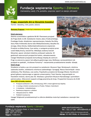 Praga- wspaniałe dni w Ojczyźnie Szwejka! Termin: dowolny, 2 dni, jesień, wiosna Ramowy Program ( może być zmieniony na życzenie) Dzień pierwszy: Zbiórka uczestników o godzinie 06.00. Planowany przyjazd do Pragi około 11.00. Zwiedzanie miasta: placu Hradczańskiego, Praskiego Hradu: dziedziniec reprezentacyjny, Katedra Św.Wita, Stary Pałac Królewski( słynna Sala Władysławowska), Bazylika Św. Jerzego, Złota Uliczka, Daliborka(średniowieczne więzienie). Przejście na Małą Stranę .Czas wolny, a następnie przejście przez rynek Małej Strany, kościół Św. Mikołaja( ulubiony kościół Mozarta), spacer uliczkami dzielnicy ambasad i pałaców. W godzinach wieczornych przejazd do hotelu, zakwaterowanie. Uwaga! Możliwość przejazdu komunikacją miejską do centrum Pragi na wieczorny spacer lub odbycie godzinnego rejsu Wełtawą z przewodnikiem lub przejazd na spektakl „ Krizikowe Fontanny”- niesamowite przedstawienie światło- dźwięk. Dzień drugi: Śniadanie w hotelu a po nim przejazd na zwiedzanie: Muzeum Figur Woskowych, dzielnica żydowska Josefov, zwiedzanie cmentarza żydowskiego i Synagogi, Ratusz Staromiejski- wieża widokowa, Plac Wacława, czas wolny. Popołudniu przejście do Nowego Miasta: Karolinum( gmach główny najstarszego w regionie uniwersytetu), Teatr Stanów, targ pamiątek na Havelskim mieście, słynny plac Św. Wacława z gmachem Muzeum Narodowego i pomnikiem patrona placu. Wieczorem wyjazd w drogę powrotną do kraju. Przyjazd do Cieszyna ok.23.00 Cena 290 zł/osoby zawiera: Przejazd autokarem z WC, klimatyzacją, DVD z miast aglomeracji śląskiej 1 nocleg w hotelu turystycznym w Pradze. Pokoje z łazienkami 1 śniadanie, 1 obiadokolacja Realizacja programu z pilotem Ubezpieczenie KL i NNW Podatek turystyczny Uwaga! Większość przedstawionych w ofercie obiektów może być zwiedzana z zewnątrz bez opłat.