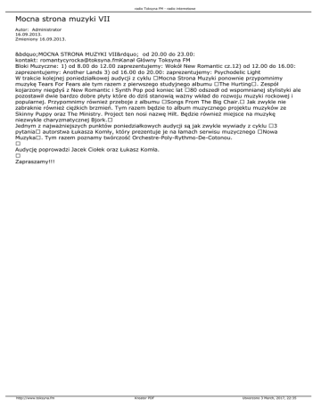 radio Toksyna FM - radio internetowe Mocna strona muzyki VII Autor: Administrator 16.09.2013. Zmieniony 16.09.2013. „MOCNA STRONA MUZYKI VII” od 20.00 do 23.00: kontakt: [email protected]ł Główny Toksyna FM Bloki Muzyczne: 1) od 8.00 do 12.00 zaprezentujemy: Wokół New Romantic cz.12) od 12.00 do 16.00: zaprezentujemy: Another Lands 3) od 16.00 do 20.00: zaprezentujemy: Psychodelic Light W trakcie kolejnej poniedziałkowej audycji z cyklu Mocna Strona Muzyki ponownie przypomnimy muzykę Tears For Fears ale tym razem z pierwszego studyjnego albumu The Hurting. Zespół kojarzony niegdyś z New Romantic i Synth Pop pod koniec lat 80 odszedł od wspomnianej stylistyki ale pozostawił dwie bardzo dobre płyty które do dziś stanowią ważny wkład do rozwoju muzyki rockowej i popularnej. Przypomnimy również przeboje z albumu Songs From The Big Chair. Jak zwykle nie zabraknie również ciężkich brzmień. Tym razem będzie to album muzycznego projektu muzyków ze Skinny Puppy oraz The Ministry. Project ten nosi nazwę Hilt. Będzie również miejsce na muzykę niezwykle charyzmatycznej Bjork. Jednym z najważniejszych punktów poniedziałkowych audycji są jak zwykle wywiady z cyklu 3 pytania autorstwa Łukasza Komły, który prezentuje je na łamach serwisu muzycznego Nowa Muzyka. Tym razem poznamy twórczość Orchestre-Poly-Rythmo-De-Cotonou. Audycję poprowadzi Jacek Ciołek oraz Łukasz Komła. Zapraszamy!!! http://www.toksyna.fm Kreator PDF Utworzono 3 March, 2017, 22:35