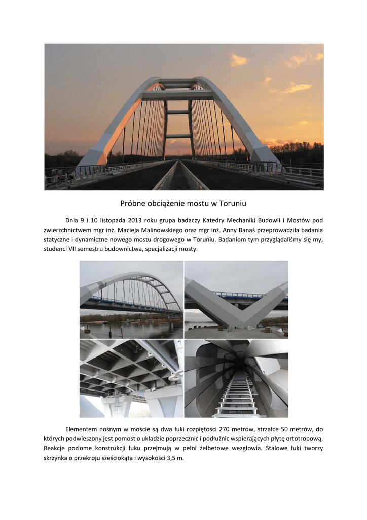 Próbne obciążenie mostu w Toruniu Dnia 9 i 10 listopada 2013 roku grupa badaczy Katedry Mechaniki Budowli i Mostów pod zwierzchnictwem mgr inż. Macieja Malinowskiego oraz mgr inż. Anny Banaś przeprowadziła badania statyczne i dynamiczne nowego mostu drogowego w Toruniu. Badaniom tym przyglądaliśmy się my, studenci VII semestru budownictwa, specjalizacji mosty. Elementem nośnym w moście są dwa łuki rozpiętości 270 metrów, strzałce 50 metrów, do których podwieszony jest pomost o układzie poprzecznic i podłużnic wspierających płytę ortotropową. Reakcje poziome konstrukcji łuku przejmują w pełni żelbetowe wezgłowia. Stalowe łuki tworzy skrzynka o przekroju sześciokąta i wysokości 3,5 m. Badania statyczne przeprowadzono w sobotę, w niezbyt przyjemnych warunkach atmosferycznych. Niestety padało, momentami dosyć intensywnie. Na szczęście nie wpłynęło to na dobre humory i przyjemną pracę uczestników pomiarów. Pomiary ugięcia przeprowadzono za pomocą urządzeń geodezyjnych z bazami pomiarowymi (lusterka geodezyjne) oddalonymi co 10 m, zgodnie z rozstawem wieszaków. Pojazdy obciążające konstrukcje, każdy o masie 33,8 t, ustawiano w czterech kolumnach na dwóch jezdniach, w miejscach wywołujących największe ugięcia konstrukcji. Podczas ustawiania każdej kolumny dokonywano pomiaru ugięcia. Pomiarów tych oczywiście dokonywali geodeci, ale my mieliśmy również w tym swój czynny udział. Mianowicie zadaniem naszym było delikatne odsłanianie, za każdym pomiarem, kolejno wszystkich lusterek geodezyjnych, by umożliwić wykonanie pomiaru. Praca w sumie banalna, przypomniała nam jak to jest pokonać kilka‐ kilkanaście kilometrów w ciągu dnia i ochroniła nas przed zmarznięciem. Po określonym czasie pojazdy zjeżdżały w odwrotnej kolejności. Po zjeździe każdej następnej kolumny pomiary przeprowadzano powtórnie. Celem takiego obciążania konstrukcji w czasie było uzyskanie ugięć sprężystych i trwałych. Obliczone ugięcie mostu wynosiło 120,3 mm, tymczasem pomierzone ugięcie konstrukcji wynosiło 120,5 mm, wyniki wskazują na 100% zgodność przeprowadzania obliczeń, co wywołało ogromny uśmiech na naszych twarzach, a także grupy badaczy. Niedzielny pogodny poranek, zaczęto od pomiarów dynamicznych. Przejazd pojazdów odbywał się z prędkościami 10, 20 i 30 km/h. Kierowcy mieli za zadanie przejechać przez próg o wysokości 10 cm, wykonać gwałtowne hamowanie w ściśle określonym miejscu oraz dokonać przejazdów swobodnych. Przejazdy odbywały się w dwóch kolumnach i dwóch rzędach, na jednej jezdni. Monitorowanie odkształceń przeprowadzono za pomocą czujników indukcyjnych. Największe drgania odczuwaliśmy dla najniższych prędkości i były one wyraźnie widoczne na całej konstrukcji, m.in. na wieszakach i barierkach. W przypadku hamowania, stojąc na moście, drgania nie były tak bardzo odczuwalne. Z przejazdami swobodnymi spotykamy się na co dzień, więc nie było to dla nas czymś nowym. Samych prób obciążeniowych było trochę więcej, gdyż nie jest łatwo idealnie zsynchronizować jazdy czterech 30‐tonowych ciężarówek, dlatego niektóre przejazdy trzeba było powtarzać, aby uzyskać miarodajne wyniki. Naprężenia elementów mostu sprawdzano odmierzając odkształcenia w blisko 40 tensometrach. Duża część z nich znajdowała się wewnątrz wezgłowiów. Jest to interesujące miejsce kontrukcji, ze względu na charakter pracy i naprężenia w nim występujące. Element ten był już wcześniej monitorowany w czasie montażu łuków i budowy pomostu. Było to trudne zadanie inżynieryjne, wymagające wysokiej precyzji wykonywania prac. Dodatkową atrakcją dla nas była możliwość przejścia przez wnętrze jednego z łuków. Ok.20‐ osobowa grupa przeszła przez całą długość łuku, wychodząc na sztuczną wyspę przy środkowej podporze. Wycieczkę urozmaicała kompletna ciemność we wnętrzu łuku oraz brak pojedynczych schodów na trasie. Na szczęście obyło się bez ofiar. Całe wydarzenie, oprócz tego, że było dla nas dużą atrakcją, pozwoliło zapoznać się dokładniej z konstrukcją mostu. Mieliśmy okazję zobaczyć z bliska rozwiązania konstrukcyjne, o których słyszymy na wykładach oraz poznaliśmy szczegóły skomplikowanego procesu montażu łuków mostu. Czynne uczestnictwo w takich badaniach było dla nas bardzo wartościowym doświadczeniem, bo jako jedni z nielicznych mogliśmy uczestniczyć w badaniach największego mostu łukowego w Polsce. Swoje poczynania studenci z zadowoleniem udokumentowali w zawartych poniżej zdjęciach. Autorzy: Krystyna Kantorska, Klaudia Kawska, Maciej Klecha, Tomasz Skiba