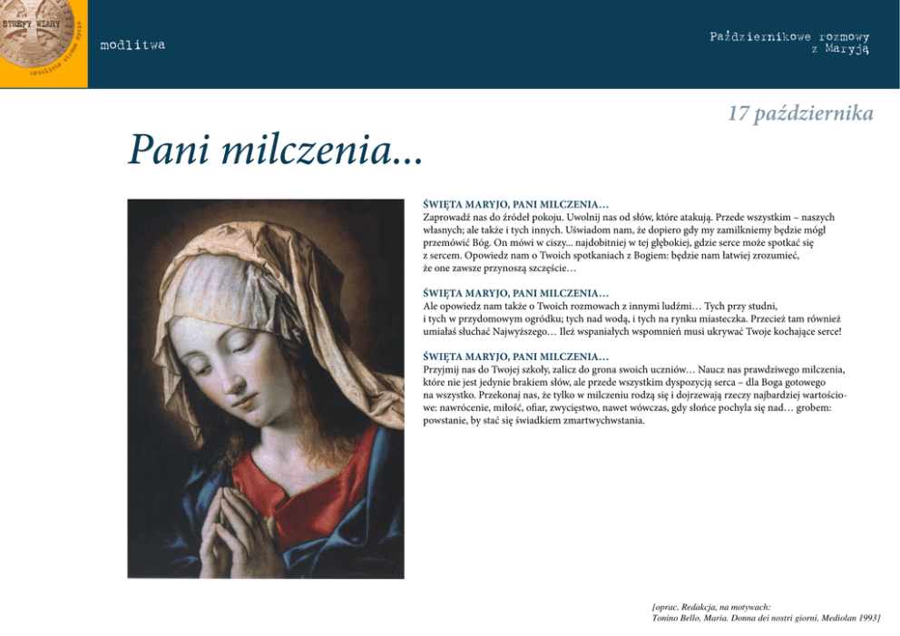 , Pazdziernikowe rozmowy z Maryja, modlitwa Pani milczenia... 17 października Święta Maryjo, pani MILCZENIA… Zaprowadź nas do źródeł pokoju. Uwolnij nas od słów, które atakują. Przede wszystkim – naszych własnych; ale także i tych innych. Uświadom nam, że dopiero gdy my zamilkniemy będzie mógł przemówić Bóg. On mówi w ciszy... najdobitniej w tej głębokiej, gdzie serce może spotkać się z sercem. Opowiedz nam o Twoich spotkaniach z Bogiem: będzie nam łatwiej zrozumieć, że one zawsze przynoszą szczęście… Święta Maryjo, pani MILCZENIA… Ale opowiedz nam także o Twoich rozmowach z innymi ludźmi… Tych przy studni, i tych w przydomowym ogródku; tych nad wodą, i tych na rynku miasteczka. Przecież tam również umiałaś słuchać Najwyższego… Ileż wspaniałych wspomnień musi ukrywać Twoje kochające serce! Święta Maryjo, pani MILCZENIA… Przyjmij nas do Twojej szkoły, zalicz do grona swoich uczniów… Naucz nas prawdziwego milczenia, które nie jest jedynie brakiem słów, ale przede wszystkim dyspozycją serca – dla Boga gotowego na wszystko. Przekonaj nas, że tylko w milczeniu rodzą się i dojrzewają rzeczy najbardziej wartościowe: nawrócenie, miłość, ofiar, zwycięstwo, nawet wówczas, gdy słońce pochyla się nad… grobem: powstanie, by stać się świadkiem zmartwychwstania. [oprac. Redakcja, na motywach: Tonino Bello, Maria. Donna dei nostri giorni, Mediolan 1993]