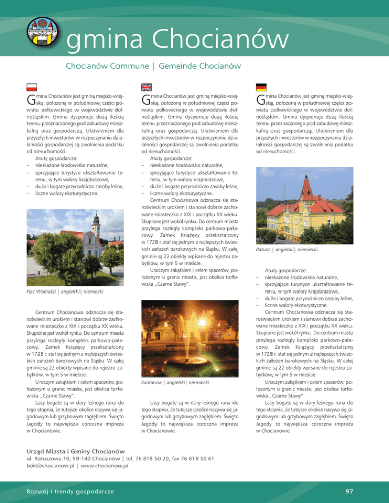 gmina Chocianów Chocianów Commune | Gemeinde Chocianów mina Chocianów jest gminà miejsko-wiejskà, poło˝onà w południowej cz´Êci powiatu polkowickiego w województwie dolnoÊlàskim. Gmina dysponuje du˝à iloÊcià terenu przeznaczonego pod zabudow´ mieszkalnà oraz gospodarczà. Ułatwieniem dla przyszłych inwestorów w rozpoczynaniu działalnoÊci gospodarczej sà zwolnienia podatku od nieruchomoÊci. Atuty gospodarcze: – nieska˝one Êrodowisko naturalne, – sprzyjajàce turystyce ukształtowanie terenu, w tym walory krajobrazowe, – du˝e i bogate przyrodniczo zasoby leÊne, – liczne walory ekoturystyczne. G mina Chocianów jest gminà miejsko-wiejskà, poło˝onà w południowej cz´Êci powiatu polkowickiego w województwie dolnoÊlàskim. Gmina dysponuje du˝à iloÊcià terenu przeznaczonego pod zabudow´ mieszkalnà oraz gospodarczà. Ułatwieniem dla przyszłych inwestorów w rozpoczynaniu działalnoÊci gospodarczej sà zwolnienia podatku od nieruchomoÊci. Atuty gospodarcze: – nieska˝one Êrodowisko naturalne, – sprzyjajàce turystyce ukształtowanie terenu, w tym walory krajobrazowe, – du˝e i bogate przyrodniczo zasoby leÊne, – liczne walory ekoturystyczne. Centrum Chocianowa odznacza si´ staroÊwieckim urokiem i stanowi dobrze zachowane miasteczko z XIX i poczàtku XX wieku. Skupione jest wokół rynku. Do centrum miasta przylega rozległy kompleks parkowo-pałacowy. Zamek Ksià˝´cy przekształcony w 1728 r. stał si´ jednym z najlepszych Êwieckich zało˝eƒ barokowych na Âlàsku. W całej gminie sà 22 obiekty wpisane do rejestru zabytków, w tym 5 w mieÊcie. Uroczym zakàtkiem i celem spacerów, poło˝onym u granic miasta, jest okolica torfowiska „Czarne Stawy”. G Plac WolnoÊci | angielski| niemiecki Centrum Chocianowa odznacza si´ staroÊwieckim urokiem i stanowi dobrze zachowane miasteczko z XIX i poczàtku XX wieku. Skupione jest wokół rynku. Do centrum miasta przylega rozległy kompleks parkowo-pałacowy. Zamek Ksià˝´cy przekształcony w 1728 r. stał si´ jednym z najlepszych Êwieckich zało˝eƒ barokowych na Âlàsku. W całej gminie sà 22 obiekty wpisane do rejestru zabytków, w tym 5 w mieÊcie. Uroczym zakàtkiem i celem spacerów, poło˝onym u granic miasta, jest okolica torfowiska „Czarne Stawy”. Lasy bogate sà w dary leÊnego runa do tego stopnia, ˝e tutejsze okolice nazywa si´ jagodowym lub grzybowym zagł´biem. Âwi´to Jagody to najwi´ksza coroczna impreza w Chocianowie. Fontanna | angielski| niemiecki Lasy bogate sà w dary leÊnego runa do tego stopnia, ˝e tutejsze okolice nazywa si´ jagodowym lub grzybowym zagł´biem. Âwi´to Jagody to najwi´ksza coroczna impreza w Chocianowie. mina Chocianów jest gminà miejsko-wiejskà, poło˝onà w południowej cz´Êci powiatu polkowickiego w województwie dolnoÊlàskim. Gmina dysponuje du˝à iloÊcià terenu przeznaczonego pod zabudow´ mieszkalnà oraz gospodarczà. Ułatwieniem dla przyszłych inwestorów w rozpoczynaniu działalnoÊci gospodarczej sà zwolnienia podatku od nieruchomoÊci. G Ratusz | angielski| niemiecki Atuty gospodarcze: nieska˝one Êrodowisko naturalne, sprzyjajàce turystyce ukształtowanie terenu, w tym walory krajobrazowe, – du˝e i bogate przyrodniczo zasoby leÊne, – liczne walory ekoturystyczne. Centrum Chocianowa odznacza si´ staroÊwieckim urokiem i stanowi dobrze zachowane miasteczko z XIX i poczàtku XX wieku. Skupione jest wokół rynku. Do centrum miasta przylega rozległy kompleks parkowo-pałacowy. Zamek Ksià˝´cy przekształcony w 1728 r. stał si´ jednym z najlepszych Êwieckich zało˝eƒ barokowych na Âlàsku. W całej gminie sà 22 obiekty wpisane do rejestru zabytków, w tym 5 w mieÊcie. Uroczym zakàtkiem i celem spacerów, poło˝onym u granic miasta, jest okolica torfowiska „Czarne Stawy”. Lasy bogate sà w dary leÊnego runa do tego stopnia, ˝e tutejsze okolice nazywa si´ jagodowym lub grzybowym zagł´biem. Âwi´to Jagody to najwi´ksza coroczna impreza w Chocianowie. – – Urzàd Miasta i Gminy Chocianów ul. Ratuszowa 10, 59-140 Chocianów | tel. 76 818 50 20, fax 76 818 50 61 [email protected] | www.chocianow.pl Rozwój i trendy gospodarcze 97