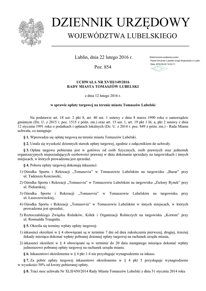 DZIENNIK URZĘDOWY WOJEWÓDZTWA LUBELSKIEGO Lublin, dnia 22 lutego 2016 r. Elektronicznie podpisany przez: Paweł Chruściel; Lubelski Urząd Wojewódzki w Lublinie Data: 2016-02-22 14:23:11 Poz. 854 UCHWAŁA NR XVIII/149/2016 RADY MIASTA TOMASZÓW LUBELSKI z dnia 12 lutego 2016 r. w sprawie opłaty targowej na terenie miasta Tomaszów Lubelski Na podstawie art. 18 ust. 2 pkt 8, art. 40 ust. 1 ustawy z dnia 8 marca 1990 roku o samorządzie gminnym (Dz. U. z 2015 r. poz. 1515 z późn. zm.) oraz art. 15 ust. 1, art. 19 pkt 1 lit. a, pkt 2 ustawy z dnia 12 stycznia 1991 roku o podatkach i opłatach lokalnych (Dz. U. z 2014 r. poz. 849 z późn. zm.) - Rada Miasta uchwala, co następuje: § 1. Wprowadza się opłatę targową na terenie miasta Tomaszów Lubelski. § 2. Ustala się wysokość dziennych stawek opłaty targowej, zgodnie z załącznikiem do uchwały. § 3. Opłata targowa pobierana jest w gotówce od osób fizycznych, osób prawnych oraz jednostek organizacyjnych nieposiadających osobowości prawnej w dniu dokonania sprzedaży na targowiskach i innych miejscach, w których prowadzona jest sprzedaż. § 4. Poboru opłaty targowej dokonują inkasenci: 1) Ośrodka Sportu i Rekreacji „Tomasovia” w Tomaszowie Lubelskim na targowisku „Bazar” przy ul. Tadeusza Kościuszki, 2) Ośrodka Sportu i Rekreacji „Tomasovia” w Tomaszowie Lubelskim na targowisku „Zielony Rynek” przy ul. Piekarskiej, 3) Ośrodka Sportu i ul. Łaszczowieckiej, Rekreacji „Tomasovia” w Tomaszowie Lubelskim na targowisku przy 4) Ośrodka Sportu i Rekreacji „Tomasovia” w Tomaszowie Lubelskim w innych miejscach, w których prowadzona jest sprzedaż, 5) Roztoczańskiego Związku Rolników, Kółek i Organizacji Rolniczych na targowisku „Kortom” przy ul. Romualda Traugutta. § 5. Określa się terminy wpłaty opłaty targowej: 1) inkasenci określeni w § 4 obowiązani są w terminie 7 dni od dnia zakończenia pierwszej, drugiej, trzeciej dekady miesiąca dokonać wpłaty pobranej dziennej opłaty targowej na rachunek urzędu miasta, 2) inkasenci określeni w § 4 obowiązani są w terminie do 20 dnia następnego miesiąca dokonać wpłaty jednorazowo pobranej opłaty targowej na rachunek urzędu miasta. § 6. Inkasentowi określonemu w § 4 pkt 1-4 nie przysługuje wynagrodzenie za inkaso. § 7. Za pobór opłaty targowej inkasentowi określonemu w § 4 pkt 5 przysługuje wynagrodzenie w wysokości 50% od kwoty pobieranej opłaty. § 8. Traci moc uchwała Nr XLII/450/2014 Rady Miasta Tomaszów Lubelski z dnia 31 stycznia 2014 roku Dziennik Urzędowy Województwa Lubelskiego –2– Poz. 854 _______________________________________________________________________________________________________________ w sprawie określenia dziennych stawek opłaty targowej, zasad ustalania i poboru oraz terminów płatności tej opłaty. § 9. Wykonanie uchwały powierza się Burmistrzowi Miasta. § 10. Uchwała podlega ogłoszeniu w Dzienniku Urzędowym Województwa Lubelskiego i wchodzi w życie po upływie 14 dni od dnia ogłoszenia. Przewodniczący Rady Miasta Mirosław Fus Dziennik Urzędowy Województwa Lubelskiego –3– Poz. 854 _______________________________________________________________________________________________________________ Załącznik do Uchwały Nr XVIII/149/2016 Rady Miasta Tomaszów Lubelski z dnia 12 lutego 2016 r. I. Targowisko zwierzęce przy ul. Łaszczowieckiej: 1. a) b) c) 2. 3. 4. Przy sprzedaży od każdej wystawionej na sprzedaż sztuki: konie bydło i jałowizna trzoda chlewna, źrebięta, cielęta, owce, kozy Przy sprzedaży z wozu konnego (od wozu) płodów rolnych Przy sprzedaży z samochodu, platformy, przyczepy Przy sprzedaży z samochodu dostawczego do 2,5 tony 15,00 zł 15,00 zł 3,00 zł 17,00 zł 39,00 zł 33,00 zł II. Targowiska: „Zielony Rynek” przy ul. Piekarskiej, „Kortom” przy ul. Romualda Traugutta 1. Przy sprzedaży z podręcznej torby, siatki, koszyka, wiadra itp. 1,00 zł 2. Przy sprzedaży z wózka ręcznego, skrzynki 3,00 zł 3. Przy sprzedaży towarów ze stolika, łóżka polowego, stołu, straganu o wymiarach długości 2 m, szerokości 1 m 14,00 zł 4. Przy sprzedaży ze stołów, straganów o wymiarach długości 3 m, szerokości 1 m 17,00 zł 5. Przy sprzedaży owoców, warzyw, krzewów, sadzonek, itp. za 1 m2 zajętej powierzchni 3,00 zł 6. Przy sprzedaży towarów z: a) samochodu osobowego lub przyczepy campingowej 33,00 zł b) samochodu ciężarowego i innych pojazdów 40,00 zł c) samochodu dostawczego 33,00 zł d) nadwozia przyczepy campingowej nie mającej możliwości przemieszczania się 17,00 zł 7. Ze stanowiska handlowego zabudowanego o powierzchni 1) poniżej 4,00 m2 7,00 zł 2 2) od 4 m do 4,99 m2 8,00 zł 3) od 5 m2 do 5,99 m2 9,00 zł 2 2 4) od 6 m do 6,99 m 11,00 zł 5) od 7 m2 do 7,99 m2 12,00 zł 6) od 8 m2 do 8,99 m2 14,00 zł 7) od 9 m2 do 9,99 m2 16,00 zł 8) od 10 m2 do 10,99 m2 18,00 zł 9) od 11 m2 do 11,99 m2 20,00 zł 2 2 10) od 12 m do 12,99 m 21,00 zł 11) od 13 m2 do 13,99 m2 23,00 zł za każdy następny rozpoczęty m2 zajętej powierzchni opłata wzrasta o 1,00 zł 8. Dopuszcza się możliwość dokonania zapłaty opłaty targowej wymienionej w punkcie 7 jednorazowo za dany miesiąc proporcjonalnie do liczby dni, w których odbywała się sprzedaż do 10 dnia następnego miesiąca w kasie Ośrodka Sportu i Rekreacji „Tomasovia”. III. Targowisko „Bazar” przy ul. Tadeusza Kościuszki 1. 2. 3. 4. a) b) c) d) 5. 6. Przy sprzedaży z podręcznej torby, siatki, koszyka, wiadra itp. Przy sprzedaży z wózka ręcznego, skrzynki Przy sprzedaży towarów ze stolika, łóżka polowego, stołu, straganu Przy sprzedaży towarów z: samochodu osobowego lub przyczepy campingowej samochodu ciężarowego i innych pojazdów samochodu dostawczego nadwozia przyczepy campingowej nie mającej możliwości przemieszczania się Przy sprzedaży towarów z placu targowiska za 1 m2 zajętej powierzchni Ze stanowiska handlowe