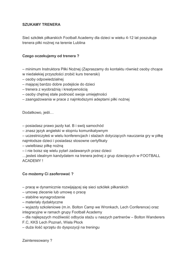 SZUKAMY TRENERA Sieć szkółek piłkarskich Football Academy dla dzieci w wieku 4-12 lat poszukuje trenera piłki nożnej na terenie Lublina Czego oczekujemy od trenera ? – minimum Instruktora Piłki Nożnej (Zapraszamy do kontaktu również osoby chcące w niedalekiej przyszłości zrobić kurs trenerski) – osoby odpowiedzialnej – mającej bardzo dobre podejście do dzieci – trenera z wyobraźnią i kreatywnością – osoby chętnej stale podnosić swoje umiejętności – zaangażowania w prace z najmłodszymi adeptami piłki nożnej Dodatkowo, jeśli… – posiadasz prawo jazdy kat. B i swój samochód – znasz język angielski w stopniu komunikatywnym – uczestniczyłeś w wielu konferencjach i stażach dotyczących nauczania gry w piłkę najmłodsze dzieci i posiadasz stosowne certyfikaty – uwielbiasz piłkę nożną – i nie boisz się wielu pytań zadawanych przez dzieci …jesteś idealnym kandydatem na trenera jednej z grup dziecięcych w FOOTBALL ACADEMY ! Co możemy Ci zaoferować ? – pracę w dynamicznie rozwijającej się sieci szkółek piłkarskich – umowę zlecenie lub umowę o pracę – stabilne wynagrodzenie – materiały dydaktyczne – wyjazdy szkoleniowe (m.in. Bolton Camp we Wronkach, Lech Conference) oraz integracyjne w ramach grupy Football Academy – dla najlepszych możliwość odbycia stażu u naszych partnerów – Bolton Wanderers F.C, KKS Lech Poznań, Wisła Płock – duża ilość sprzętu do dyspozycji na treningu Zainteresowany ? Wyślij CV wraz ze zdjęciem z dopiskiem LUBLIN. List motywacyjny mile widziany. Odezwiemy się do wybranych osób. [email protected]